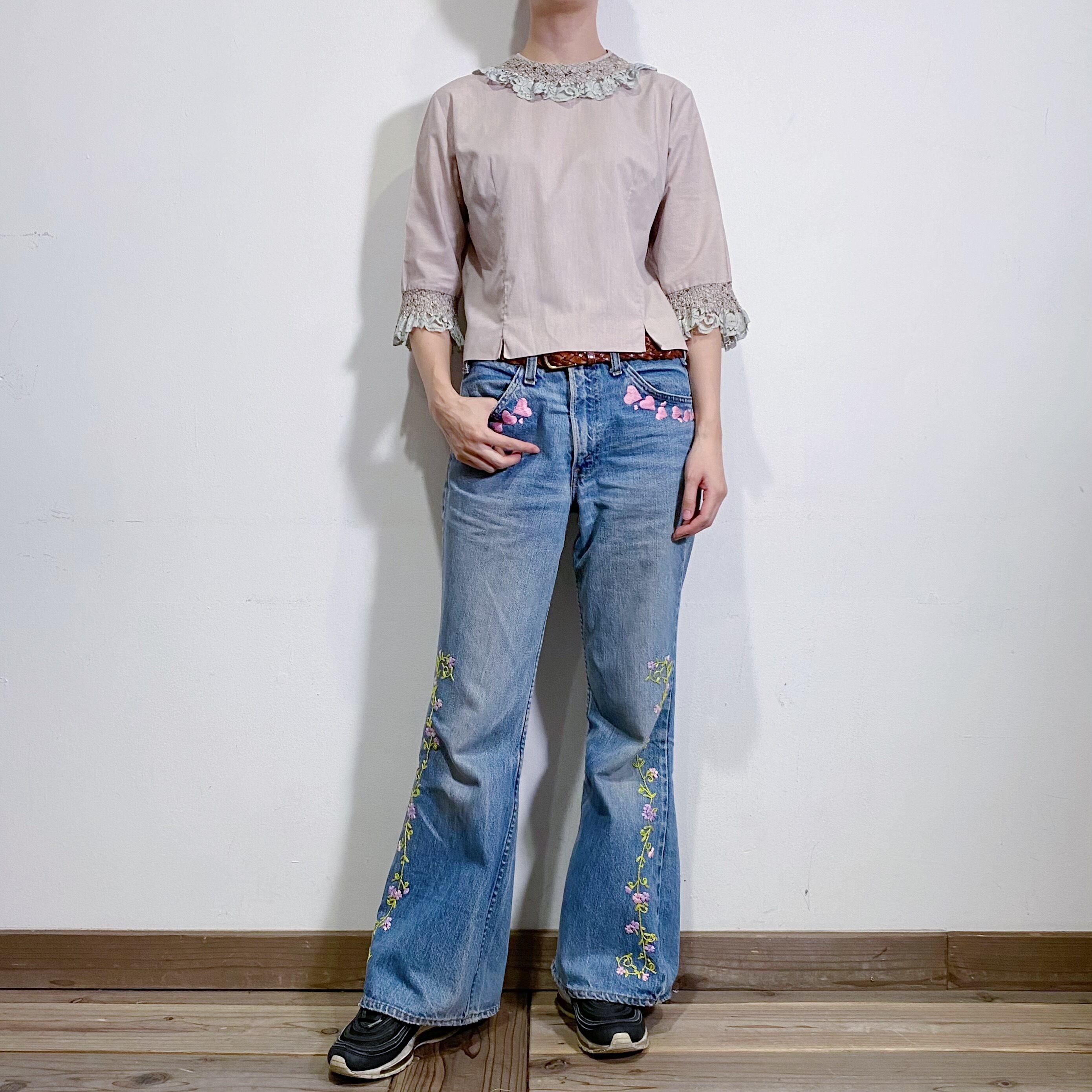首回りと袖口回りのレース使いがとってもキュートな、70年代のブラウスです。
