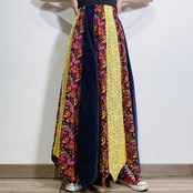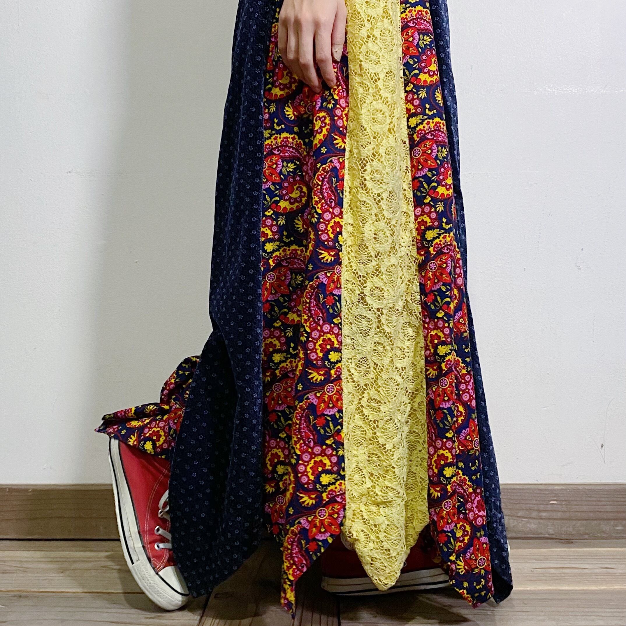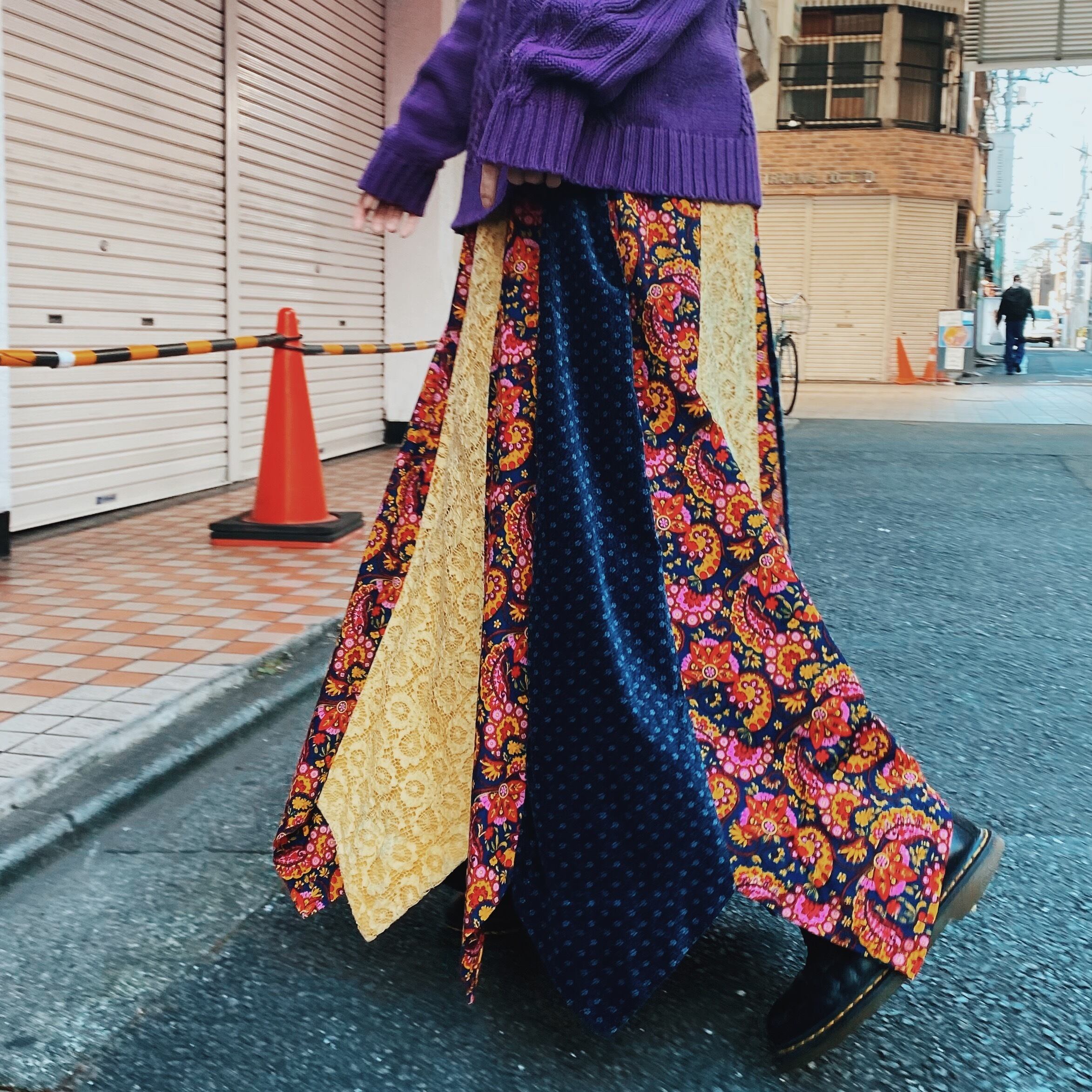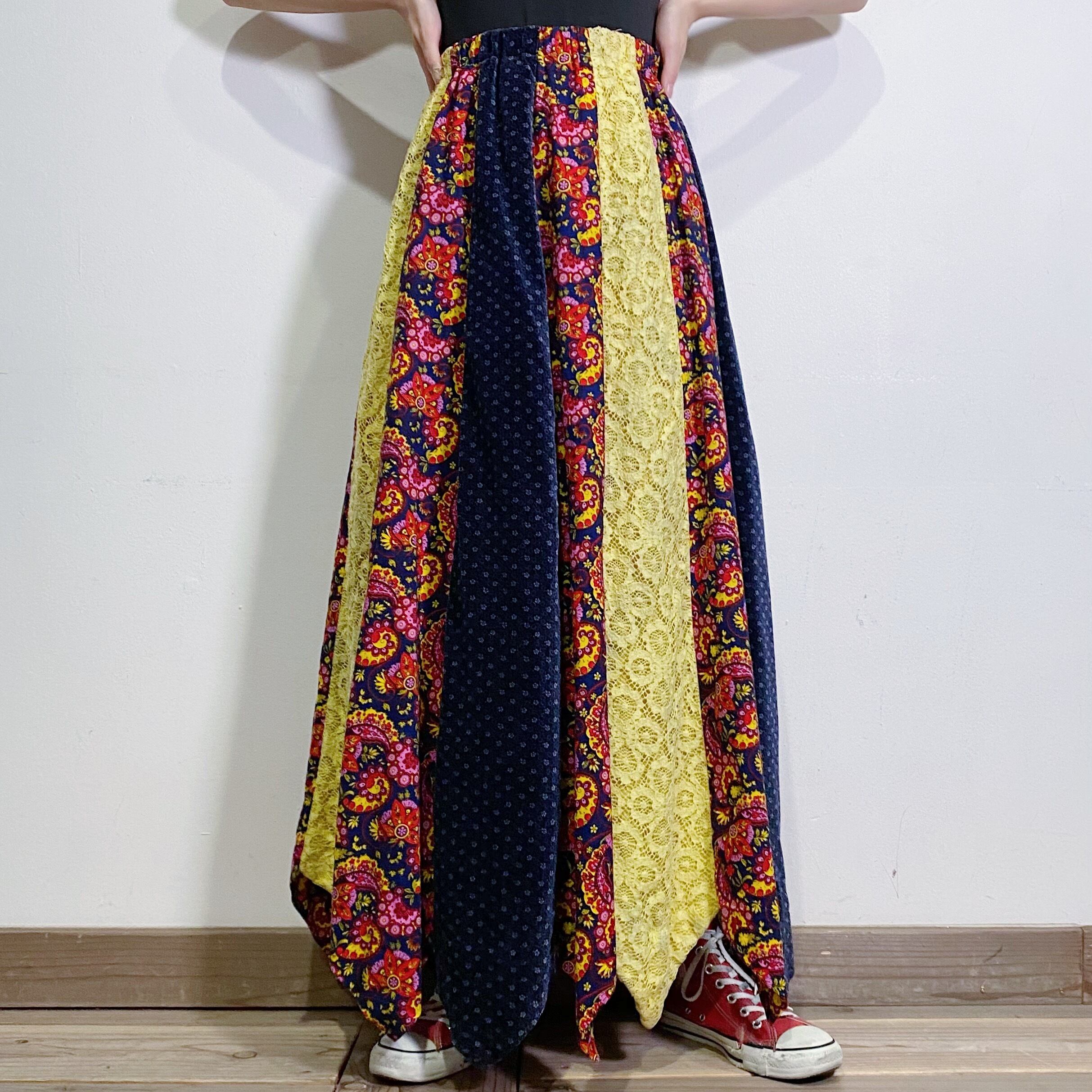ベロアやレースなど異なる素材と柄のパッチワークが可愛い、70年代のスカートです。