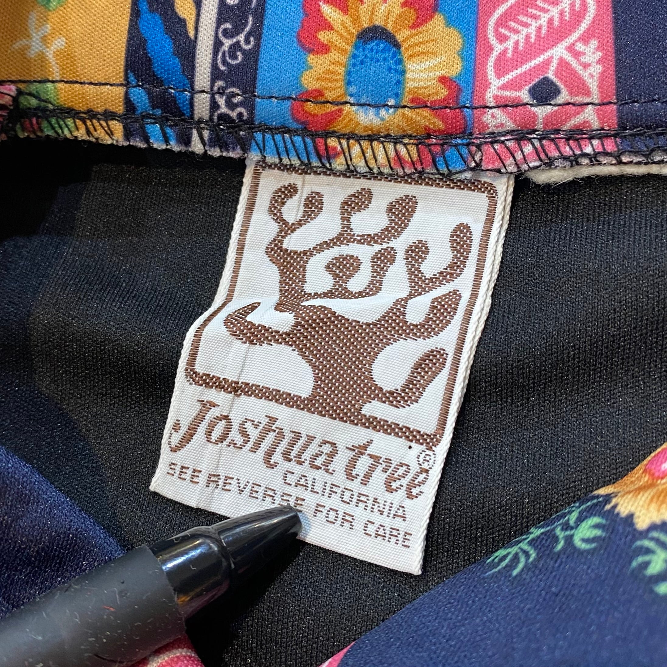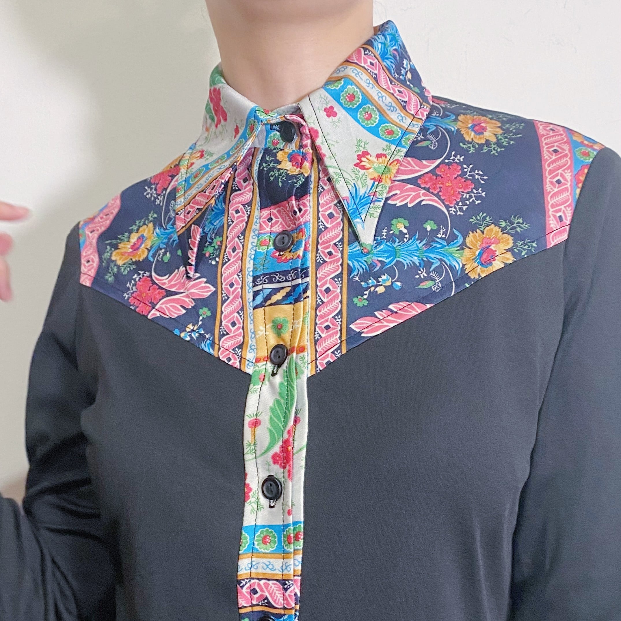 ブラックベースにカラフルで華やかな花柄の切り替えが可愛い、70年代のシャツです。