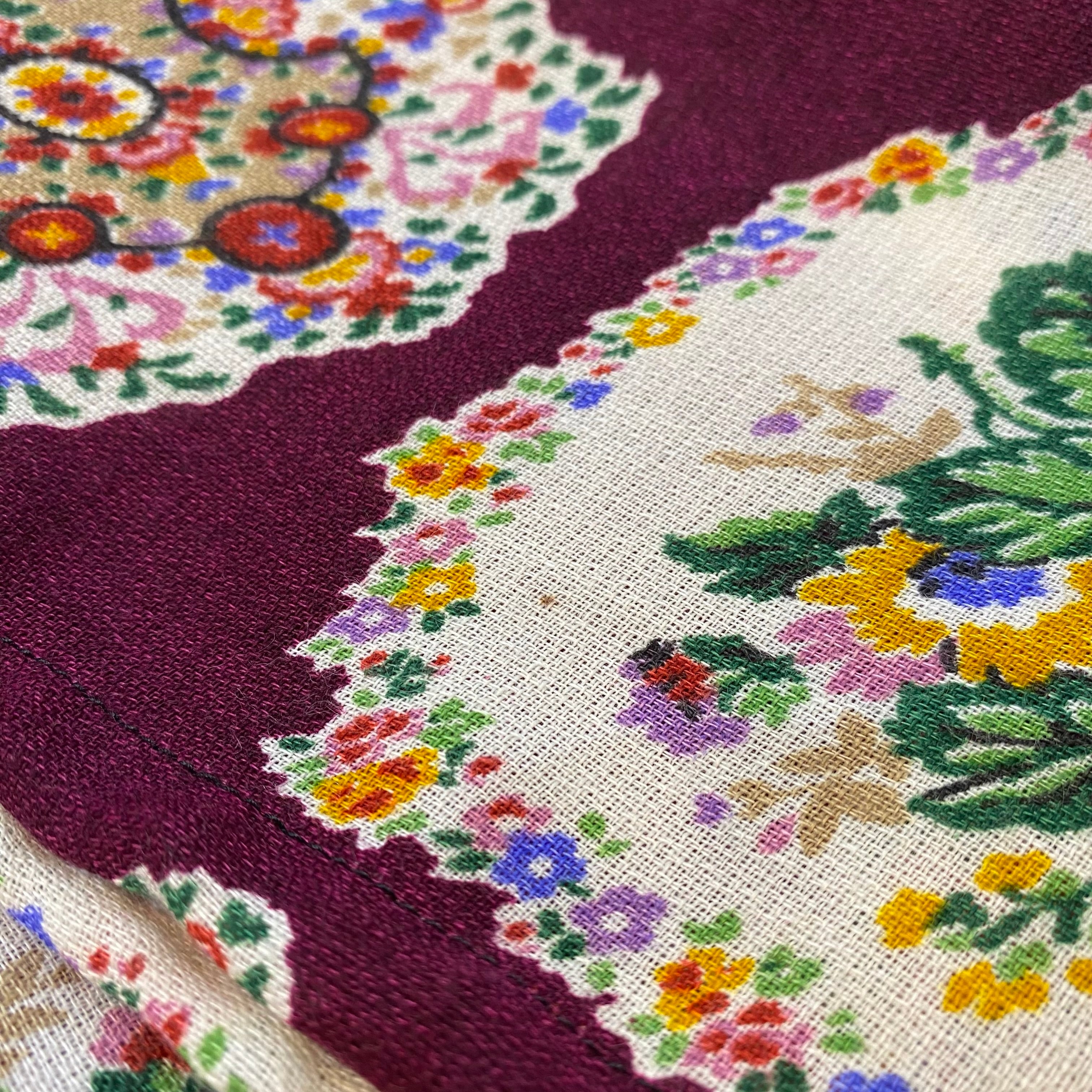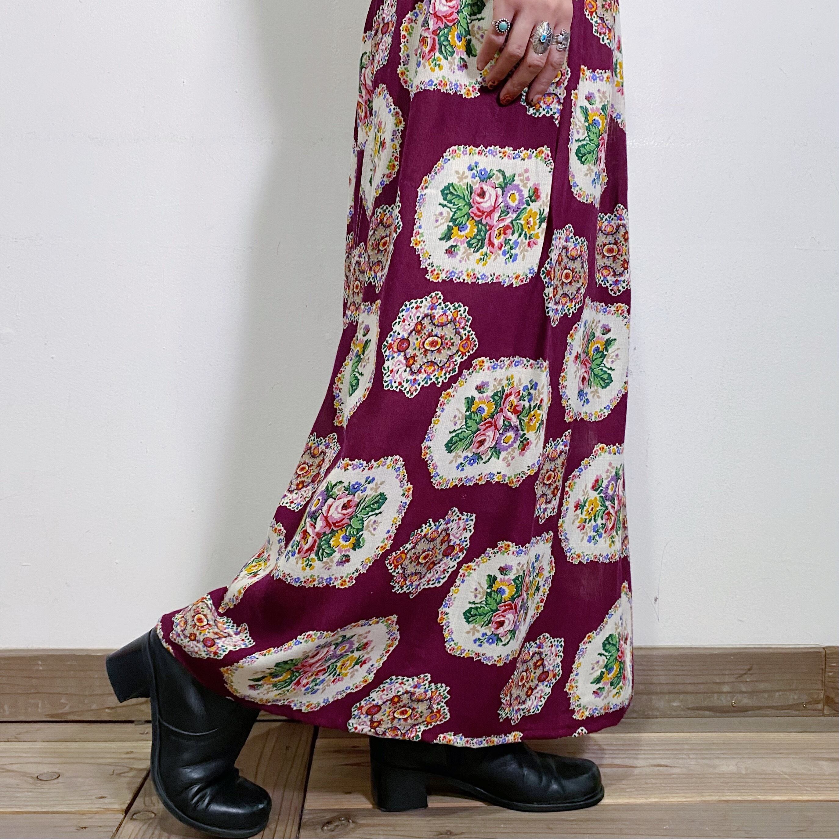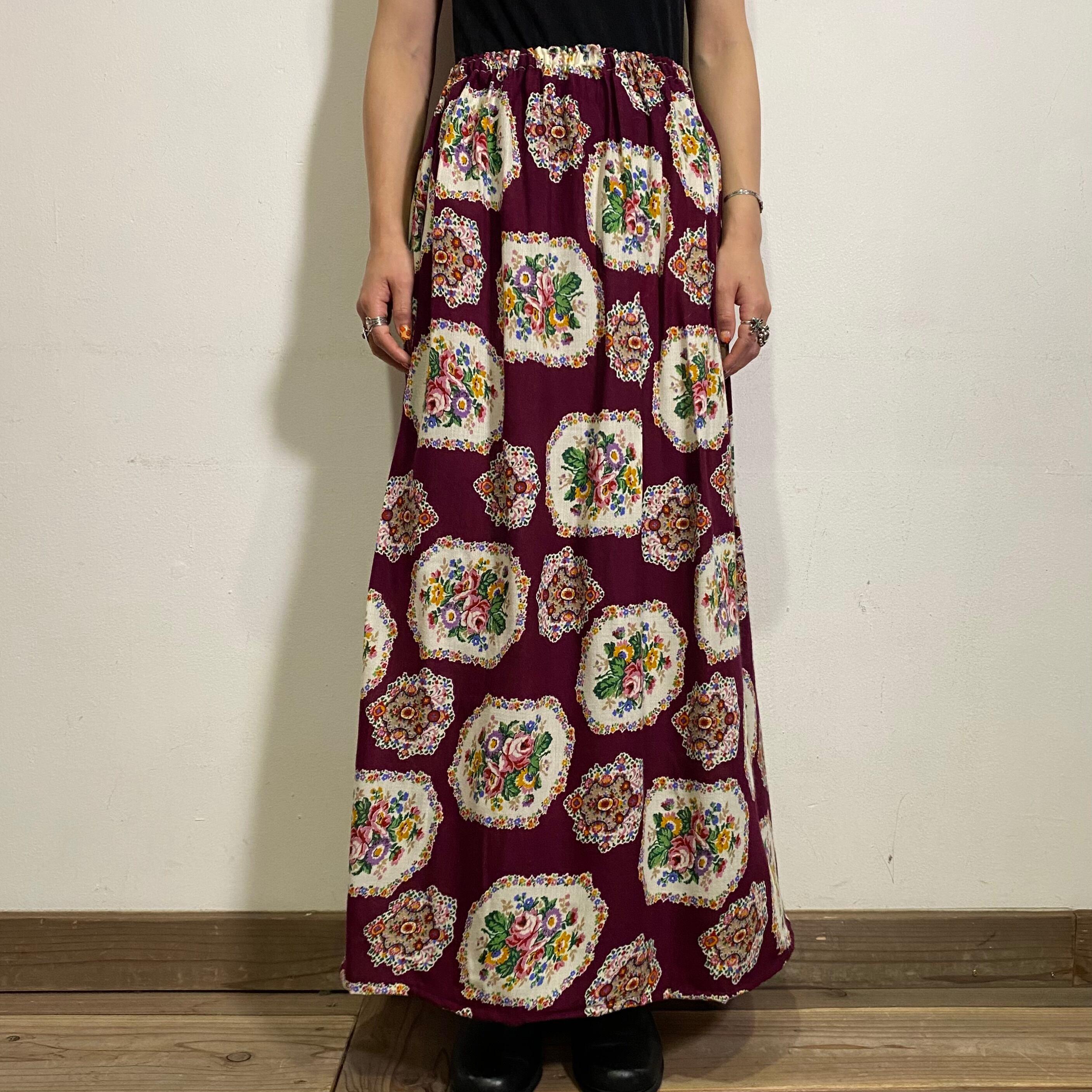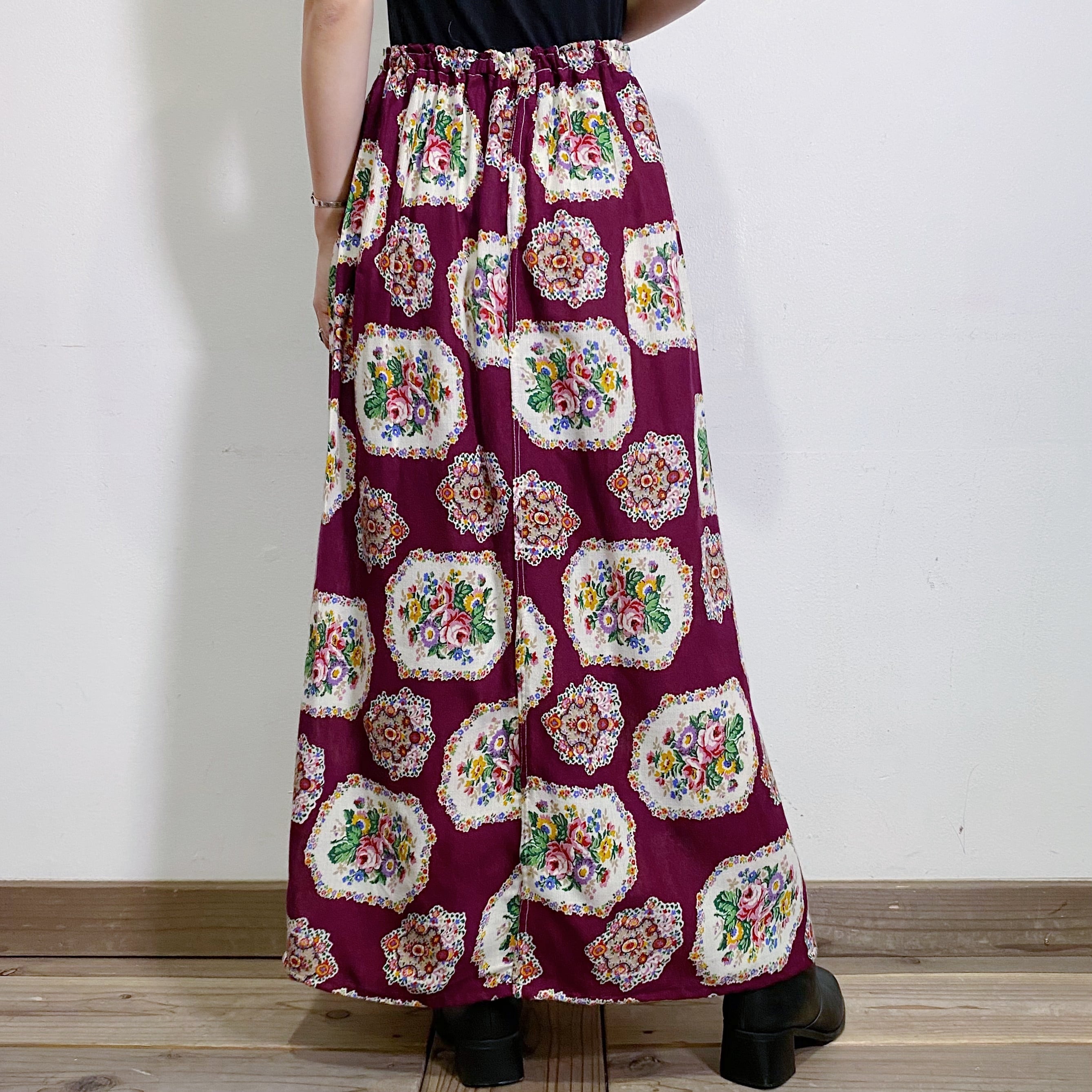 こっくりとしたワインレッド地が大人可愛い、70年代の花柄スカートです。
