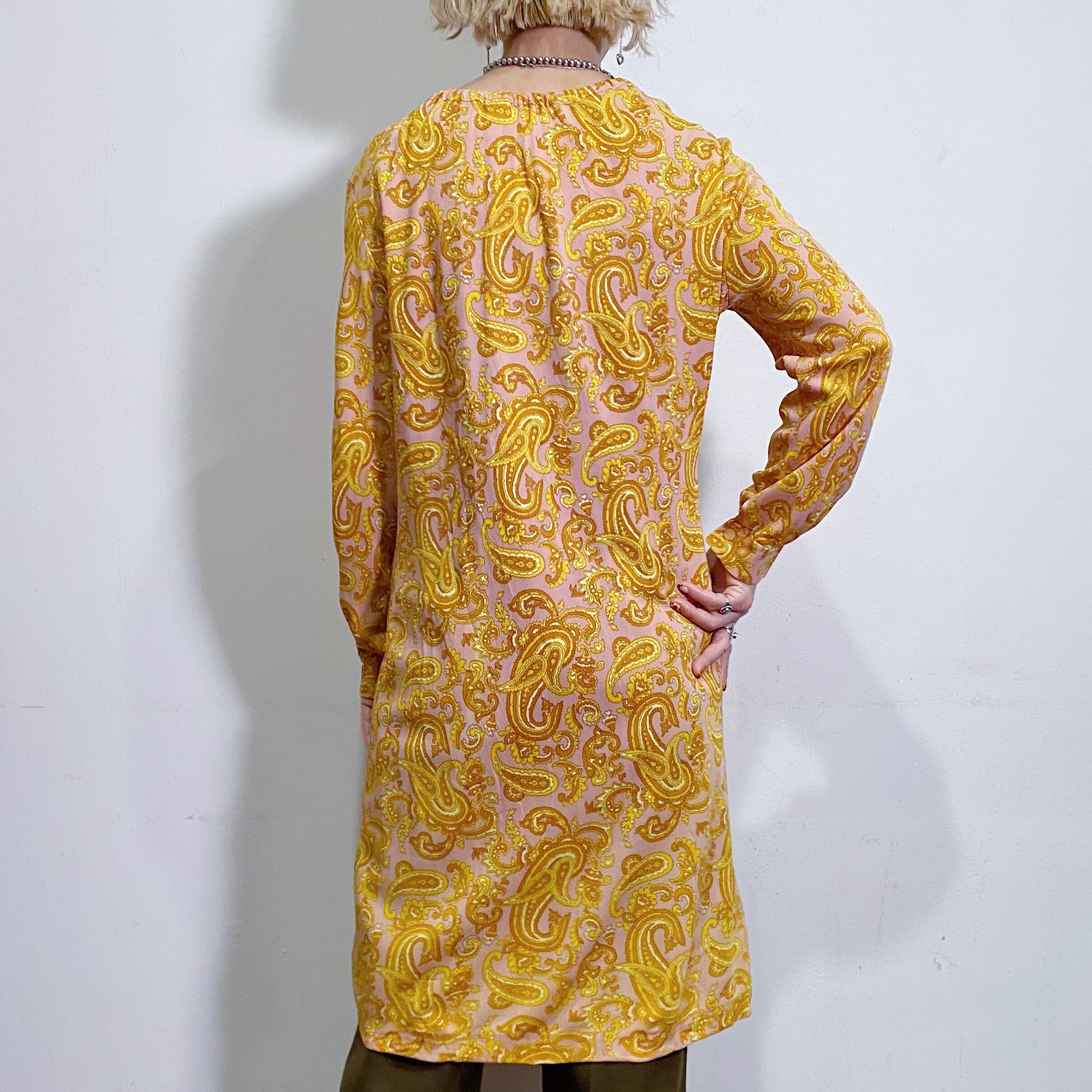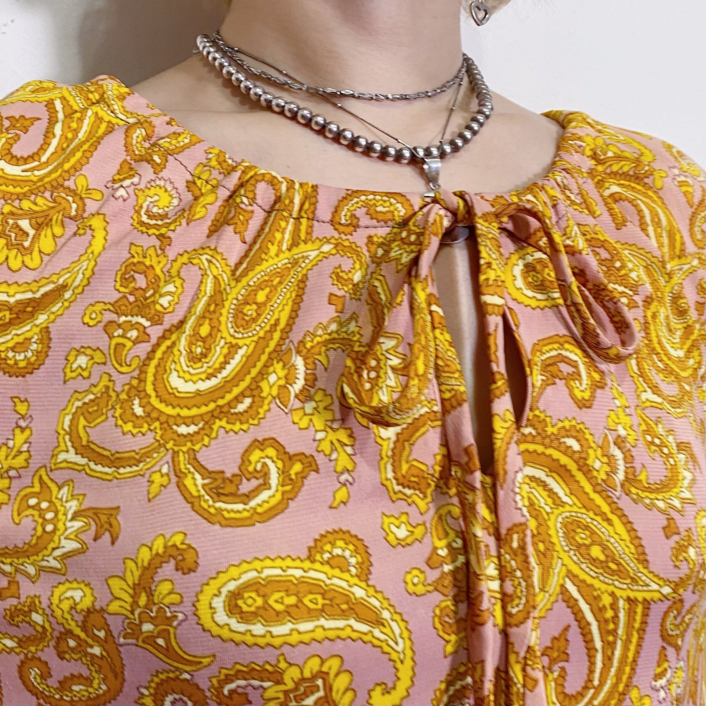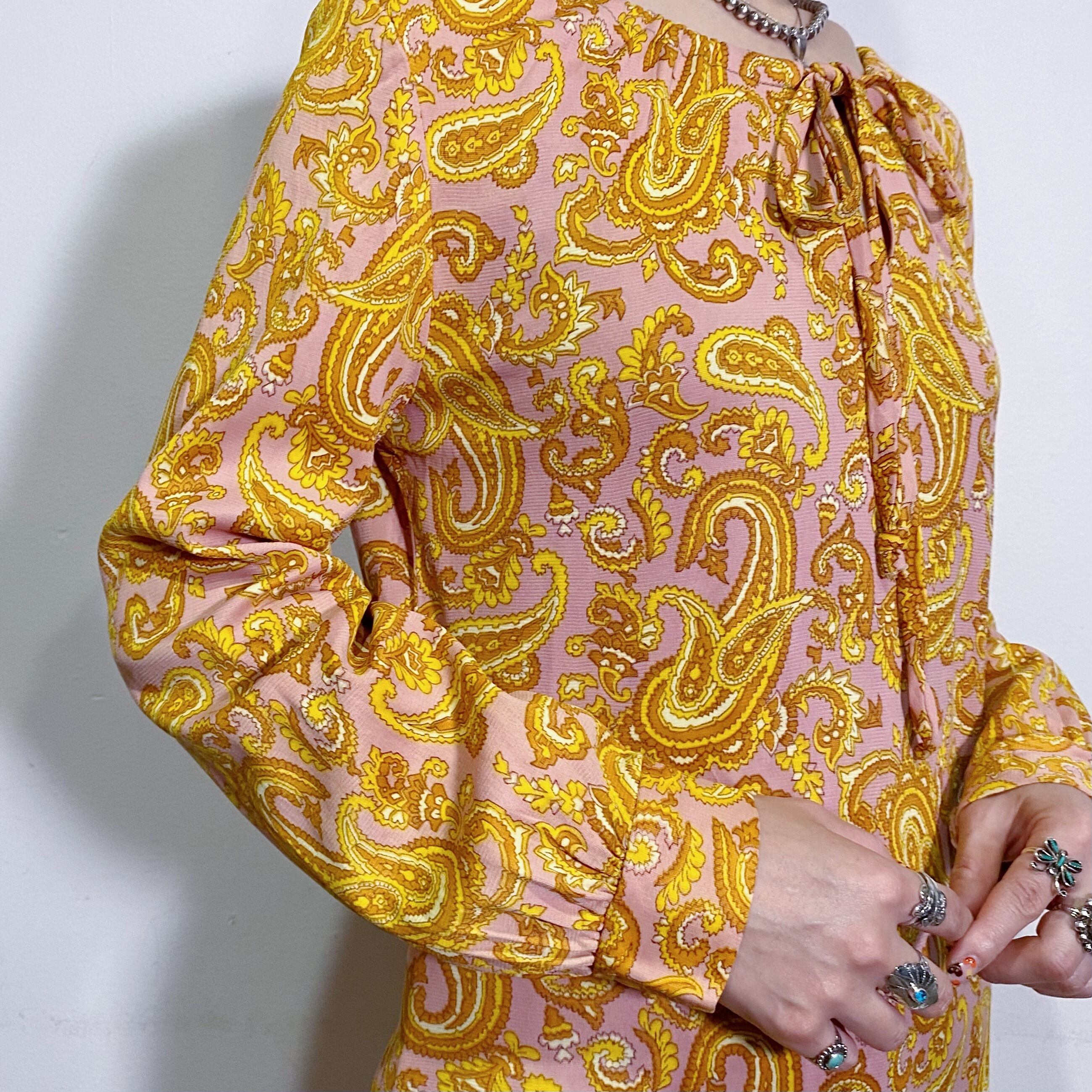 スモーキーなピンクとイエローのペイズリー柄が可愛い、70年代のワンピースです。