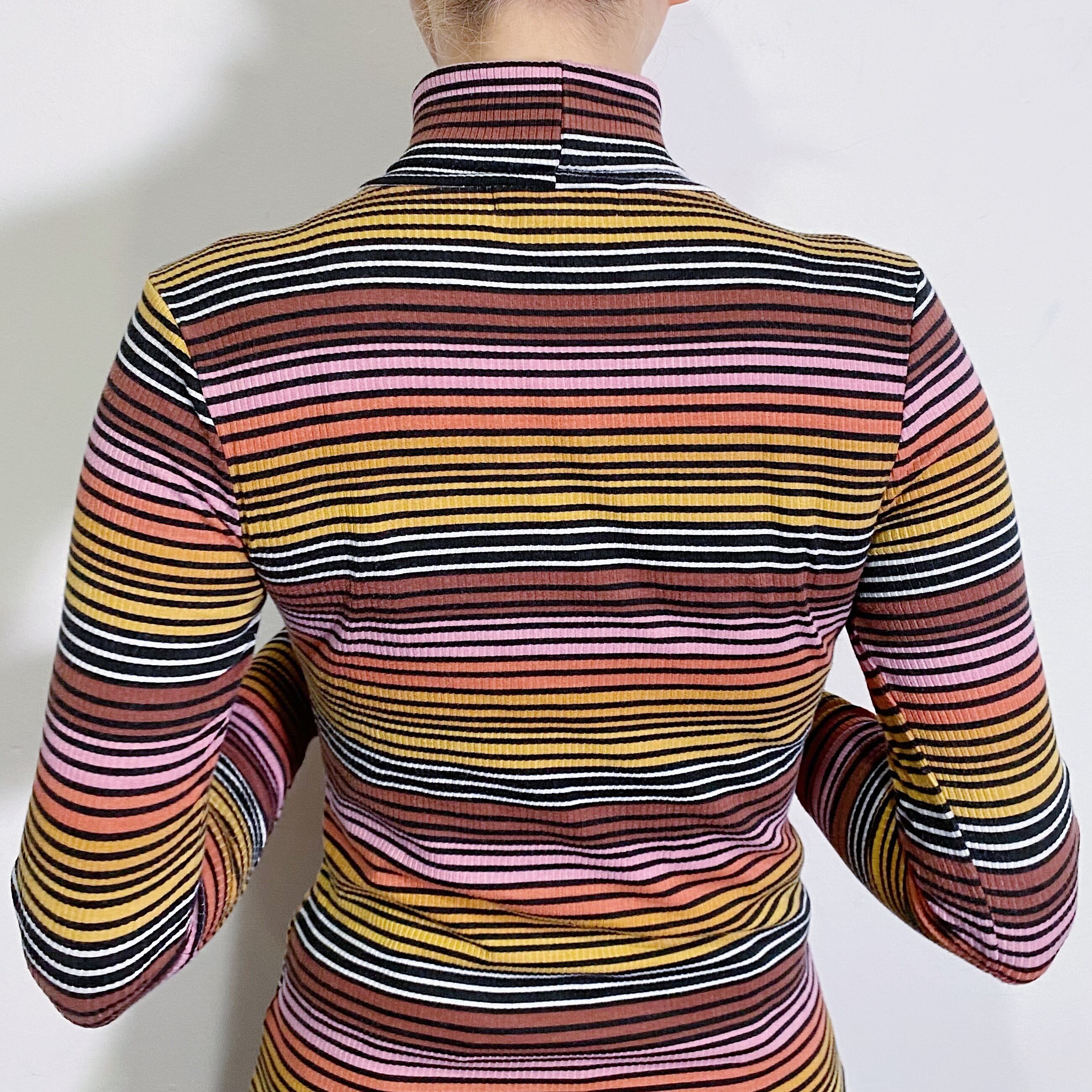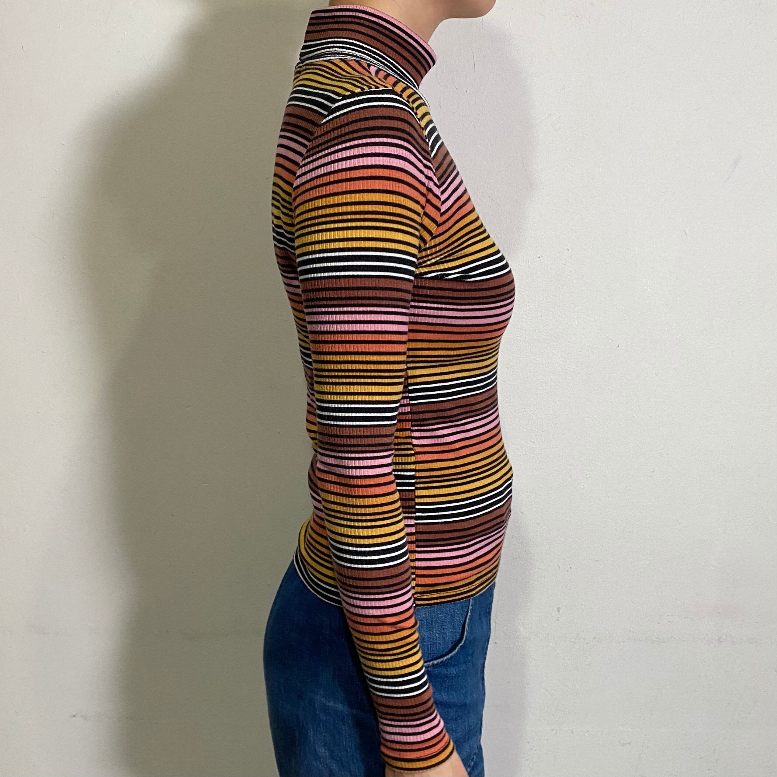 ピンクやオレンジなどの色合いが可愛い、ボーダーのハイネックトップスです。