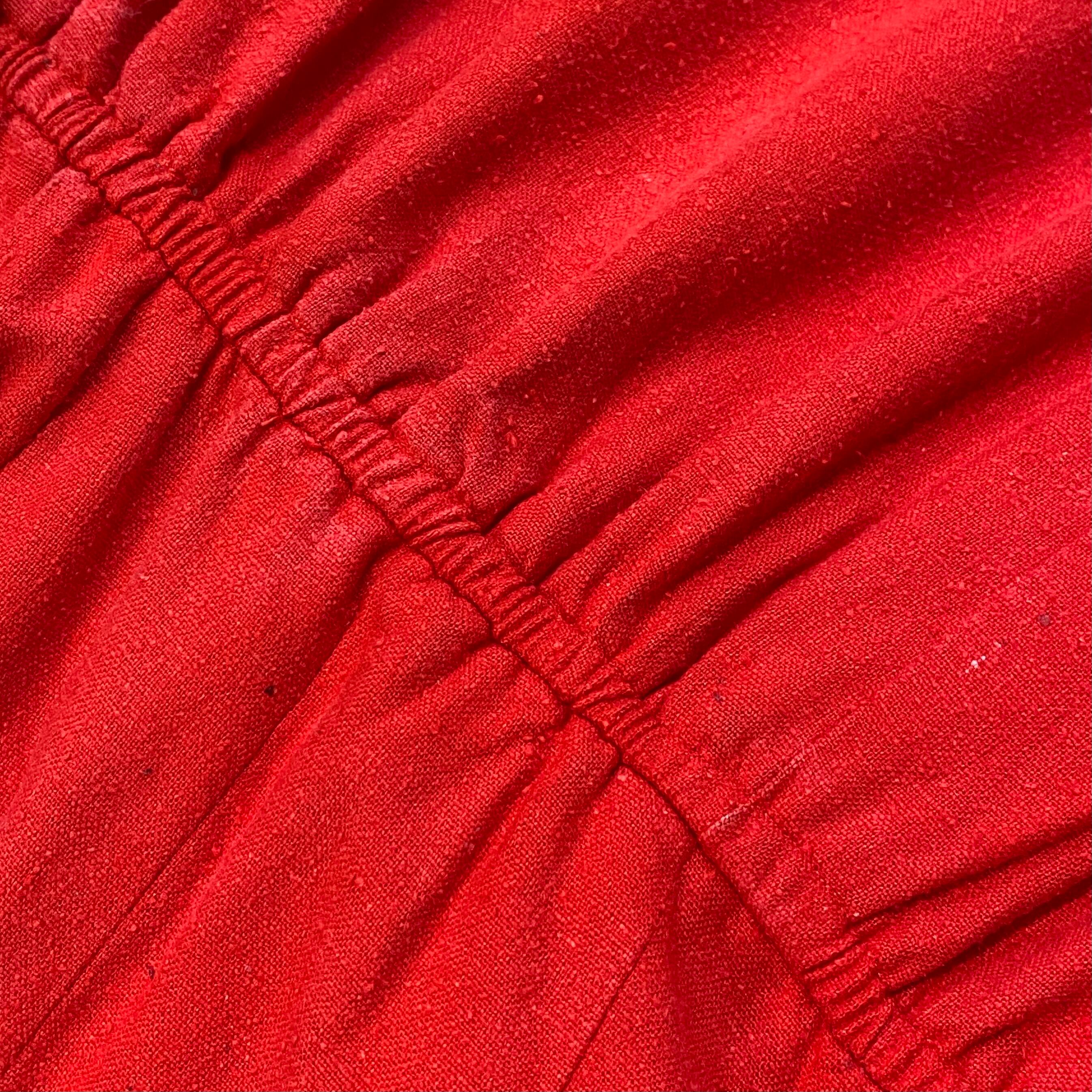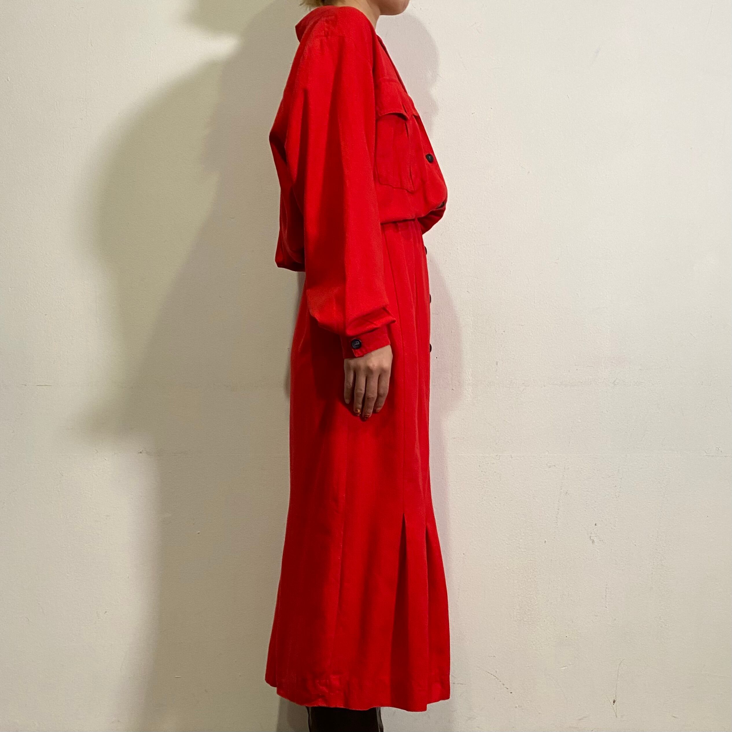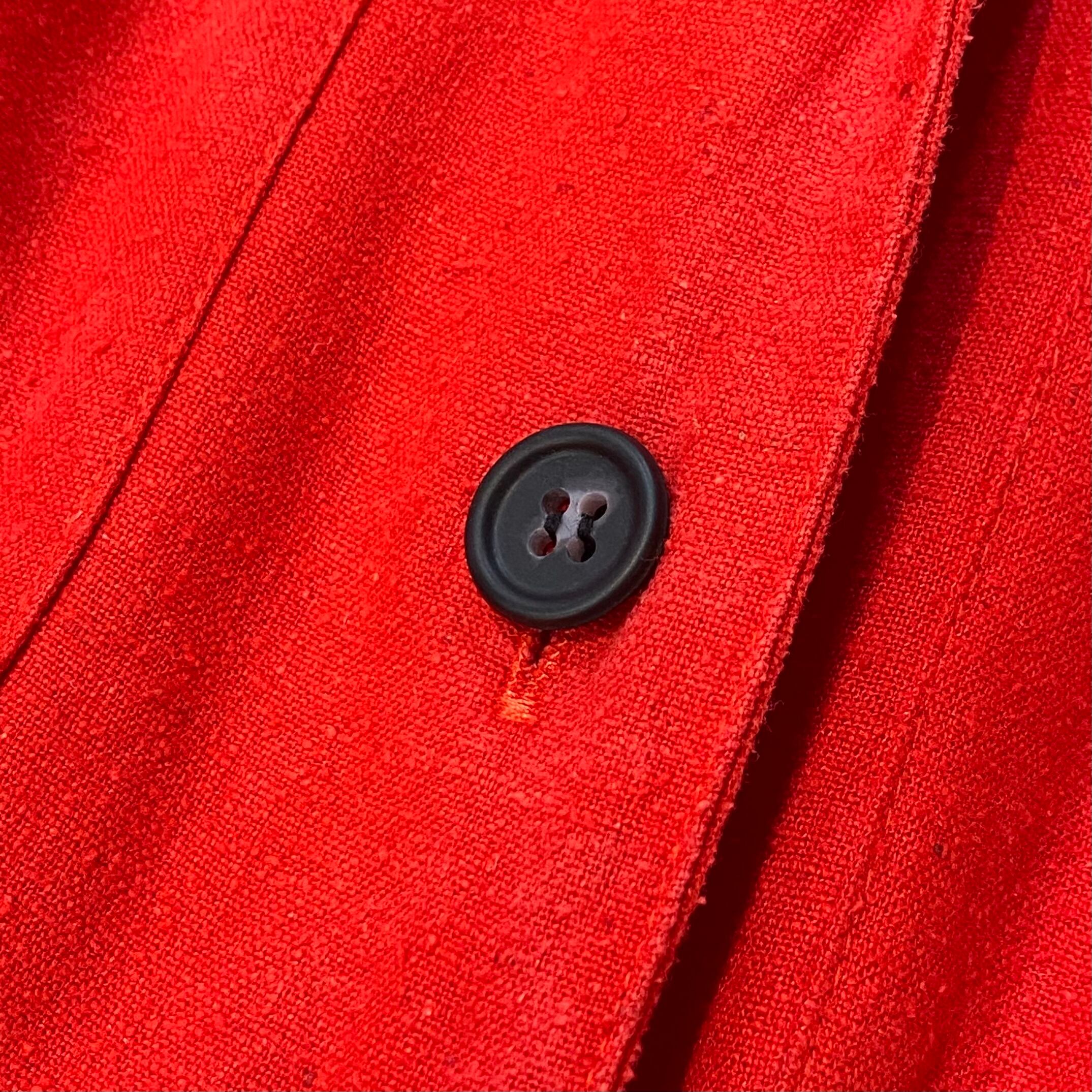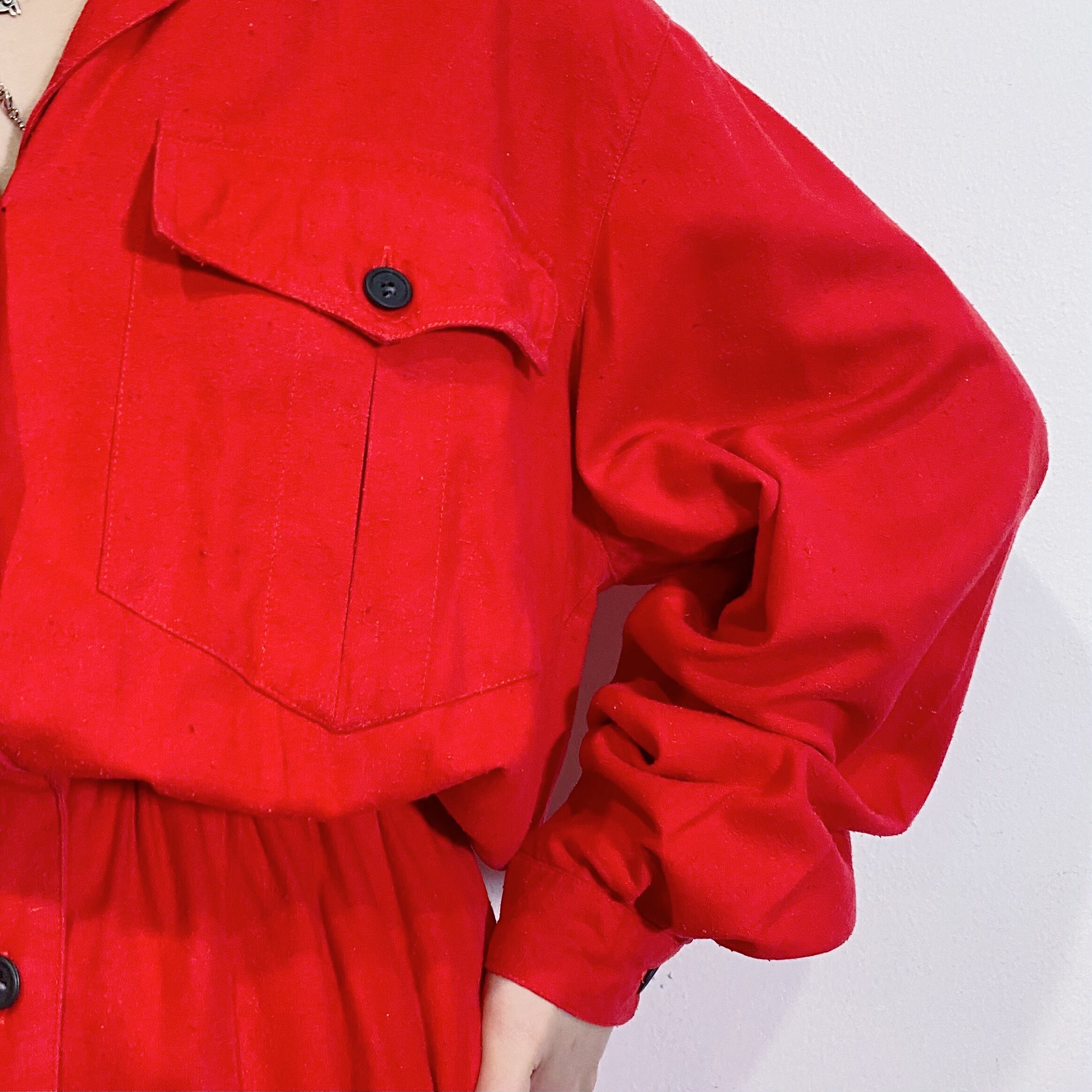 鮮やかなレッドカラーがパッと目を惹く、シャツワンピースです。
