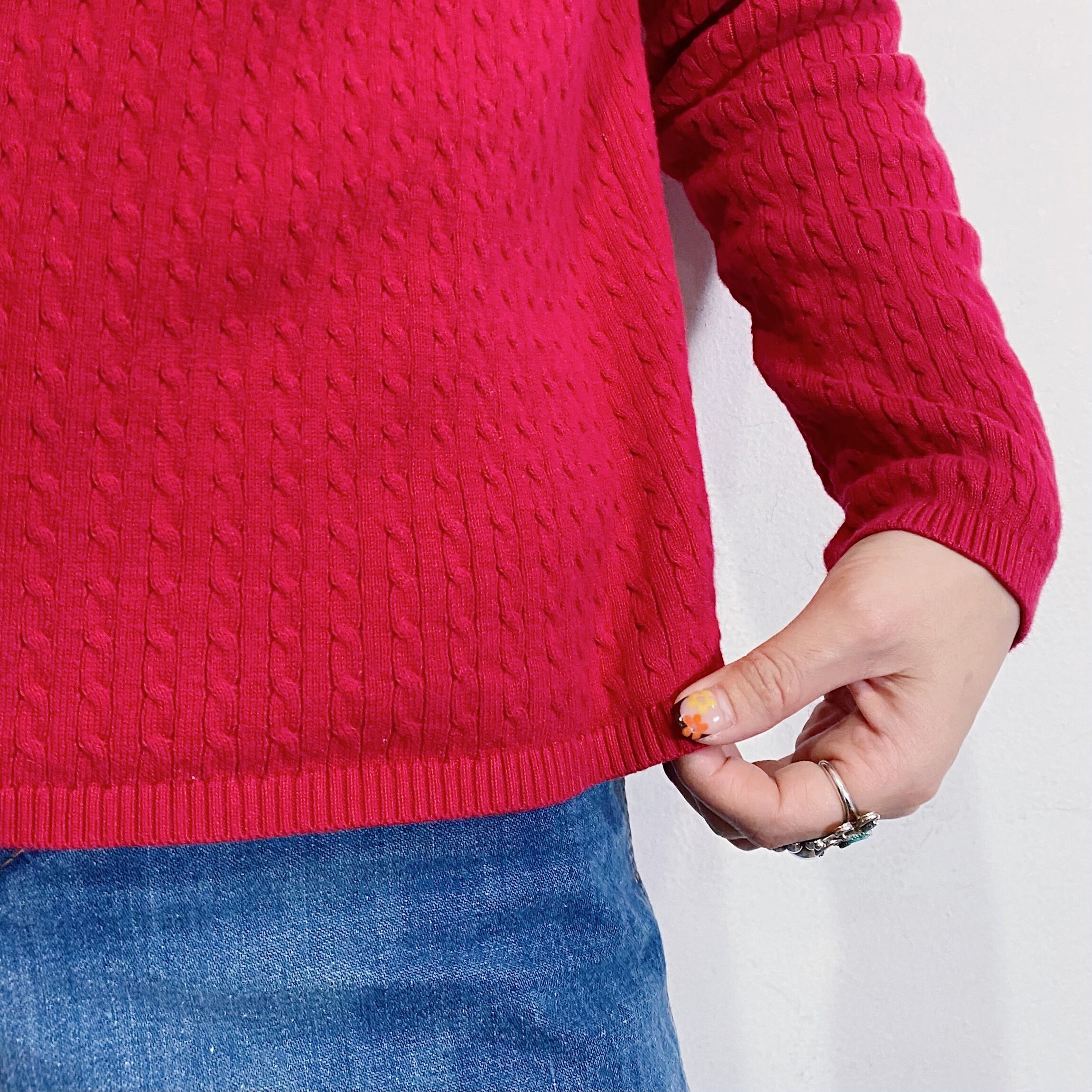 シンプルながらも細かいケーブル編み模様なのが素敵な一枚。