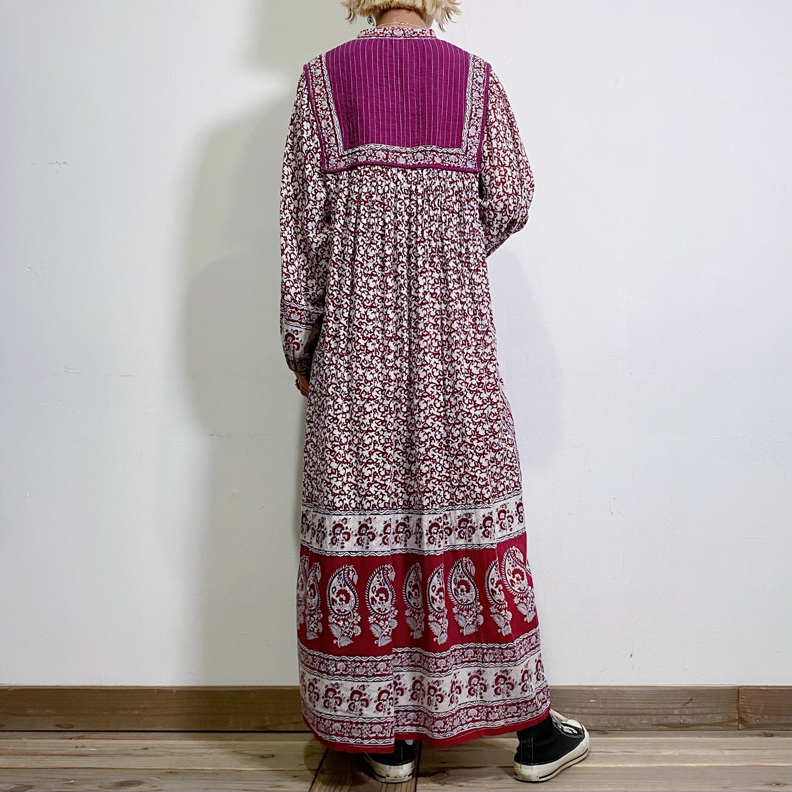 ホワイトとパープルの色合いが大人可愛い、70年代のインド綿ロングワンピースです。