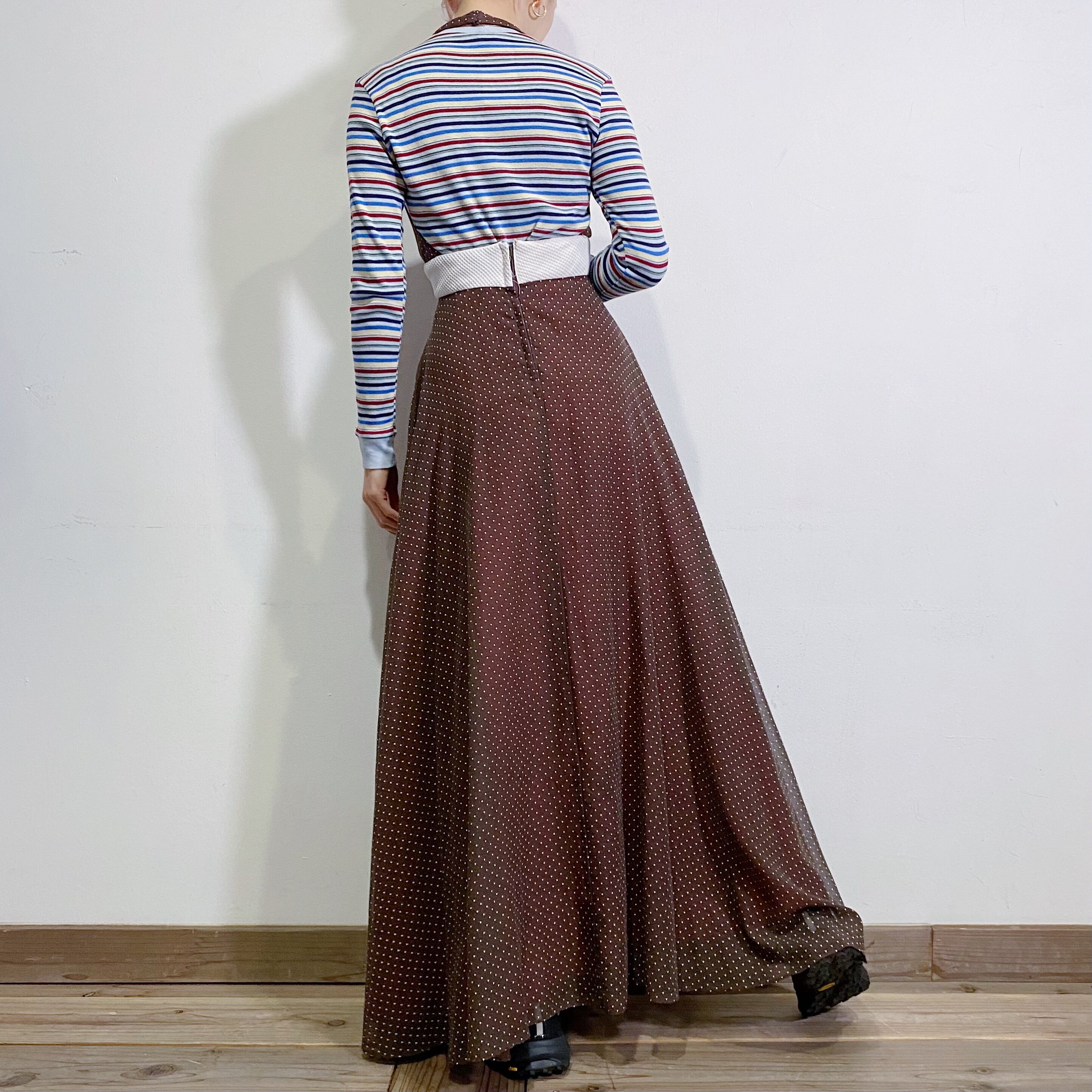 ブラウンベースのドット柄が可愛い、70年代のホルターネックワンピースです。