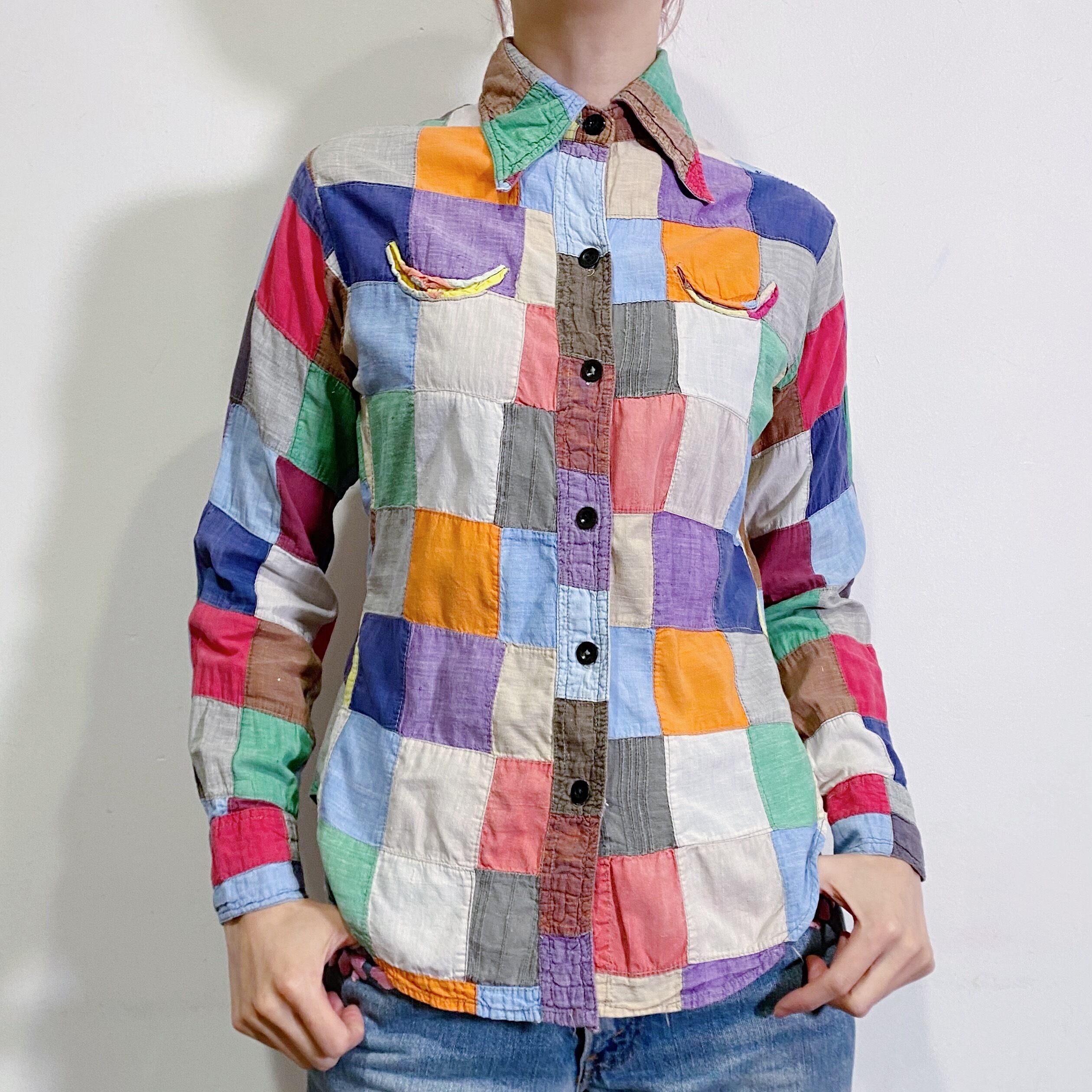 カラフルなリアルパッチワークが可愛い、70年代の長袖シャツです。