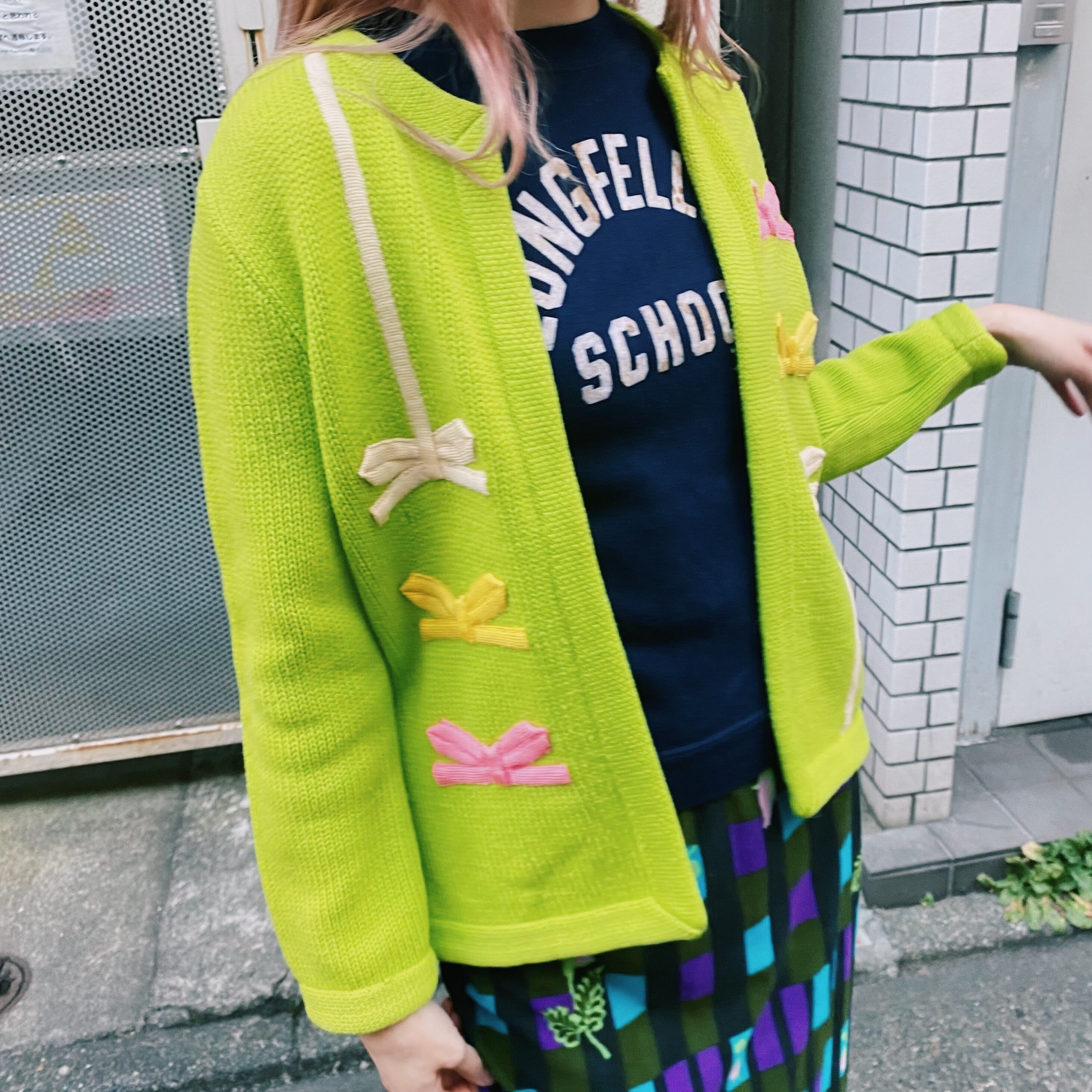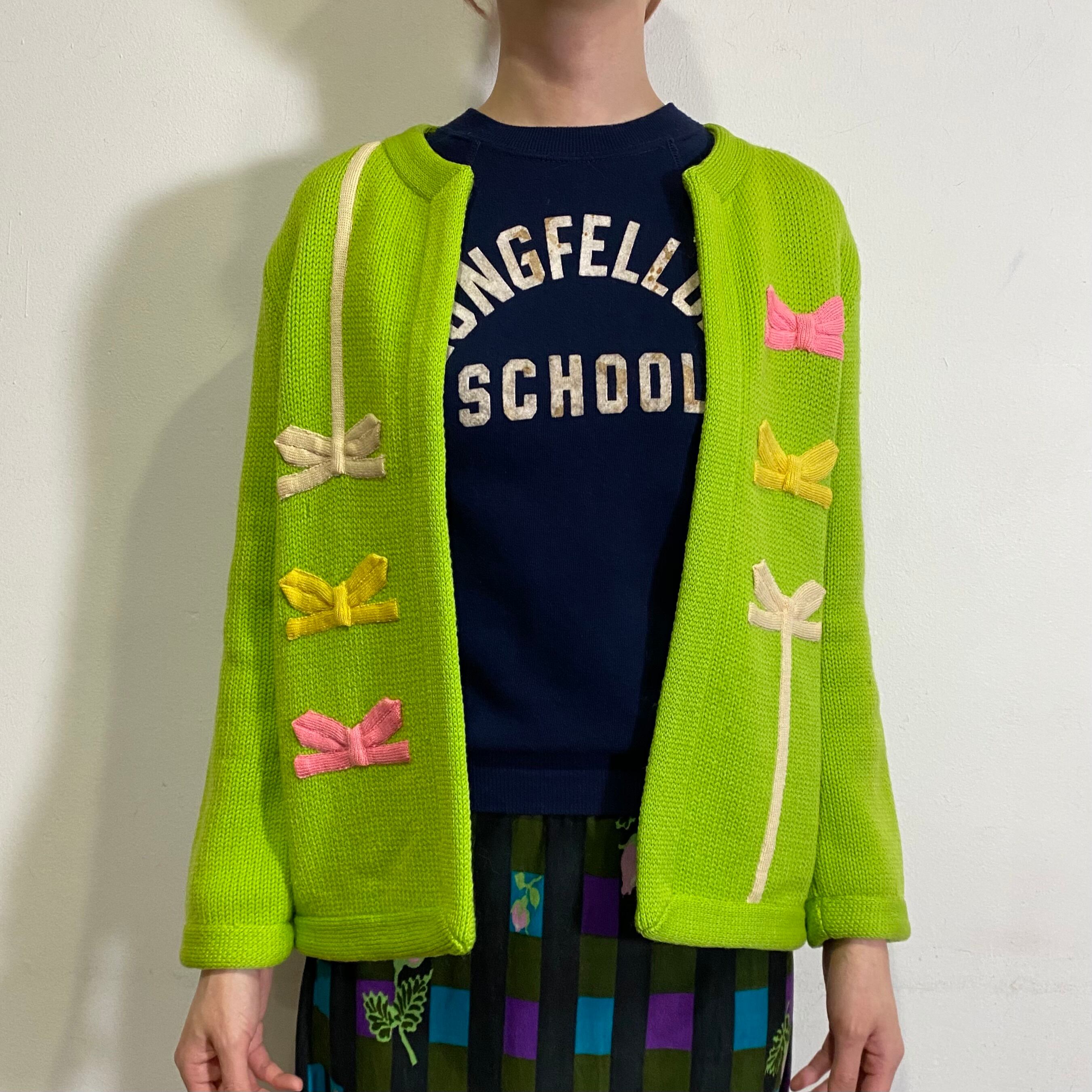 鮮やかなグリーンベースにリボンモチーフが可愛い、60年代のニットカーディガンです。