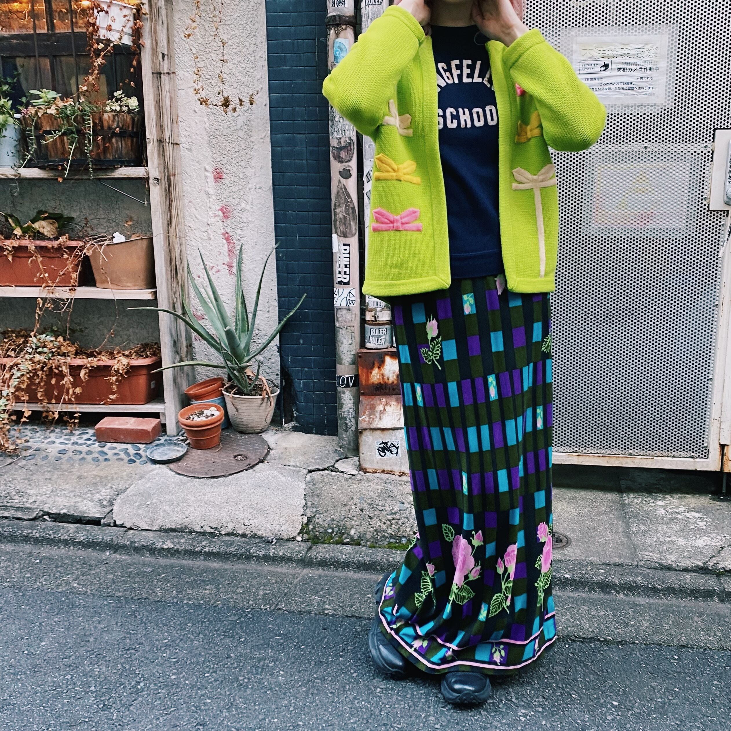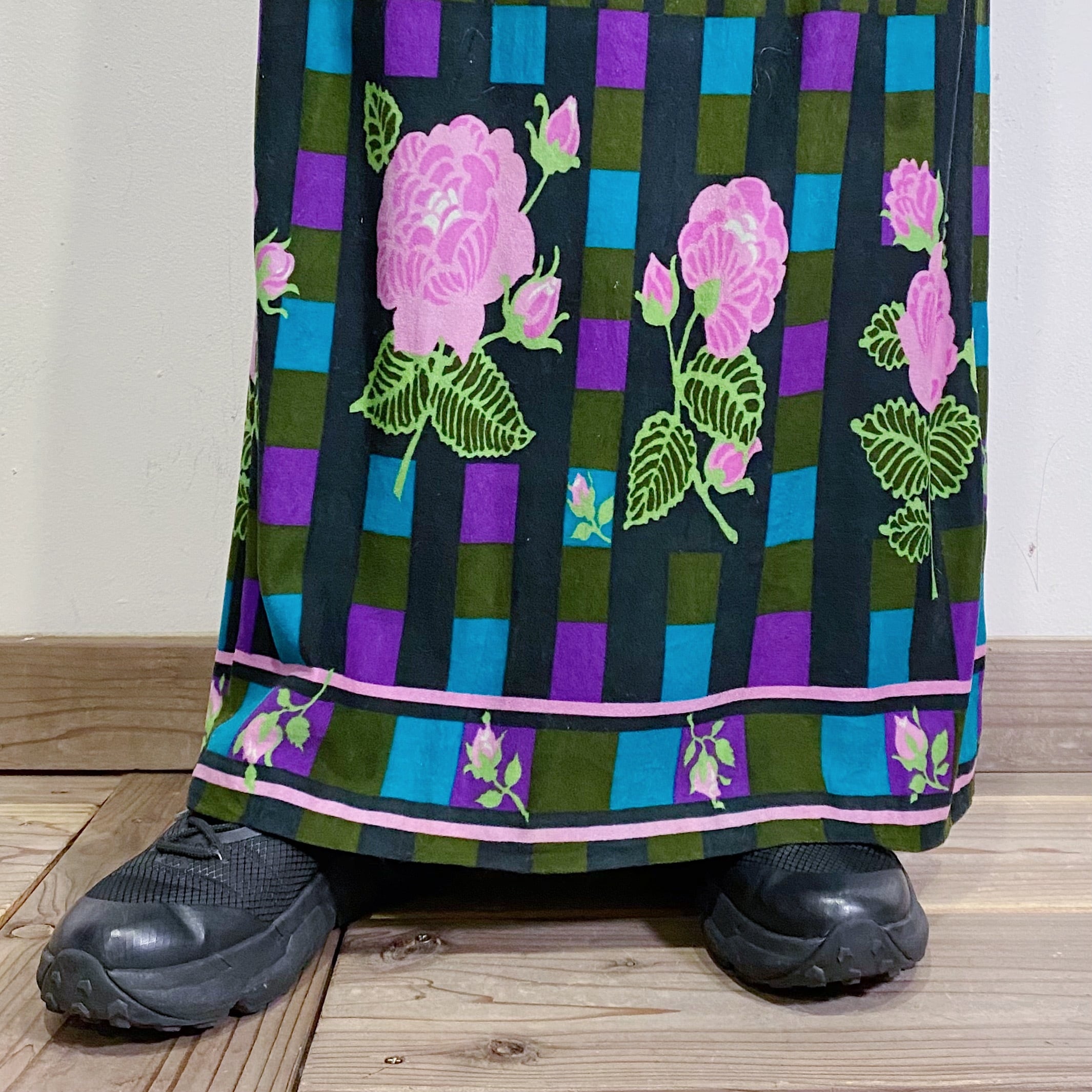 パープルやブルーのチェックのようなベースにピンクのお花が可愛い、70年代のスカートです。
