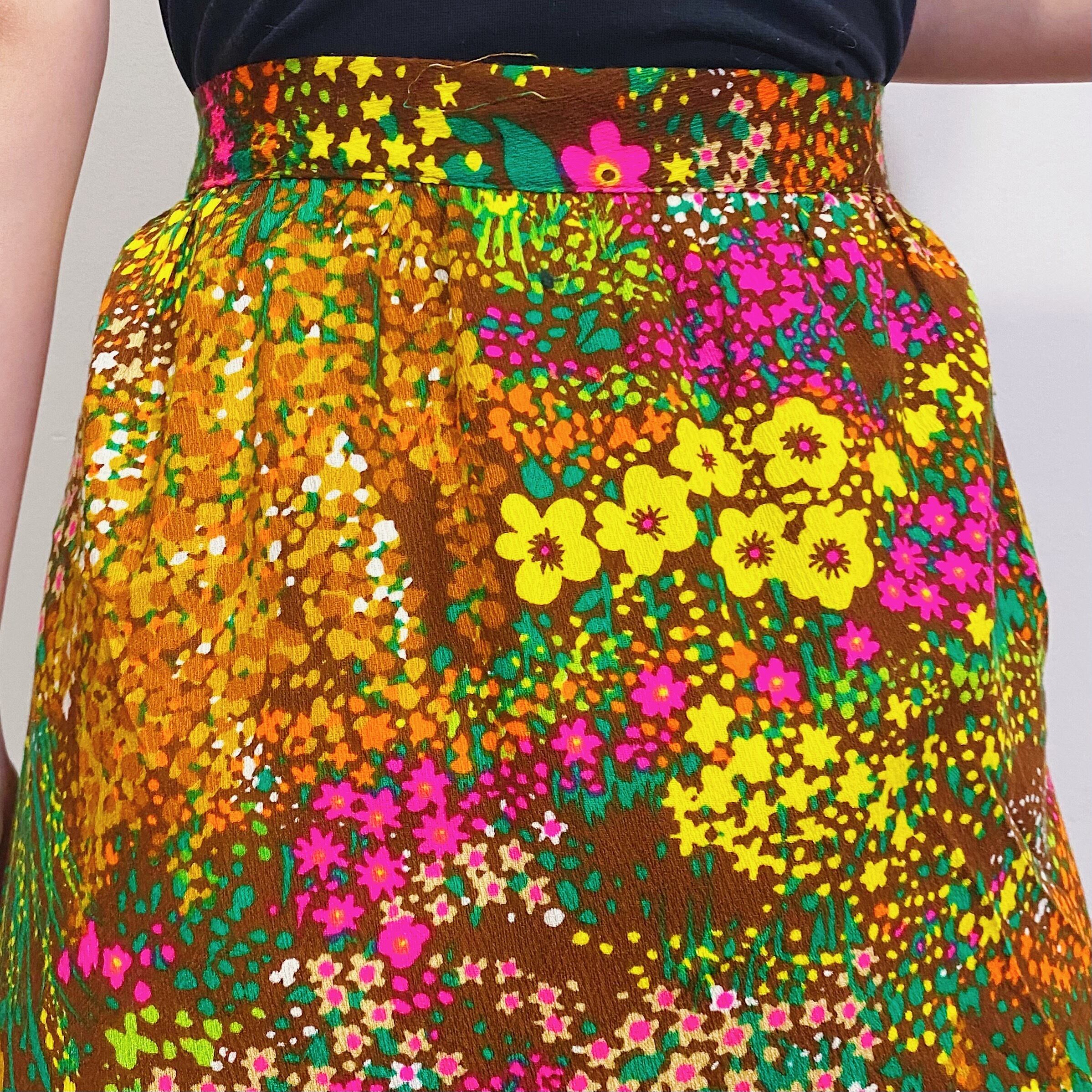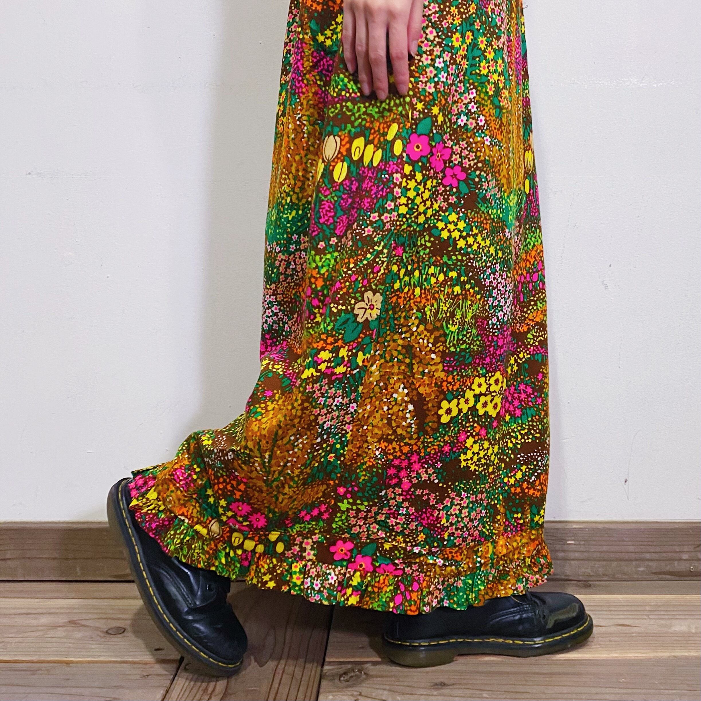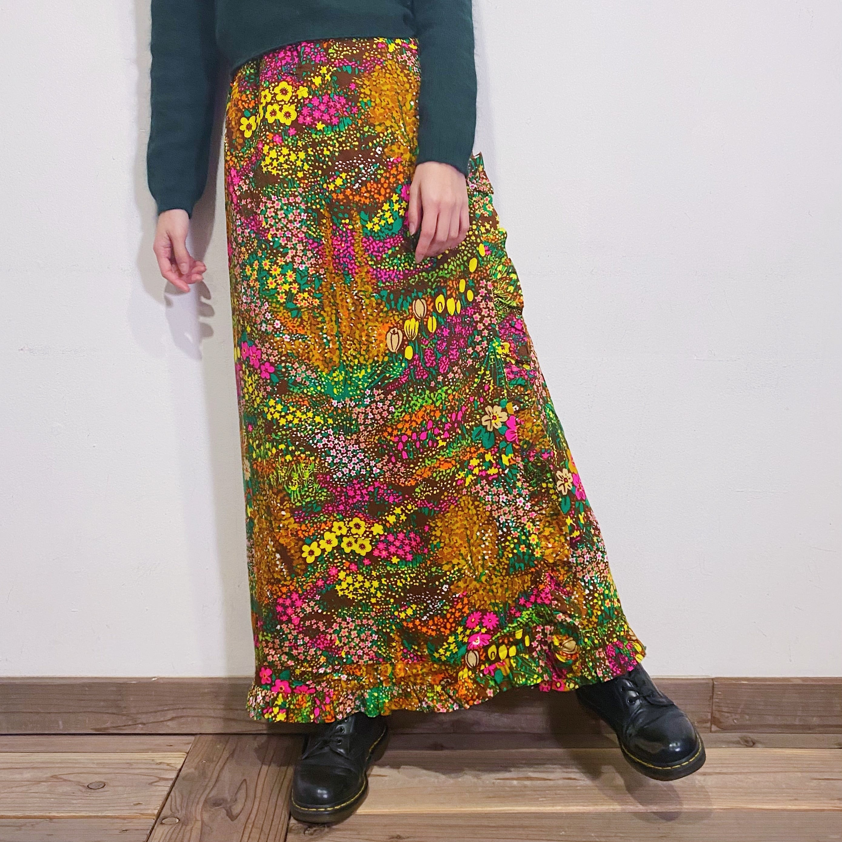 ブラウンベースにカラフルな花柄が可愛い、70年代のスカートです。