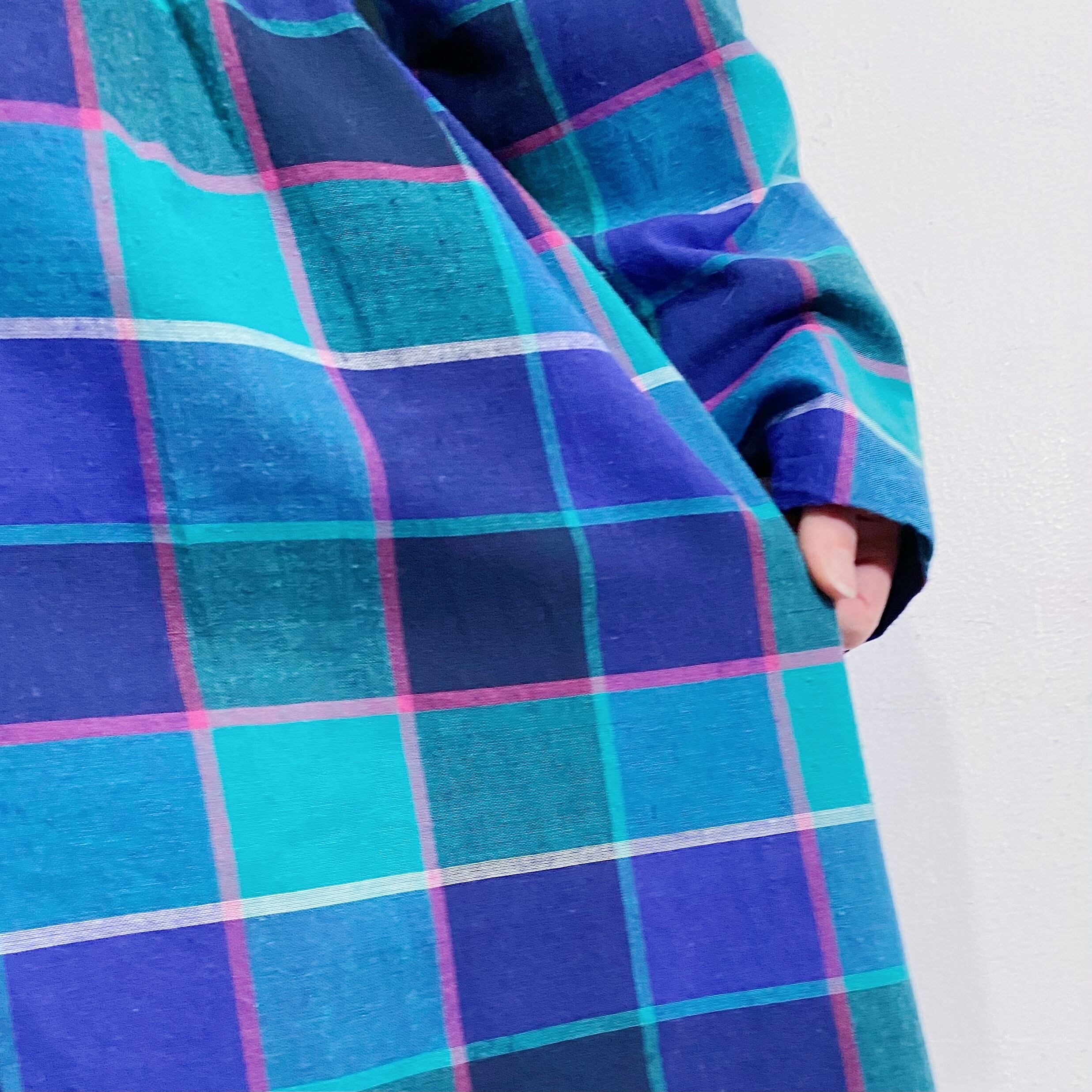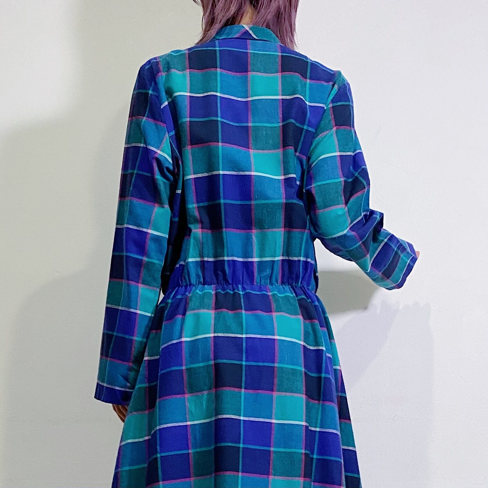 グリーン×ブルー×ピンクのチェックの色合いが可愛い、80年代のシャツワンピースです。