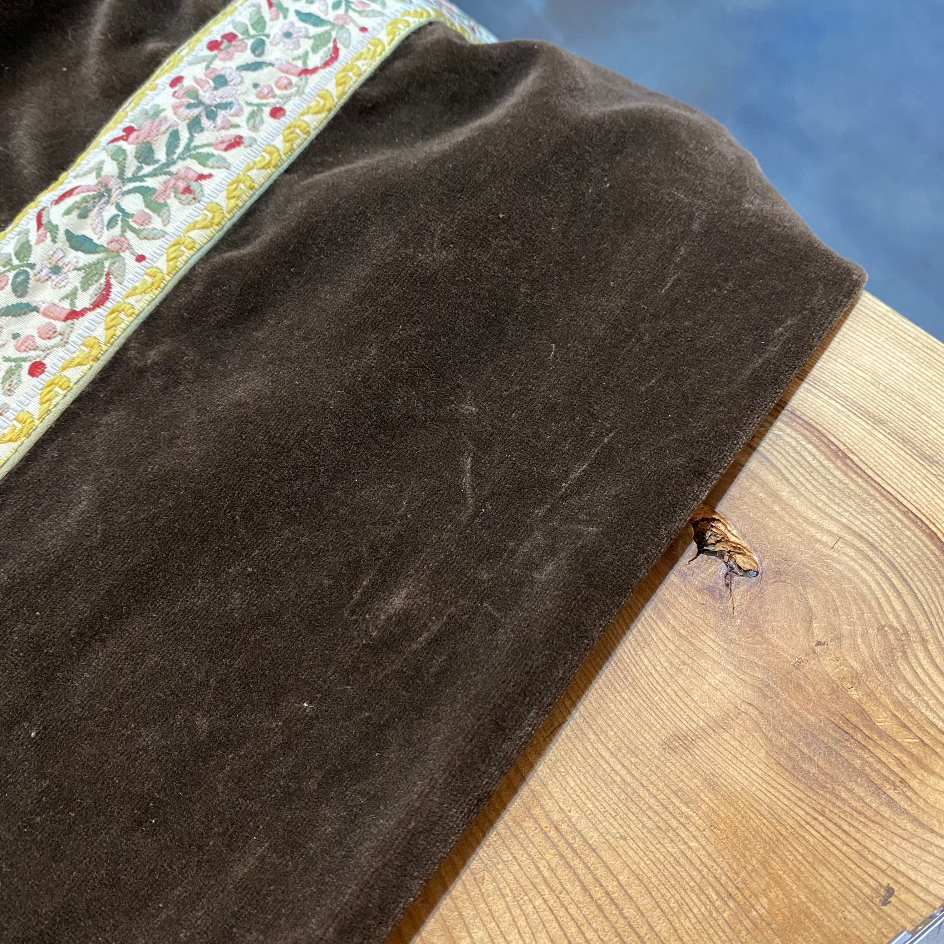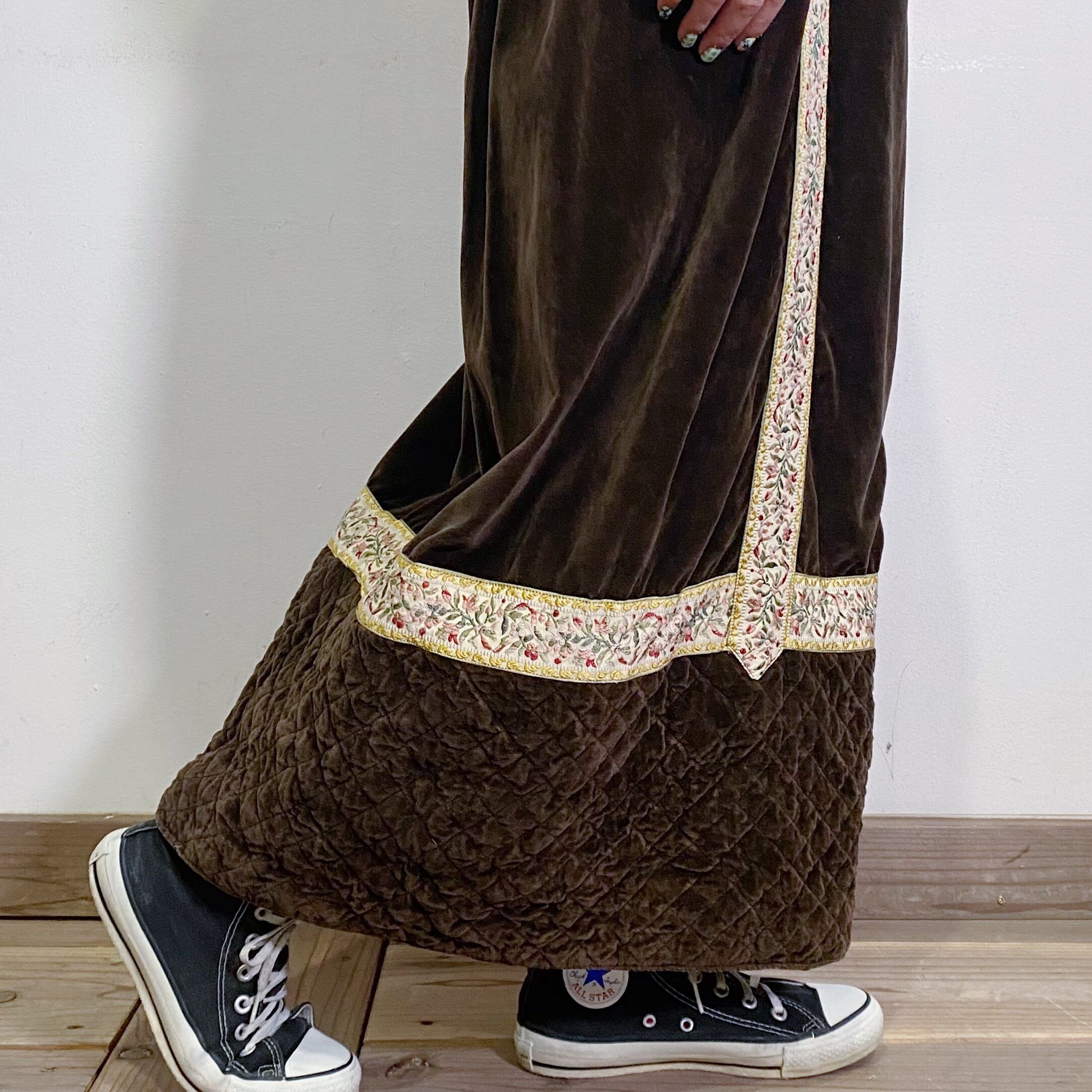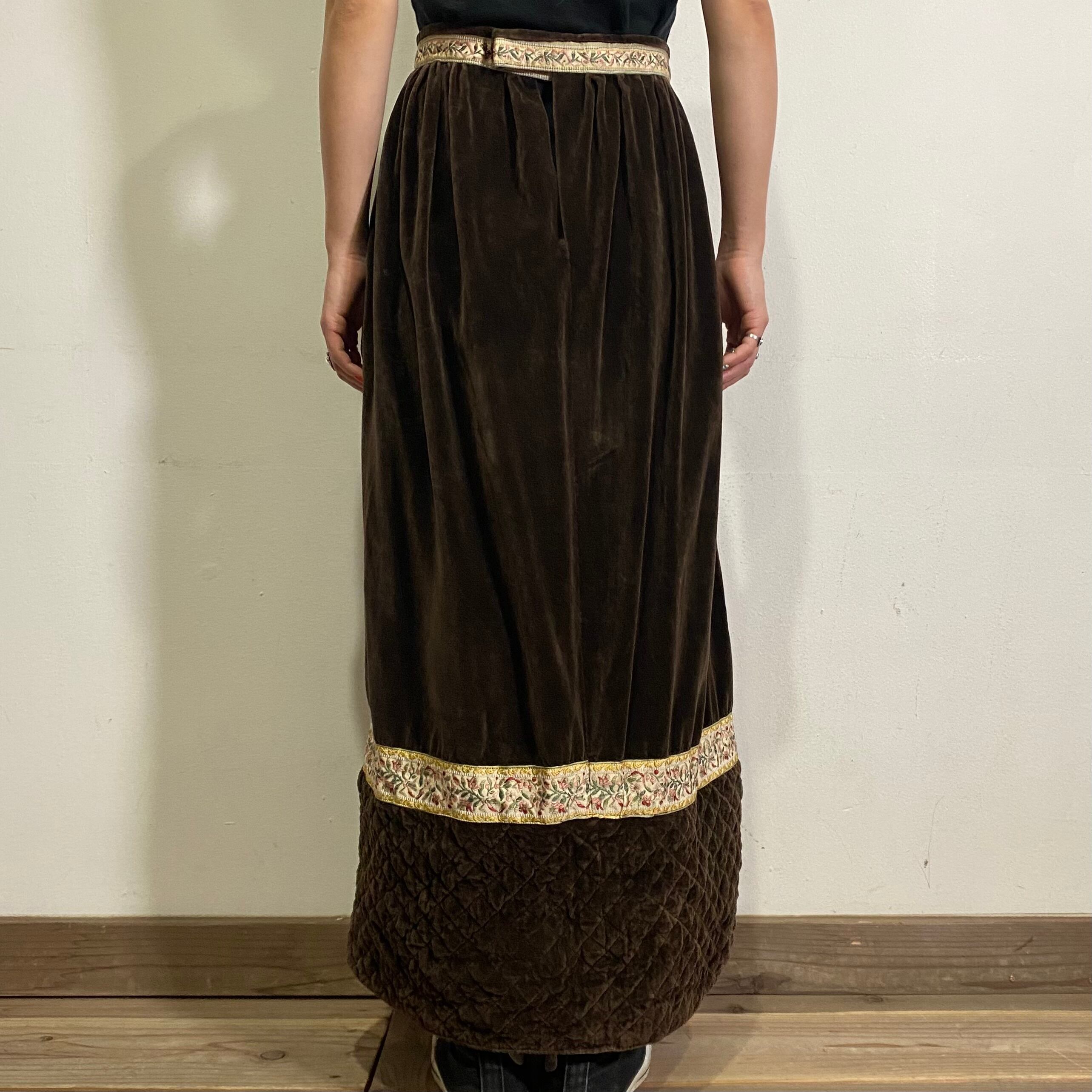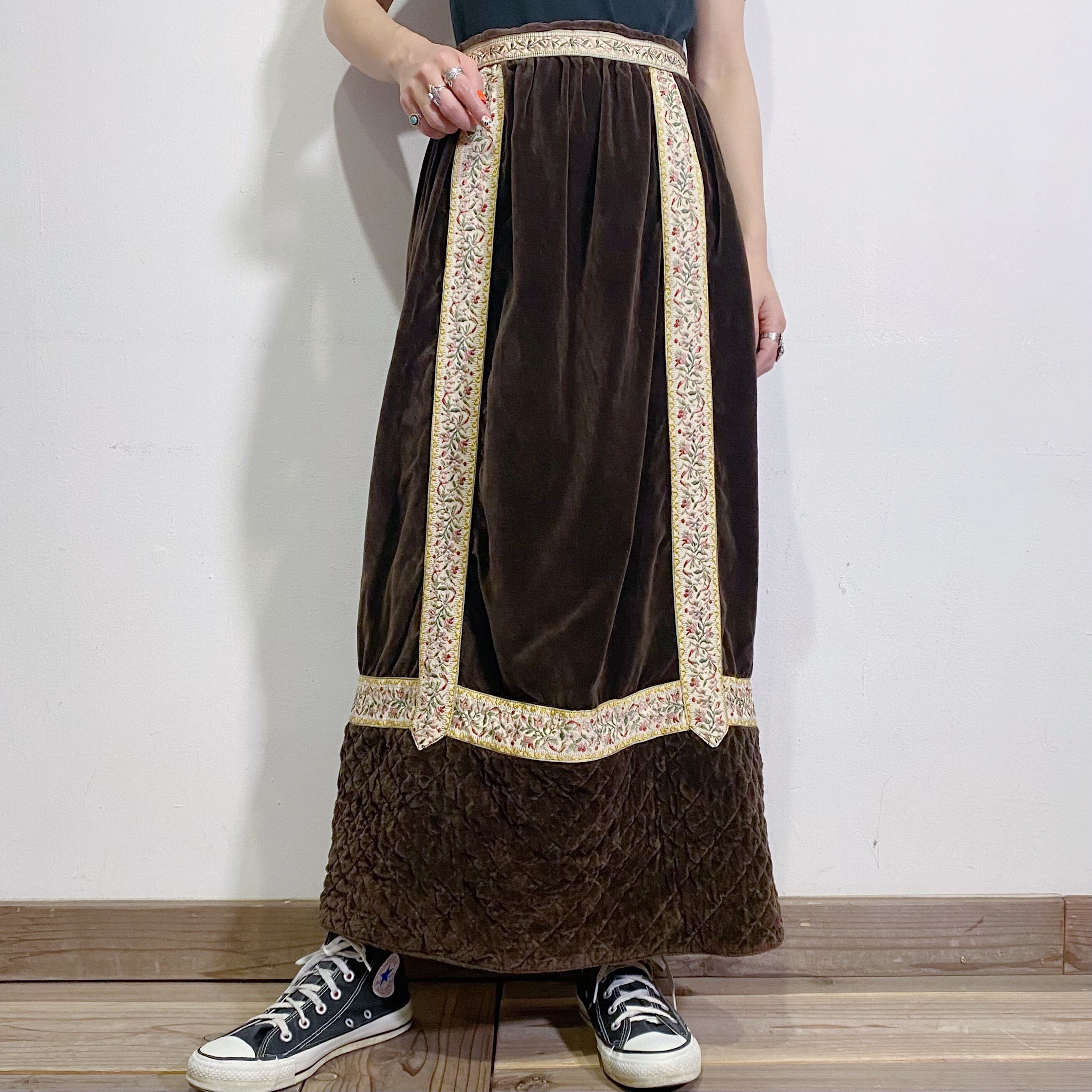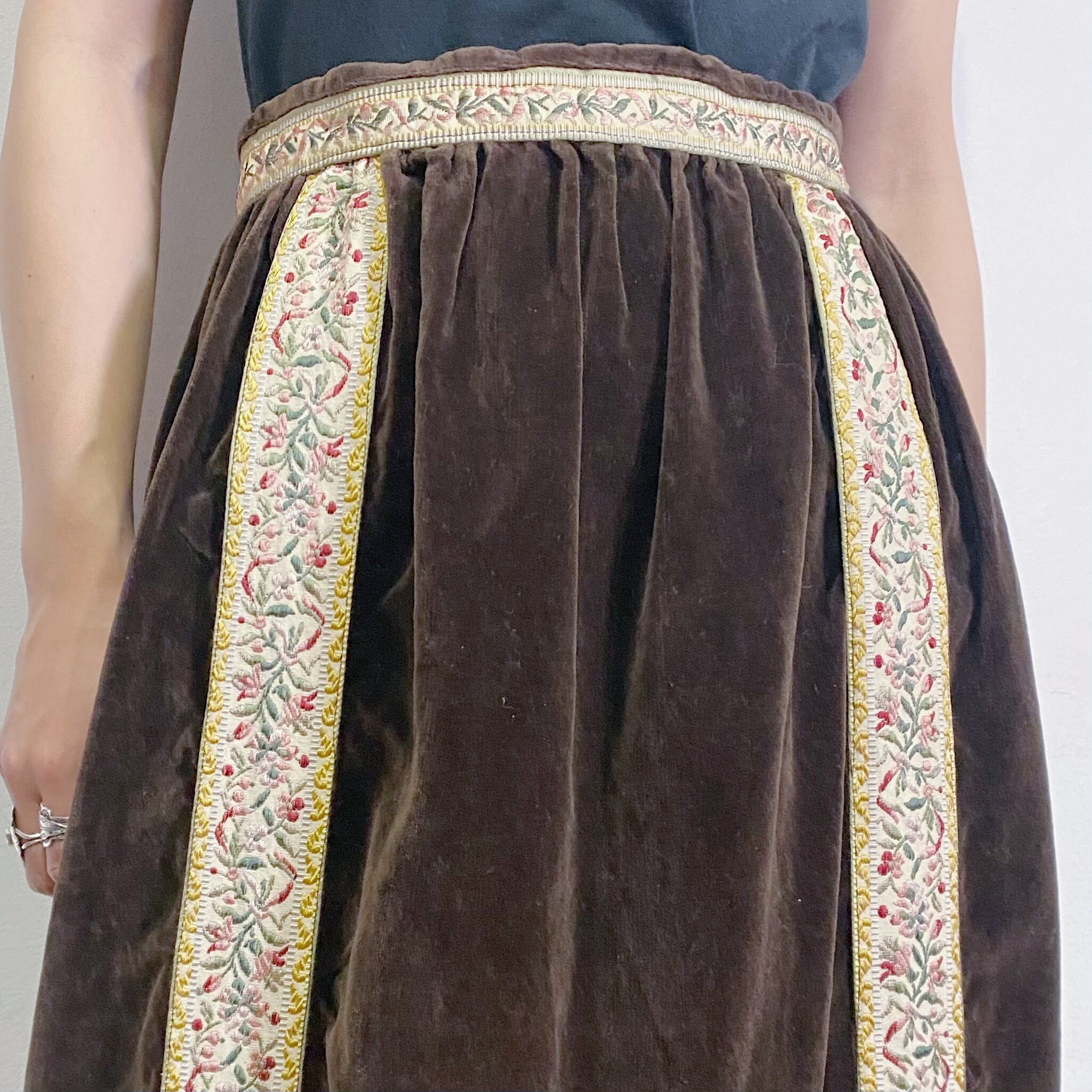 こっくりブラウンカラーにチロルテープデザインが可愛い、70年代のロングスカートです。