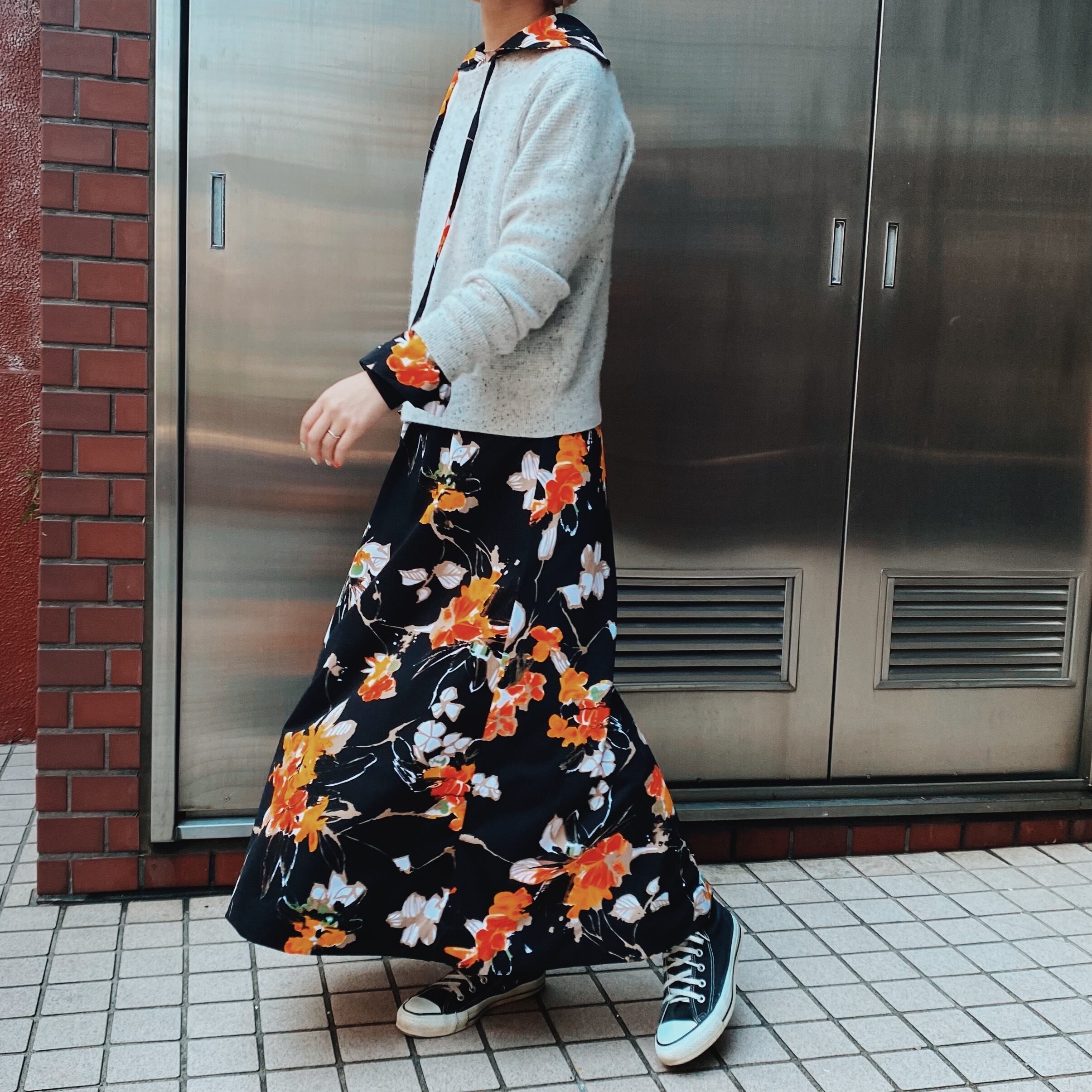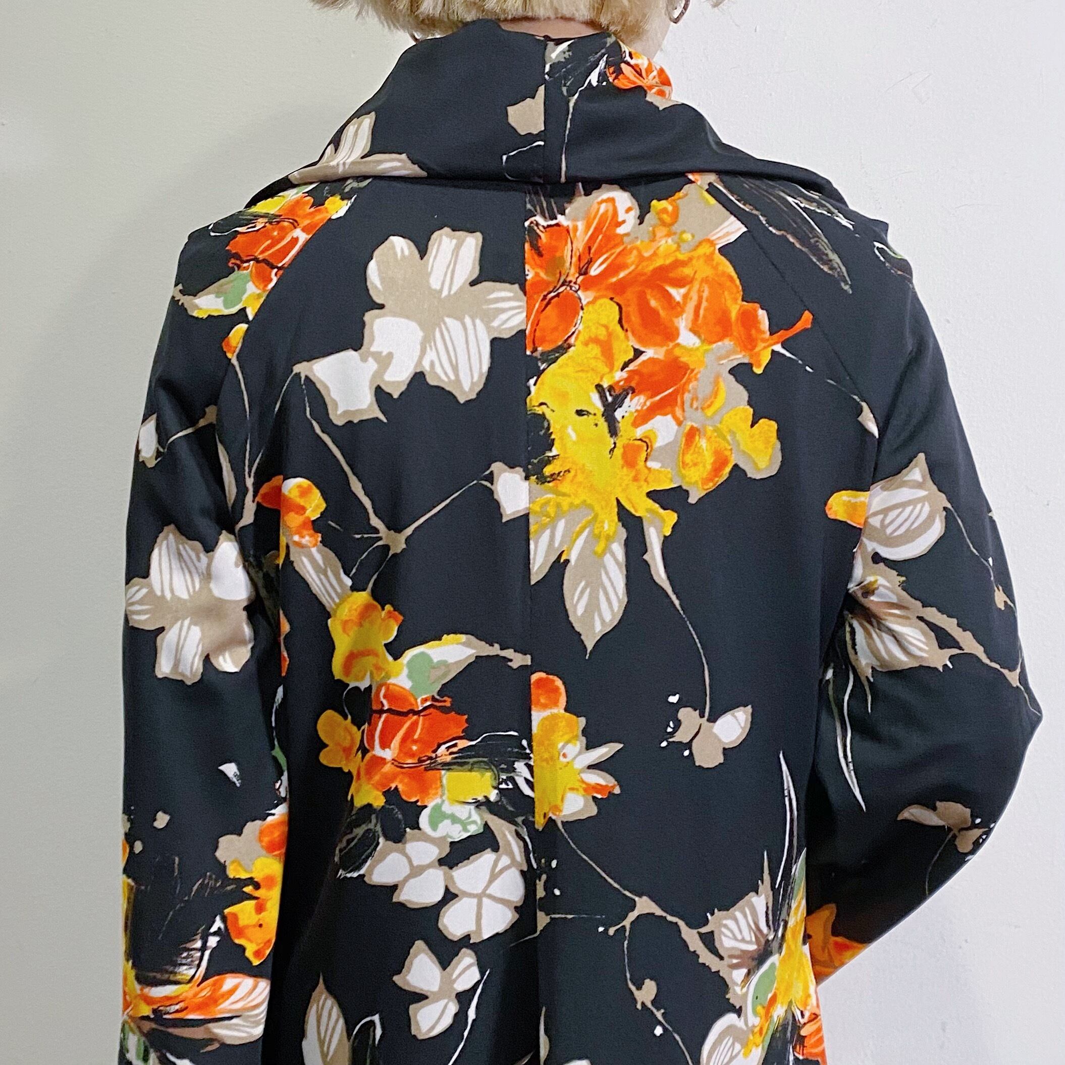 ブラックベースにイエローやオレンジの花柄が映える、70年代のワンピースです。