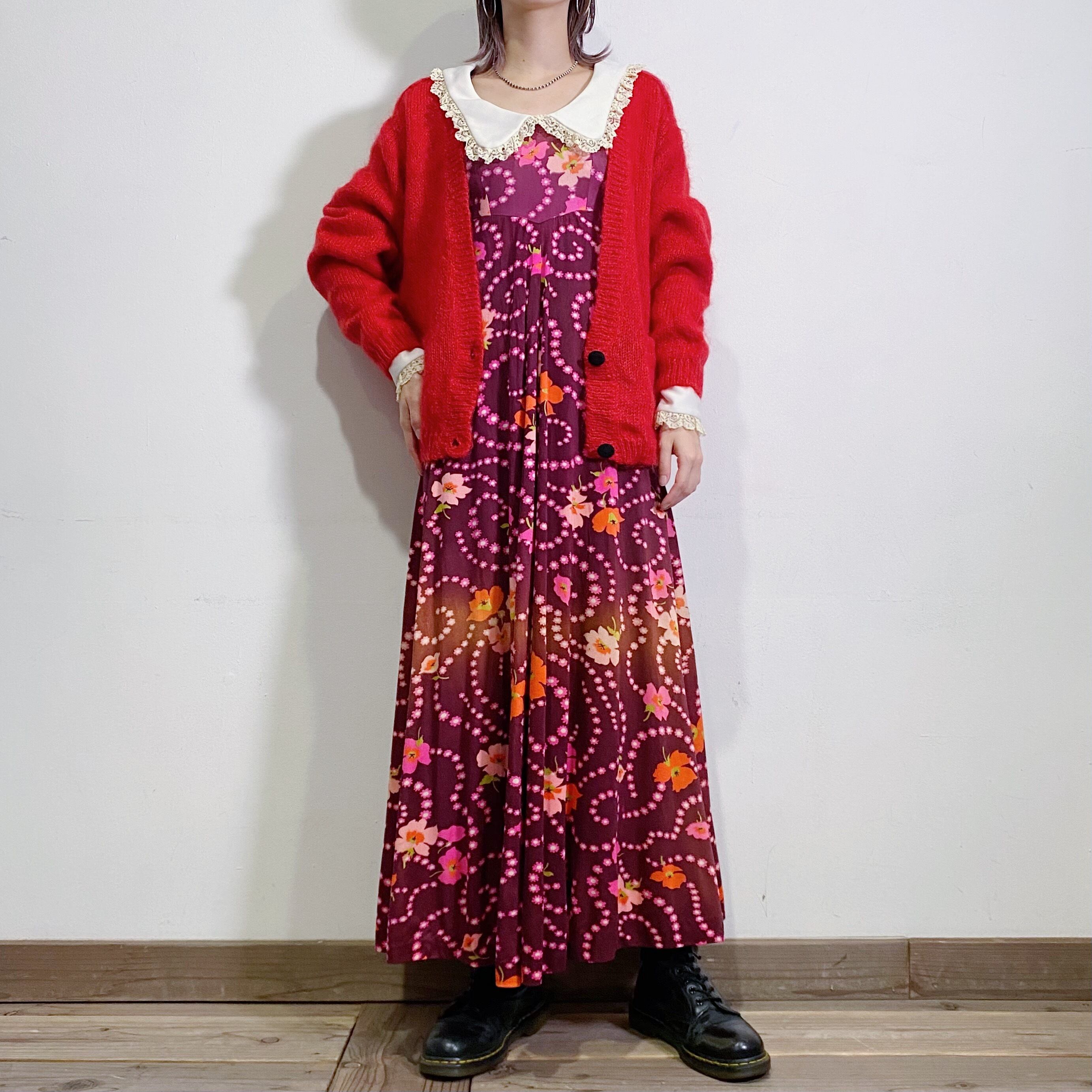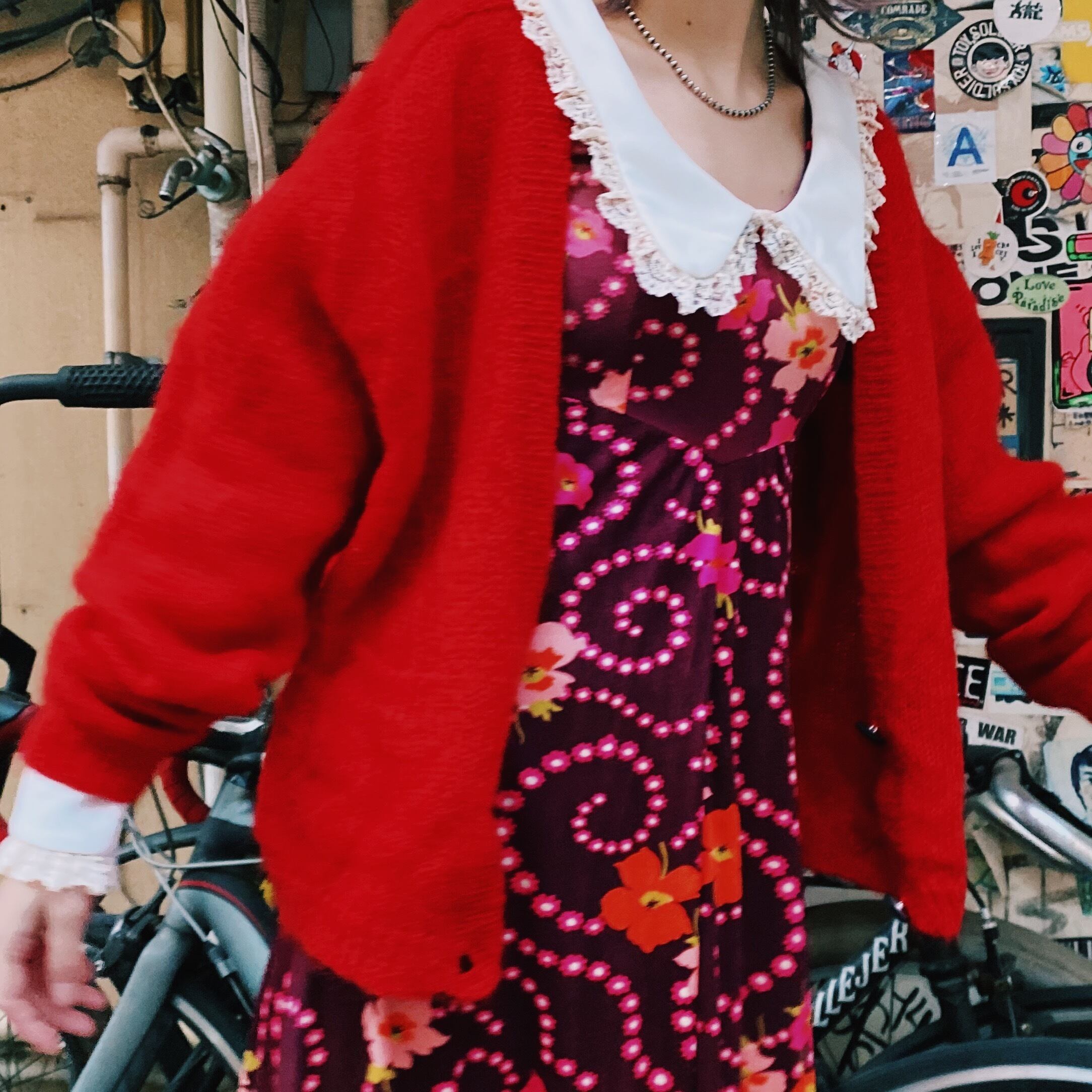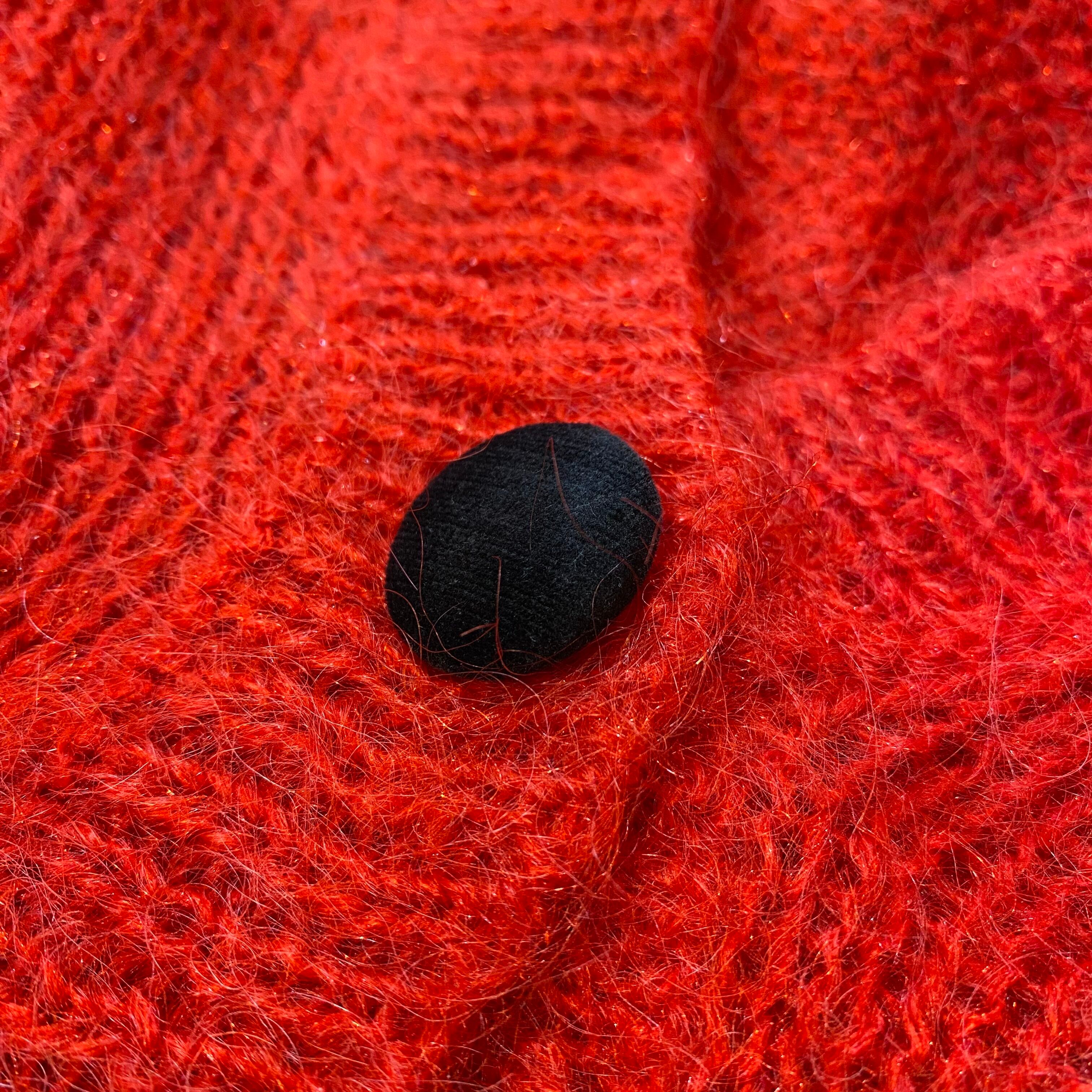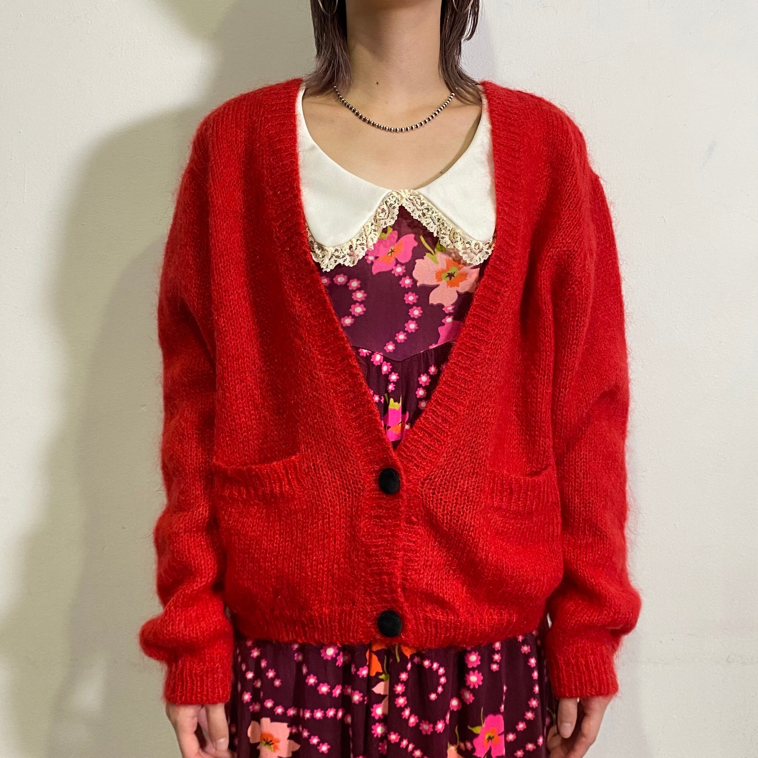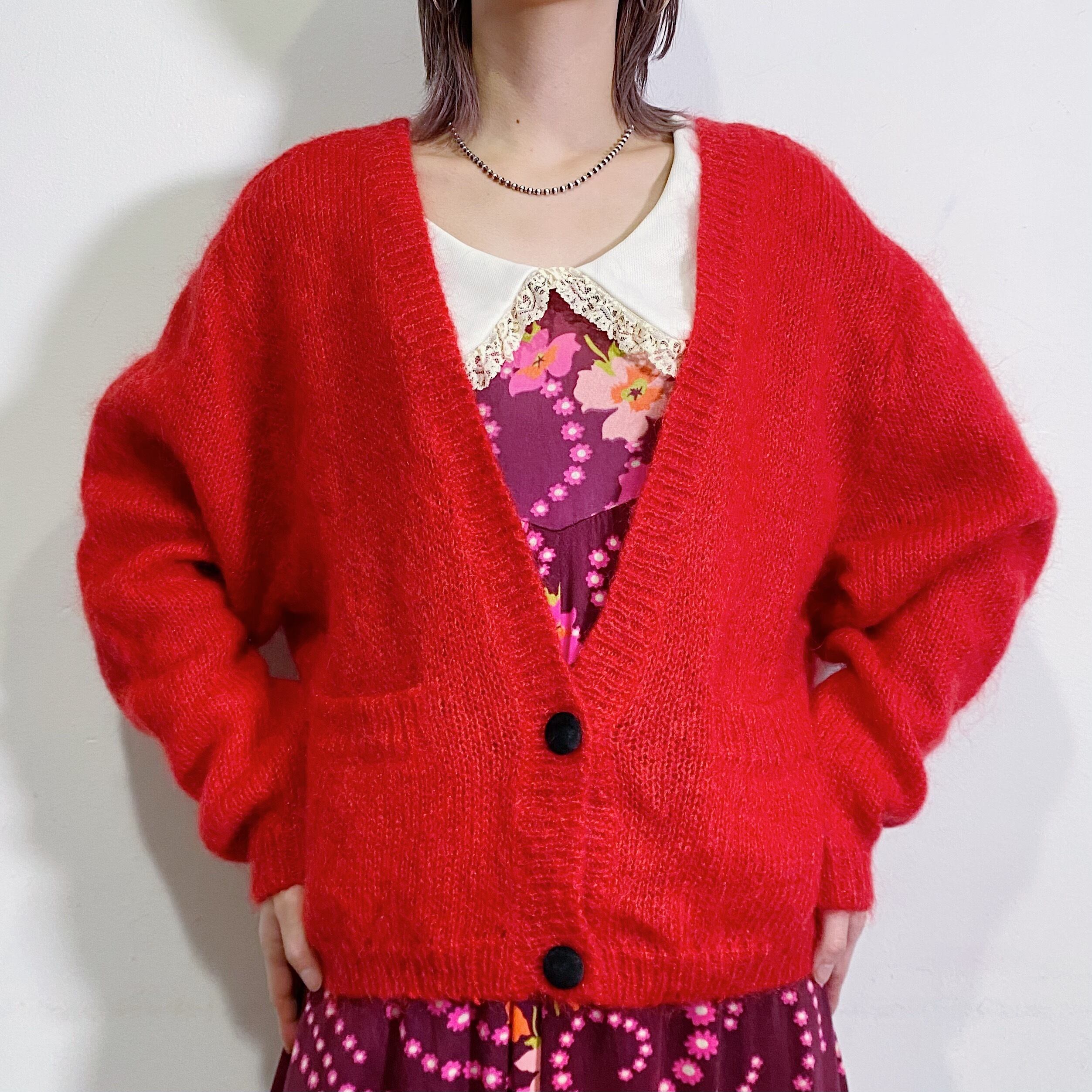 鮮やかなレッドカラーがパッと目を惹く、80年代のモヘアニットカーディガンです。