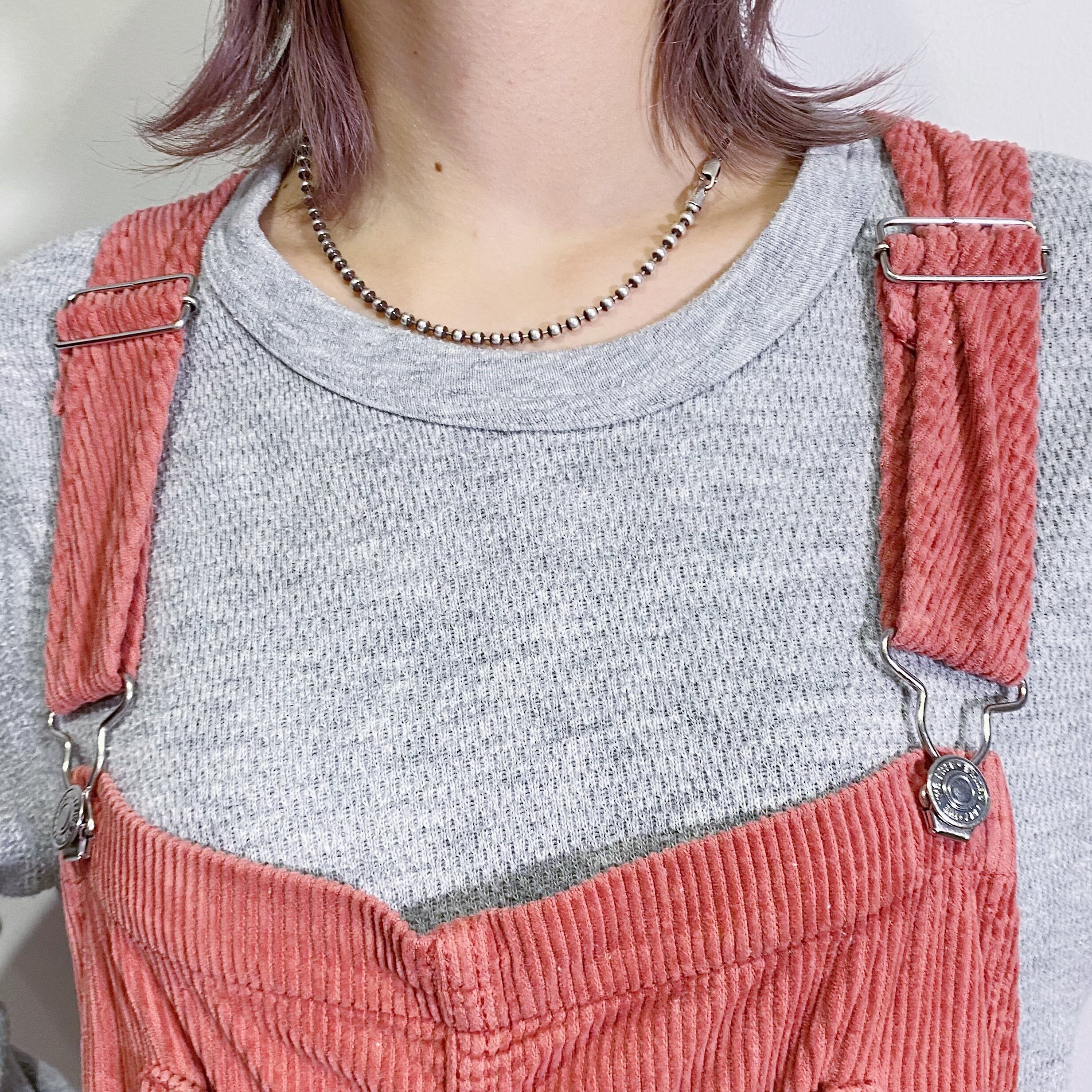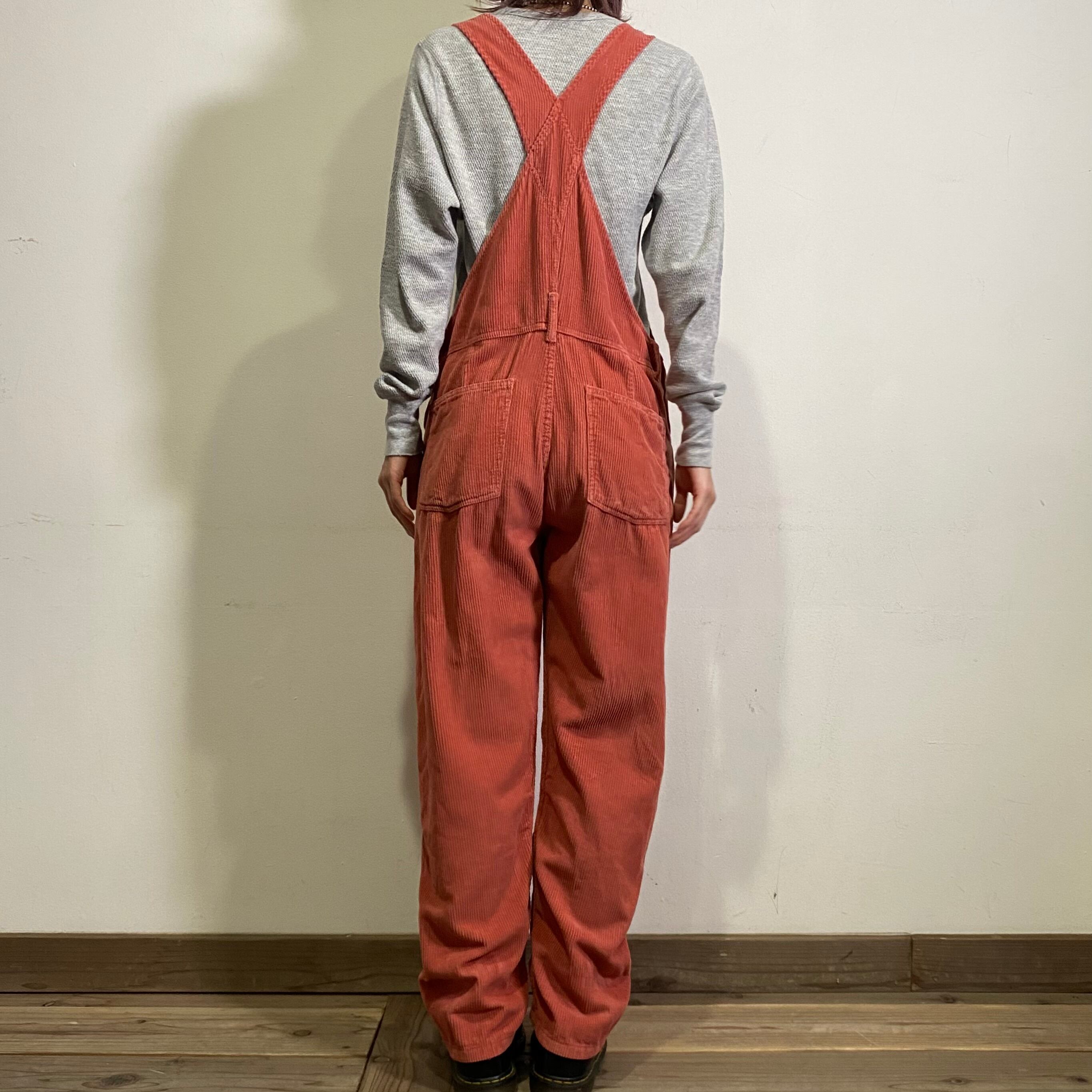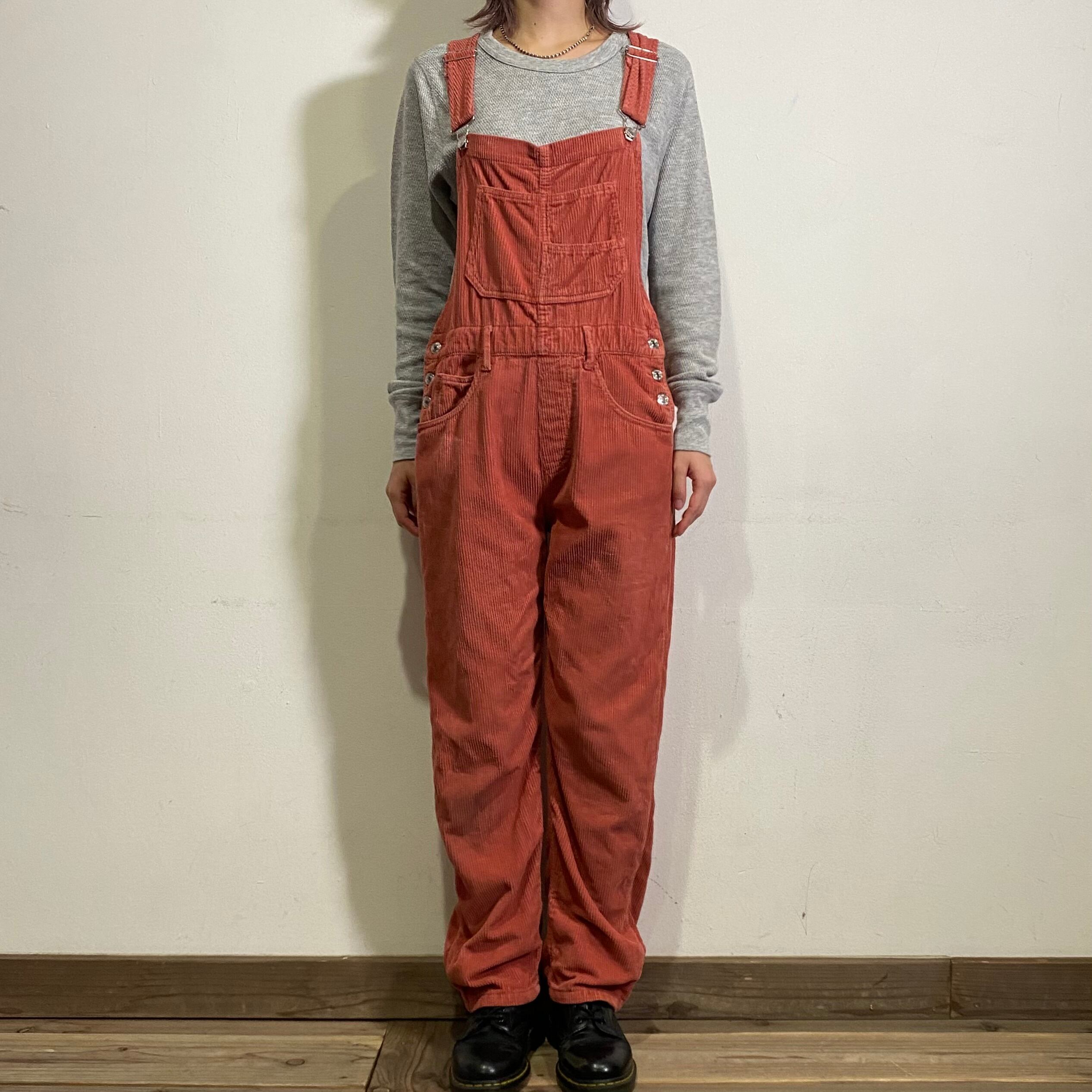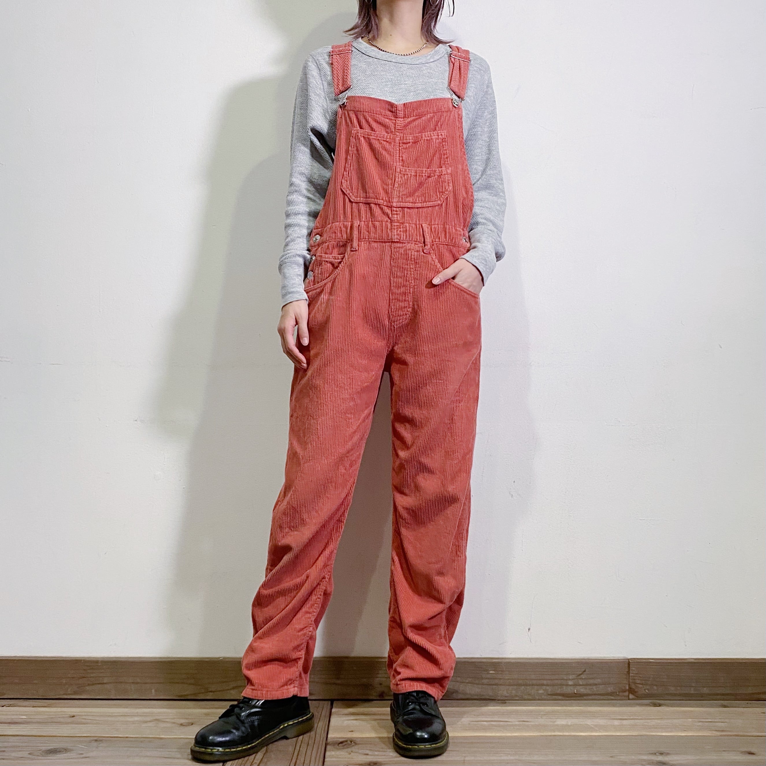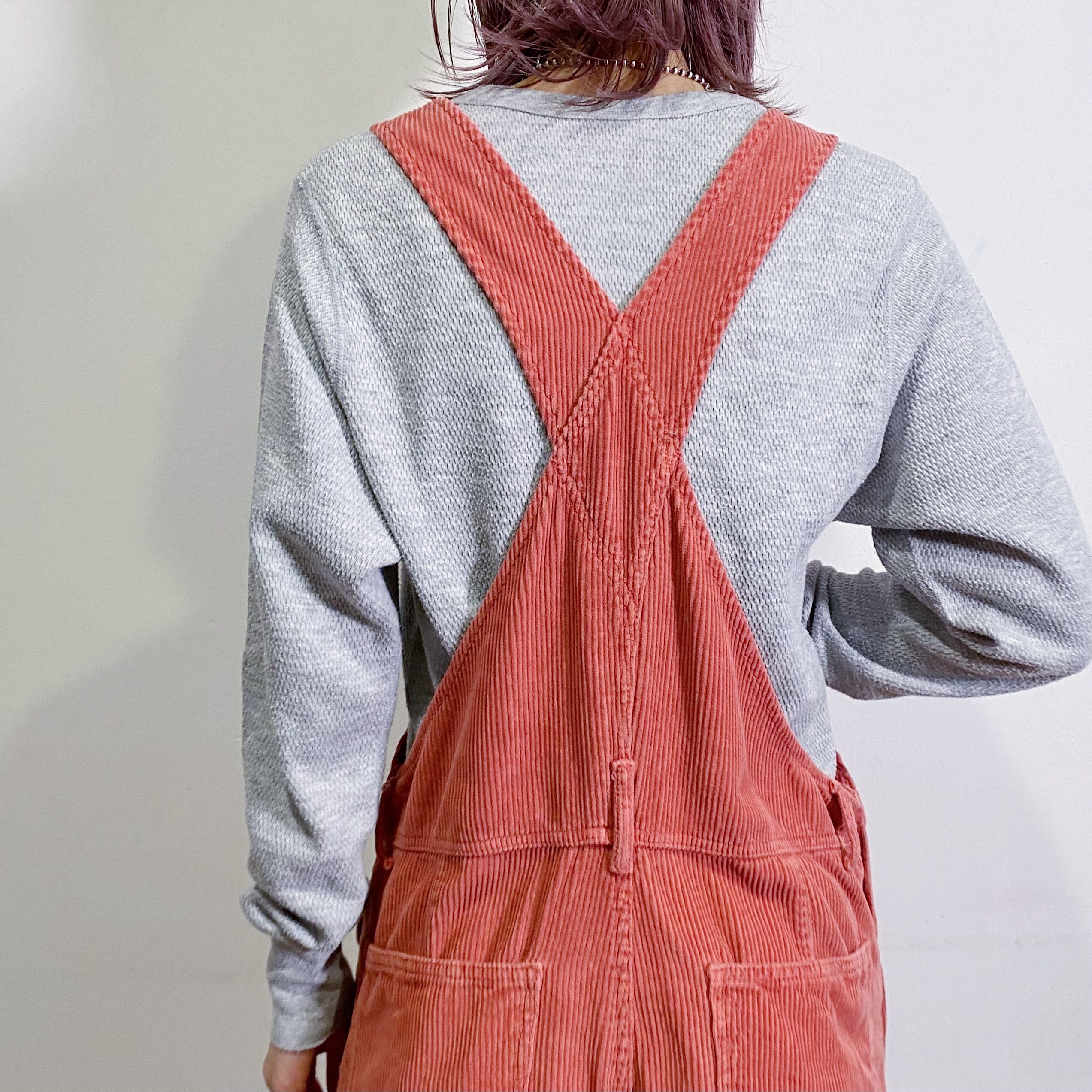 サーモンピンクの色合いが可愛い、コーデュロイ地のオーバーオールです。