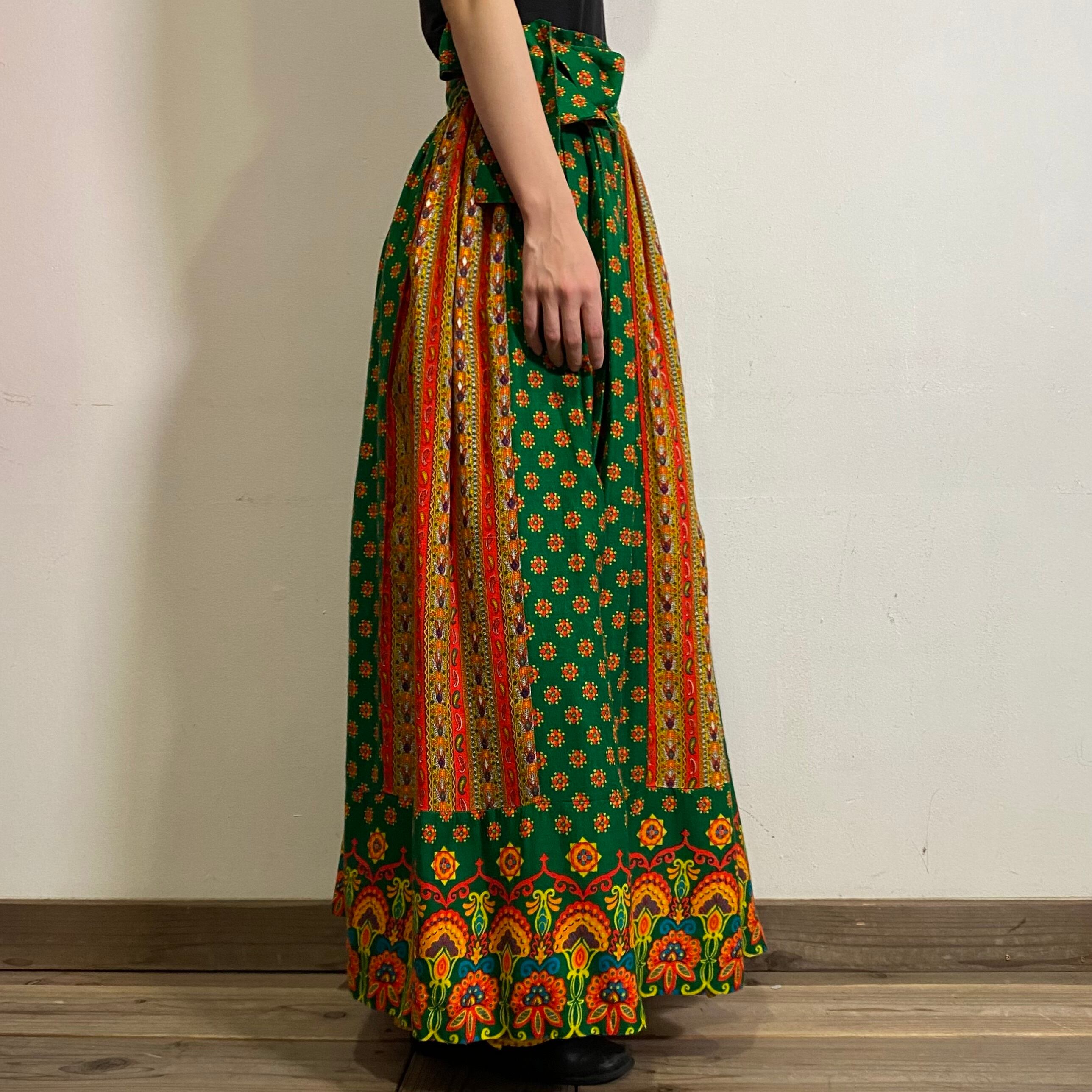イエロー×グリーンの色合いのペイズリーやお花柄が可愛い、70年代のロングスカートです。