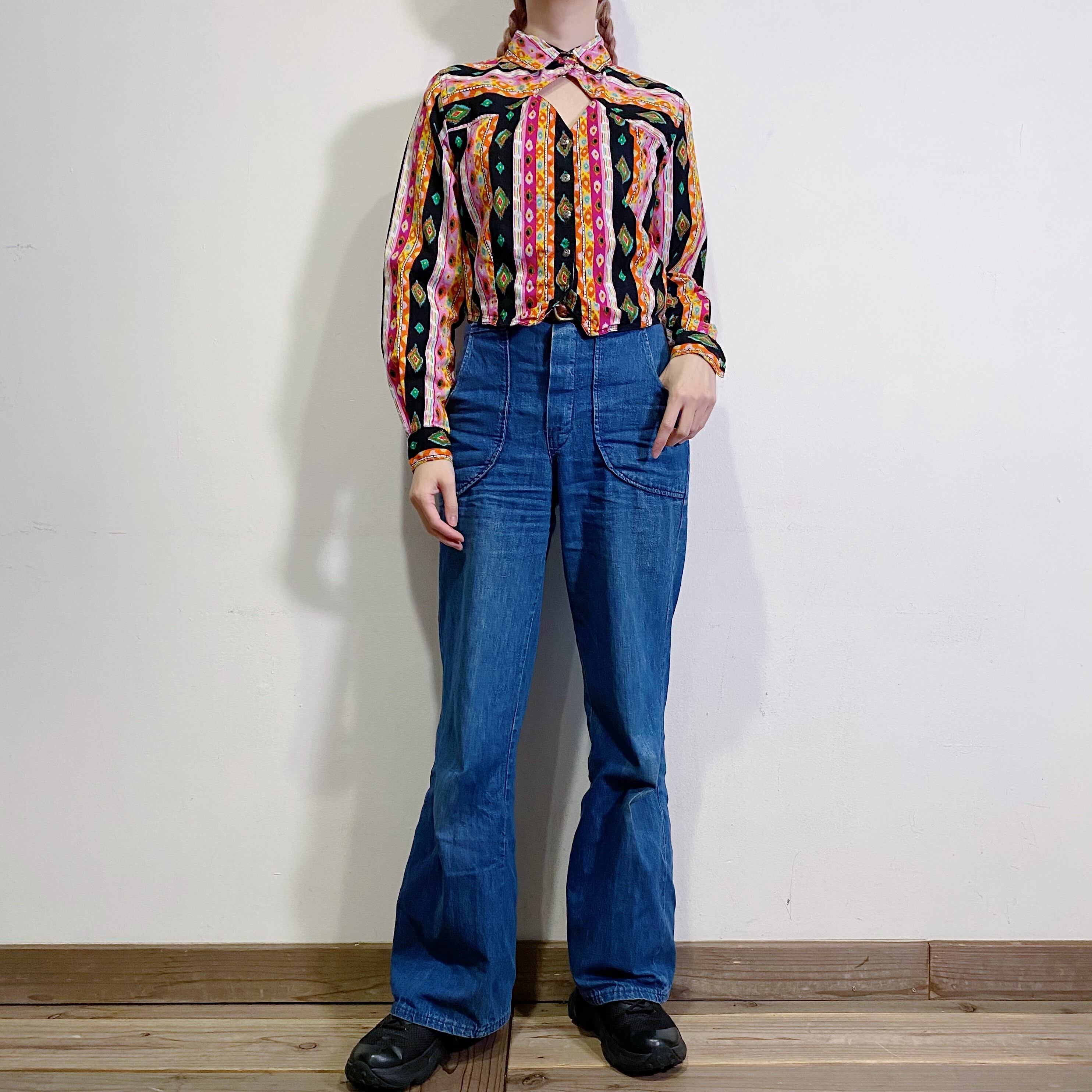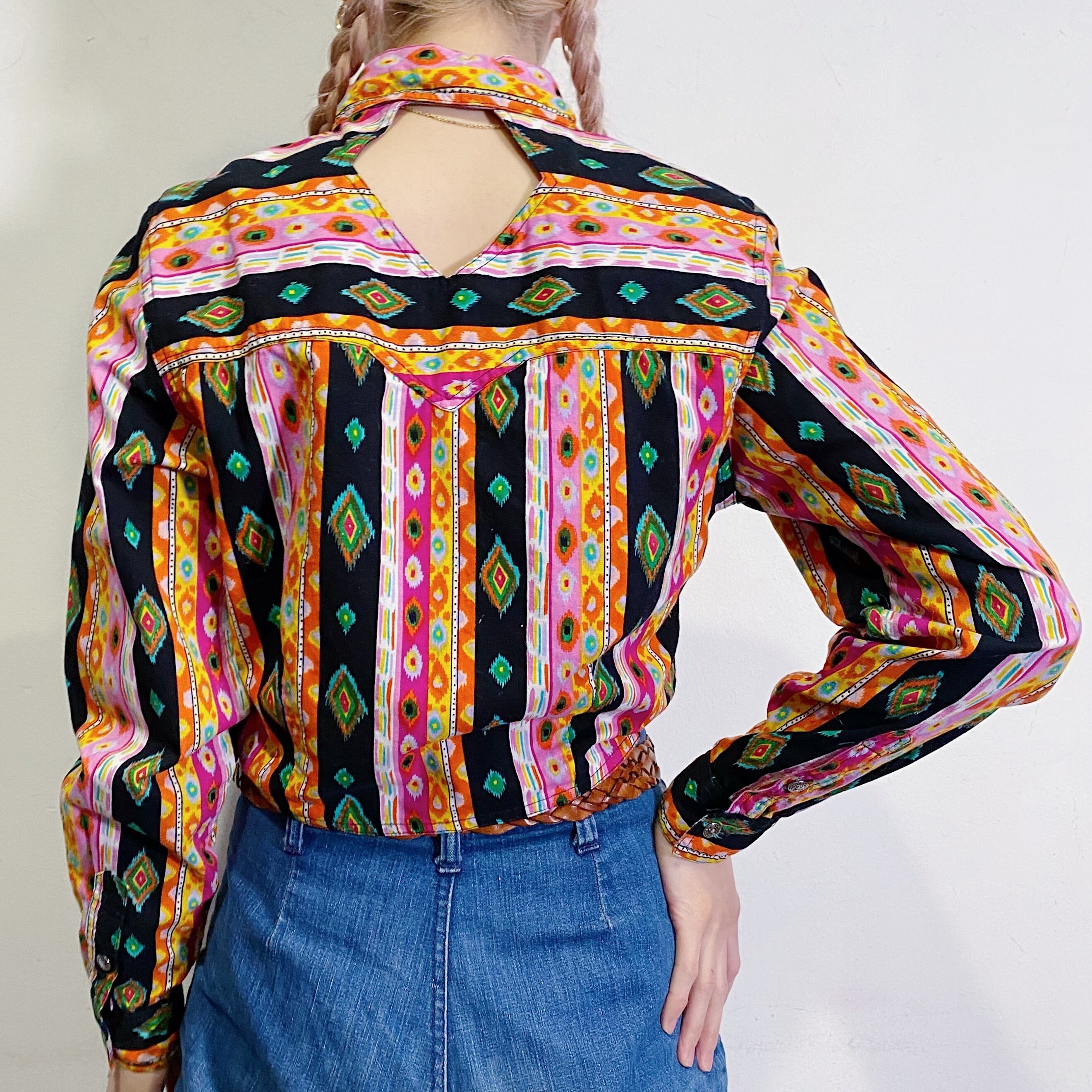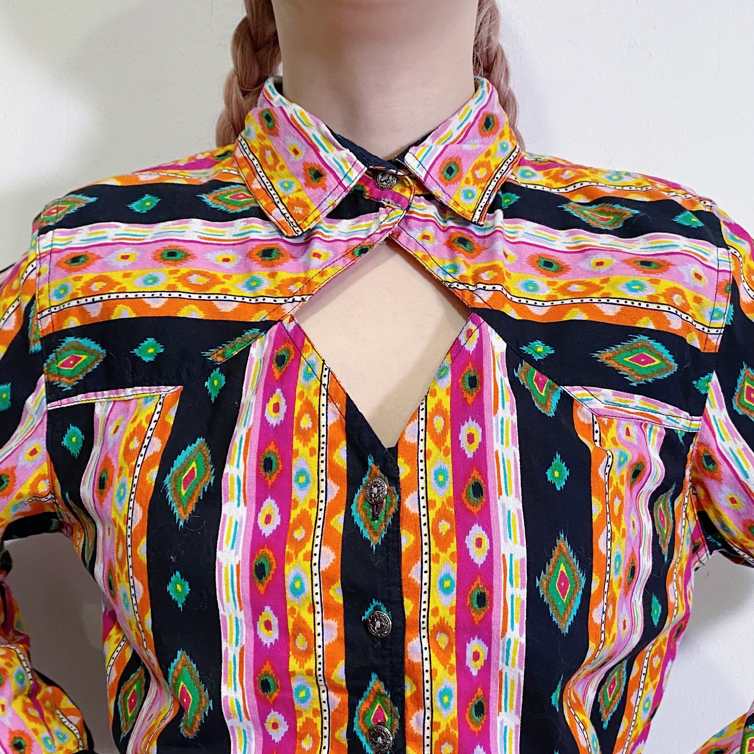 カラフルなネイティブ柄に前後のヘルシーな肌見せが可愛い、80年代の長袖シャツです。