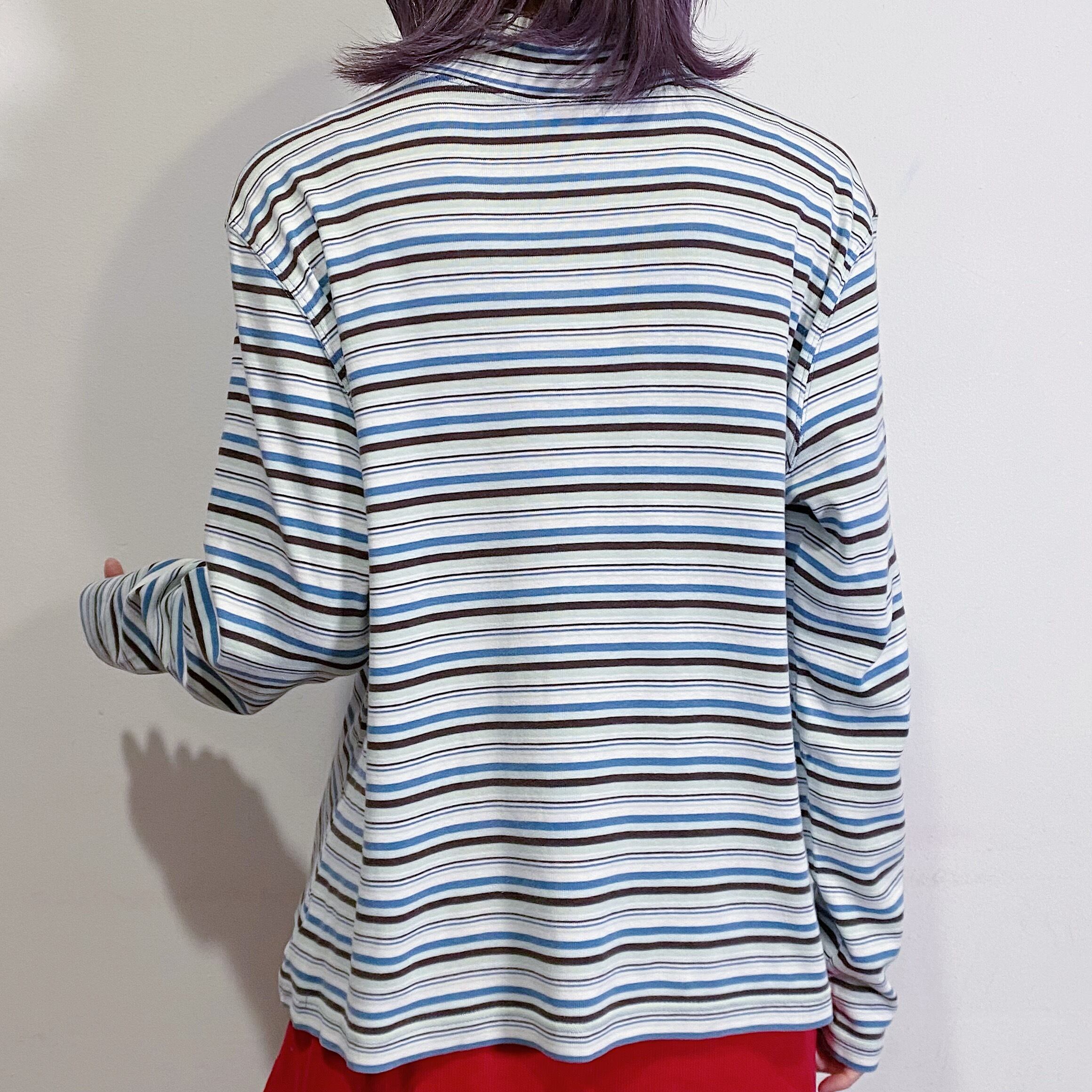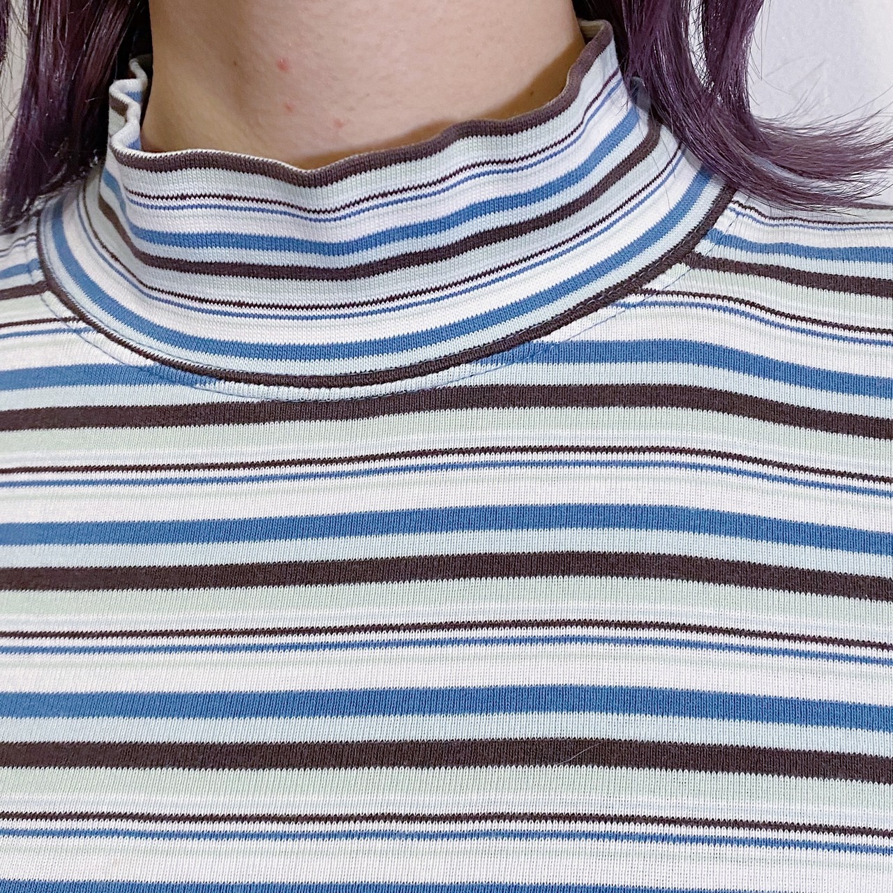 サックスブルーのボーダーが可愛い、ハイネックトップスです。