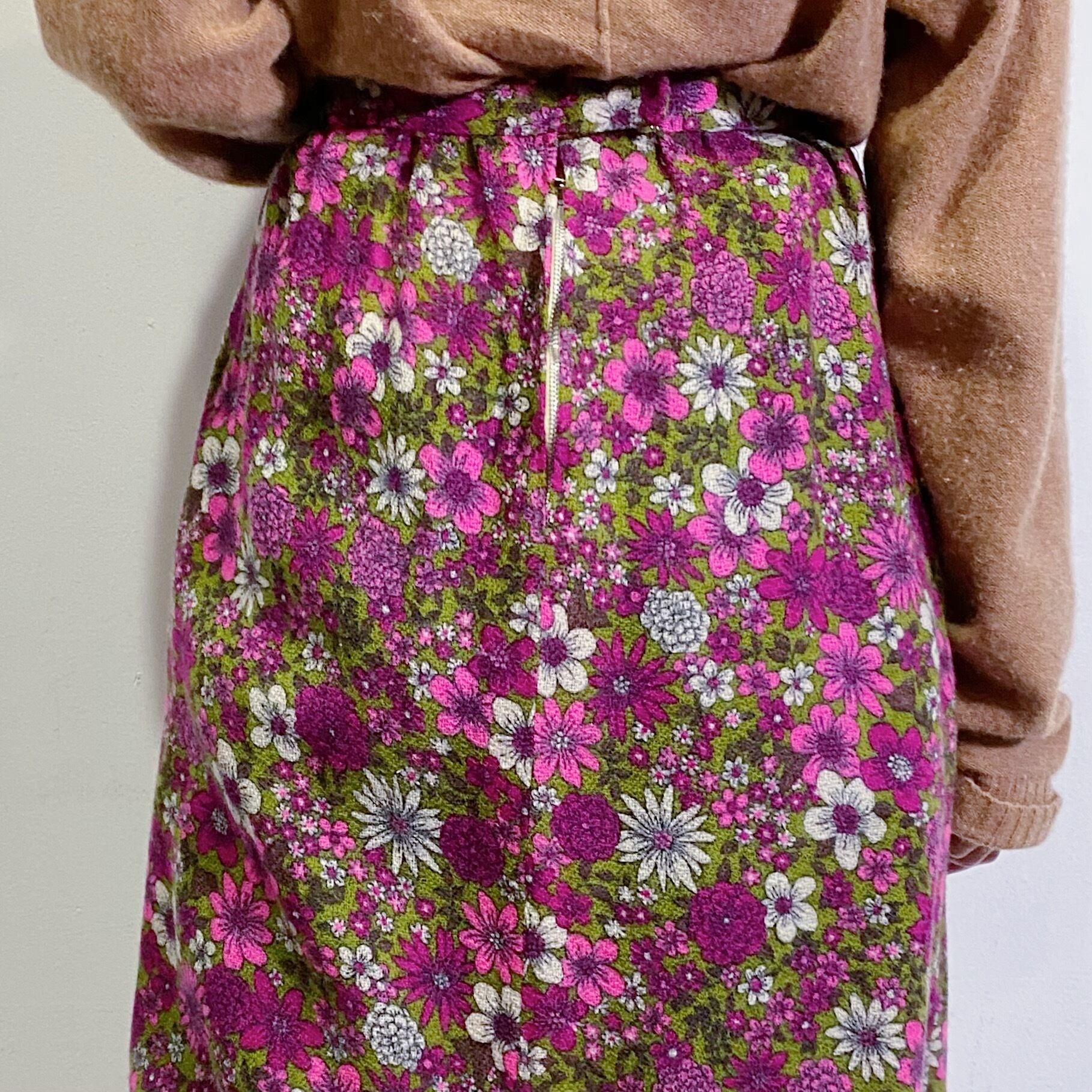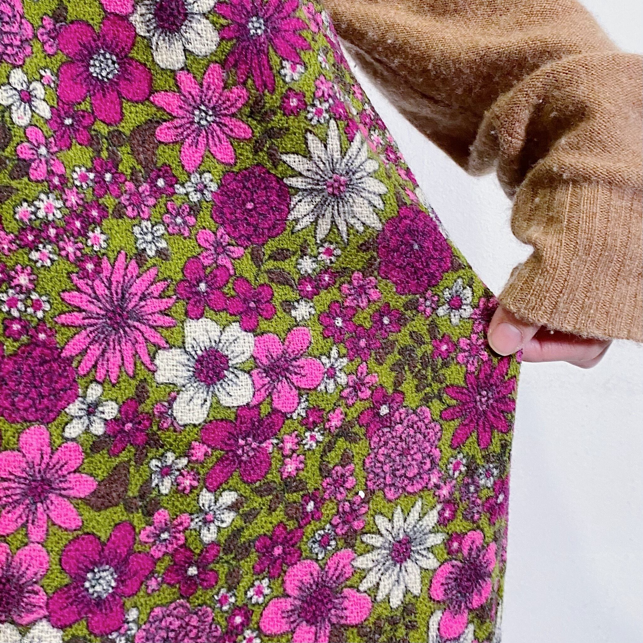 グリーンベースにピンクの花柄が可愛い、60年代のスカートです。