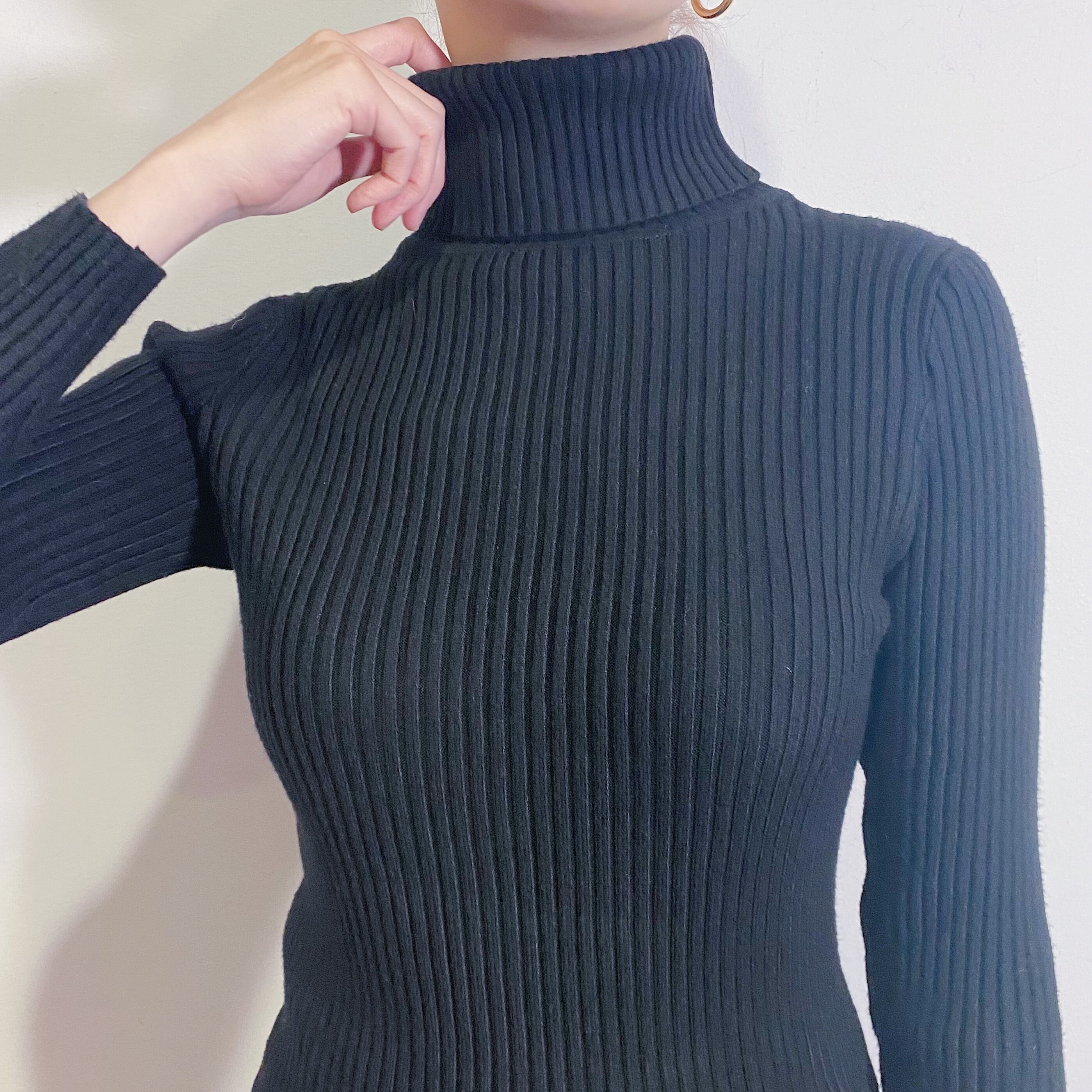 シンプルで使い勝手のいい、ブラックのタートルネックニットです。