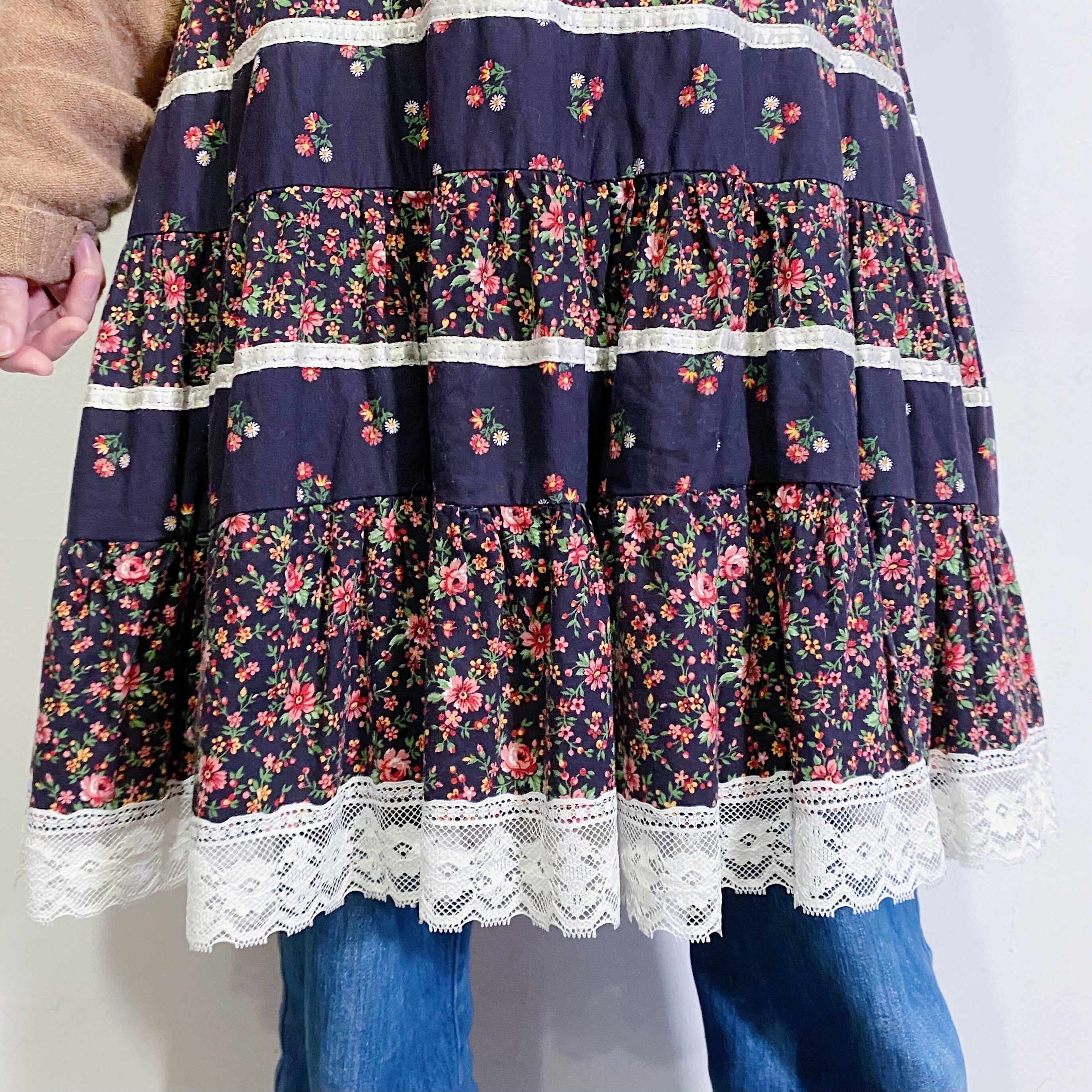ブラックのとピンクレッドの小花柄が可愛い、70年代のスカートです。