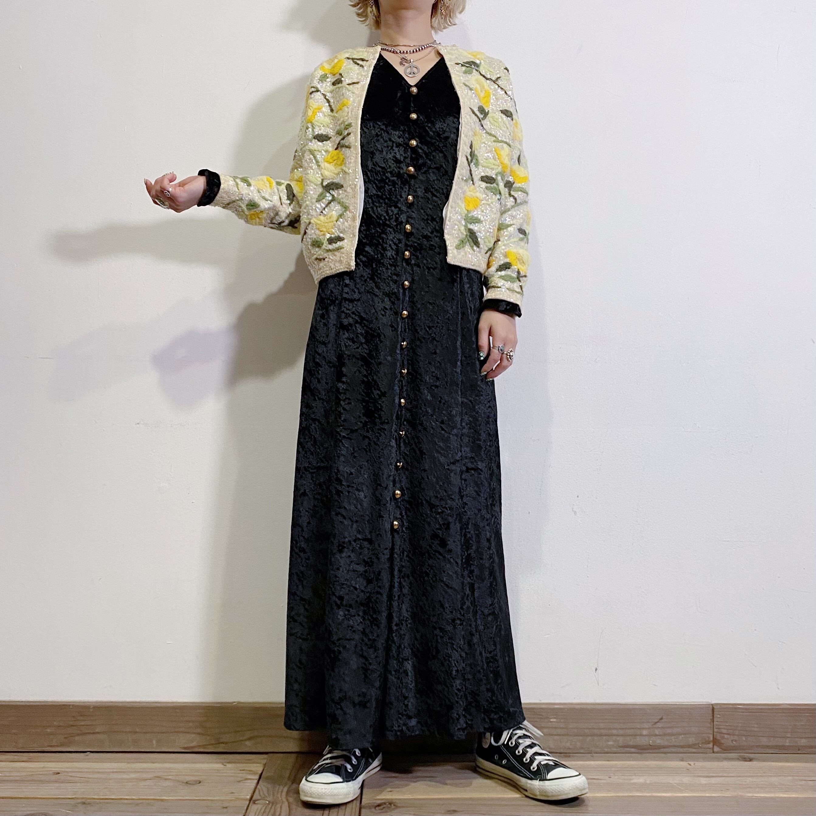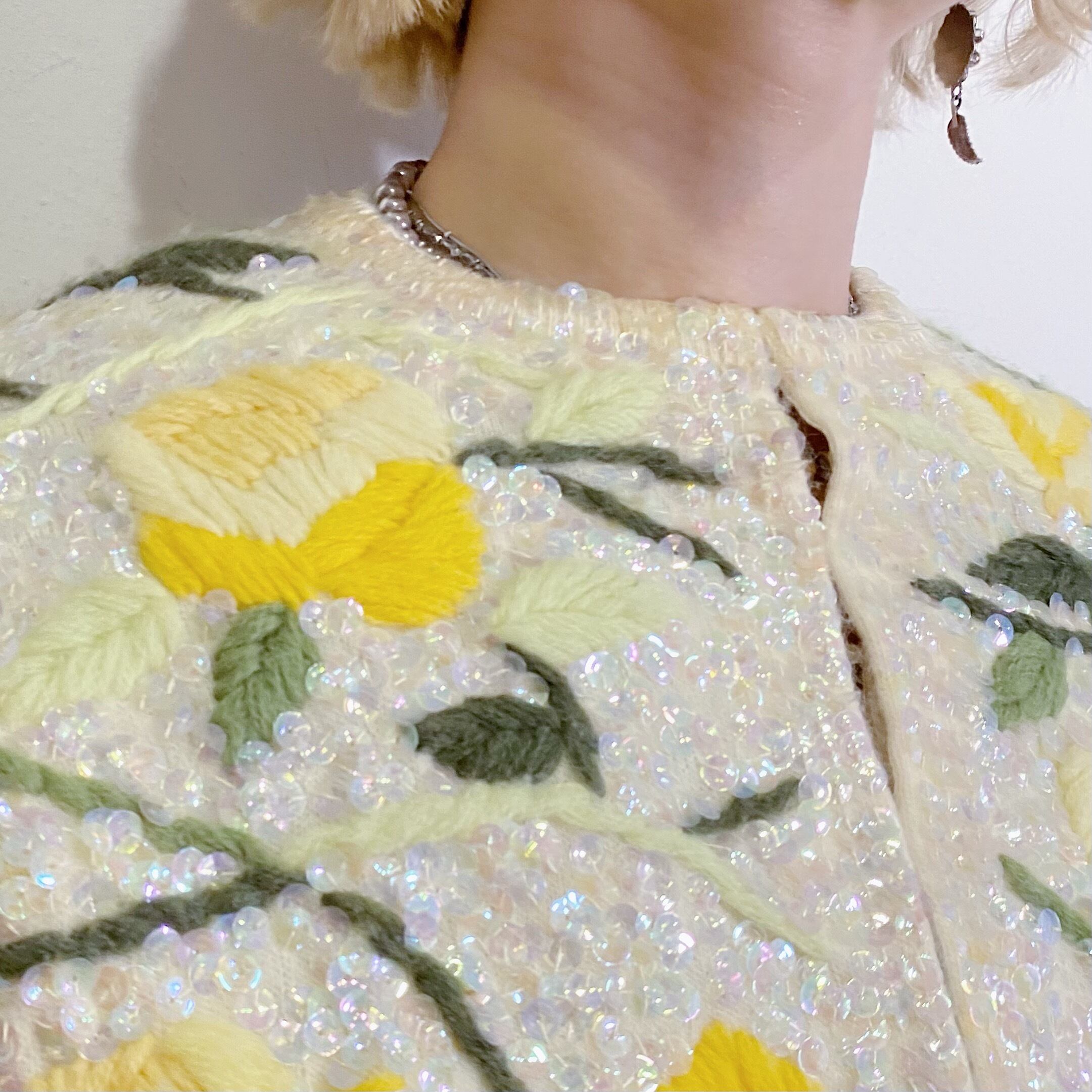 びっしりと埋め尽くされたスパンコールと立体的なお花の手刺繍がとても可愛い、50年代のカーディガンです。