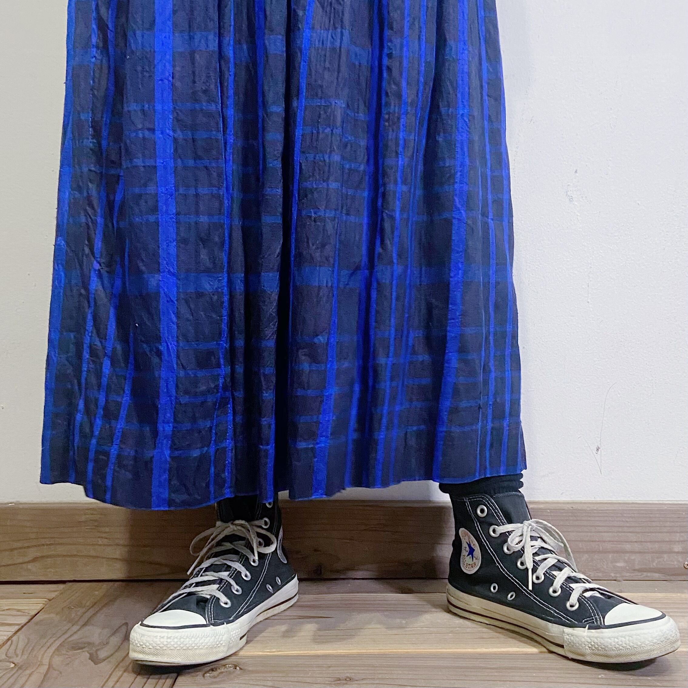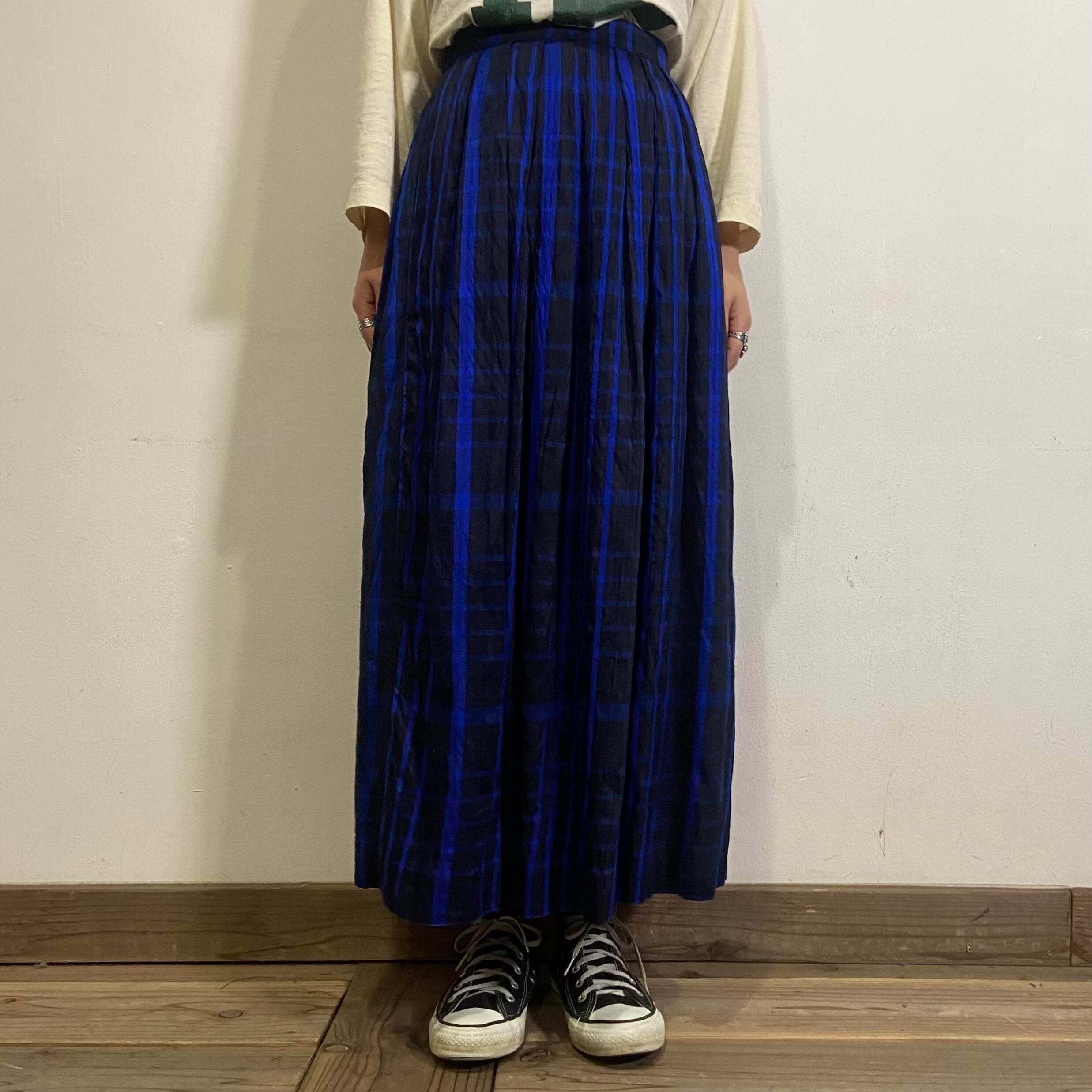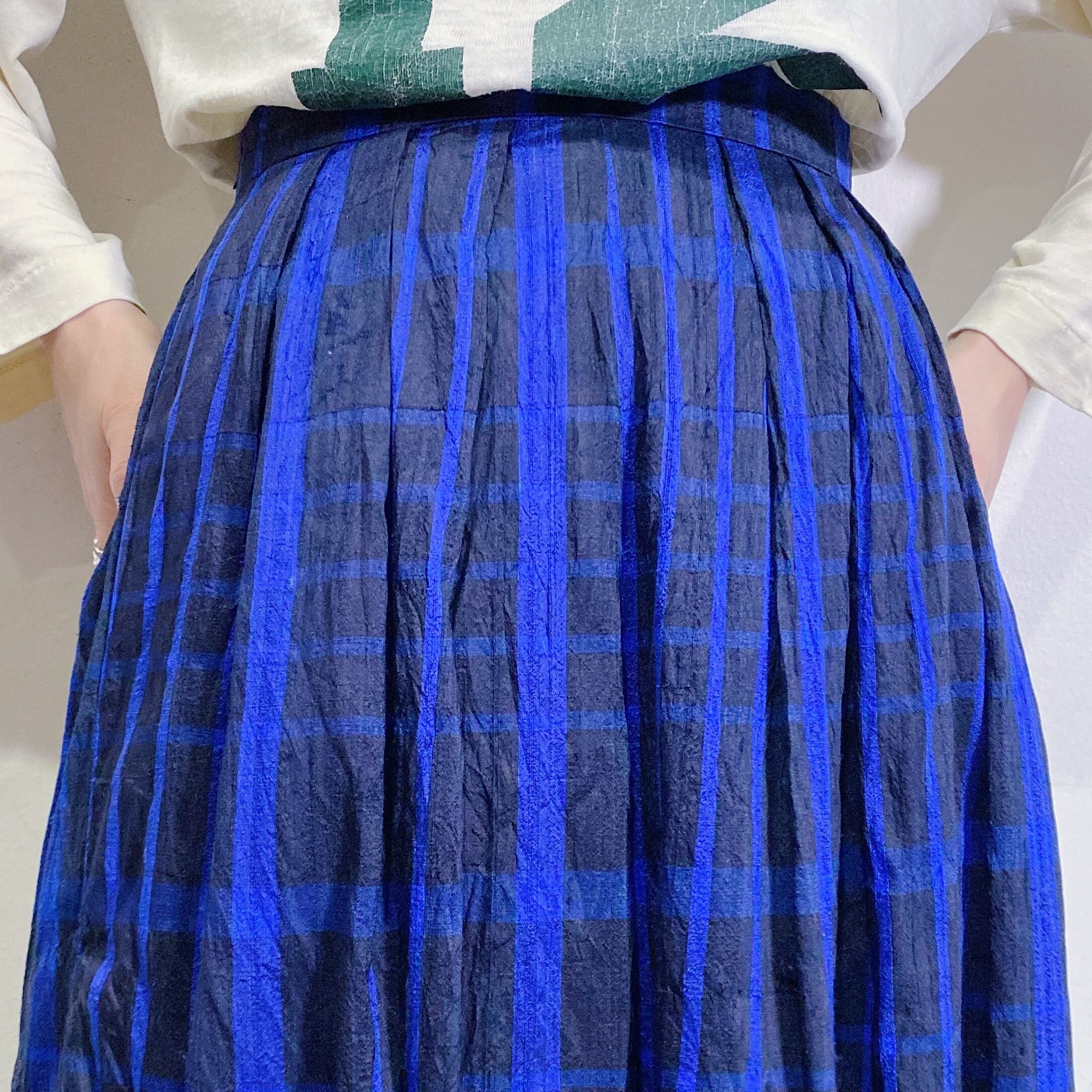 80s blue plaid silk long skirt