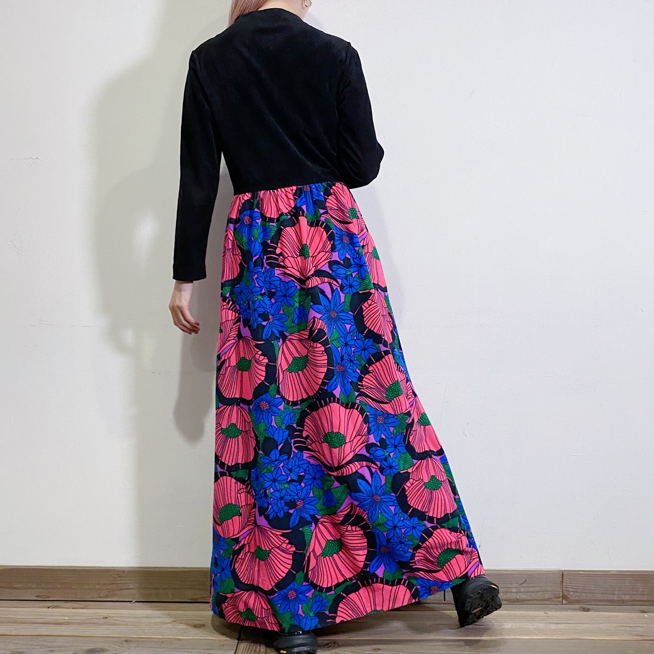 ブラックの切り替えにピンクやブルーの花柄が映える、70年代のワンピースです。