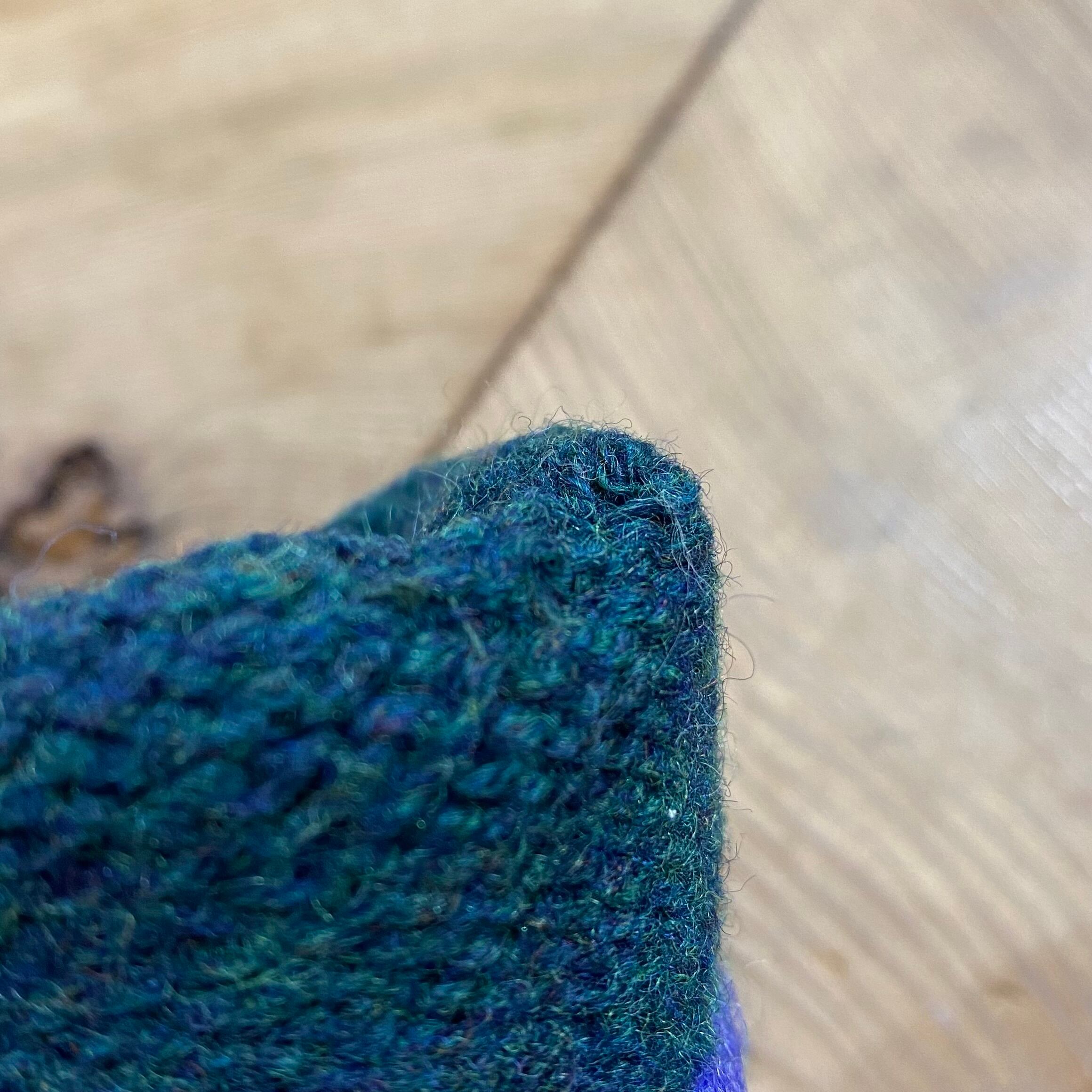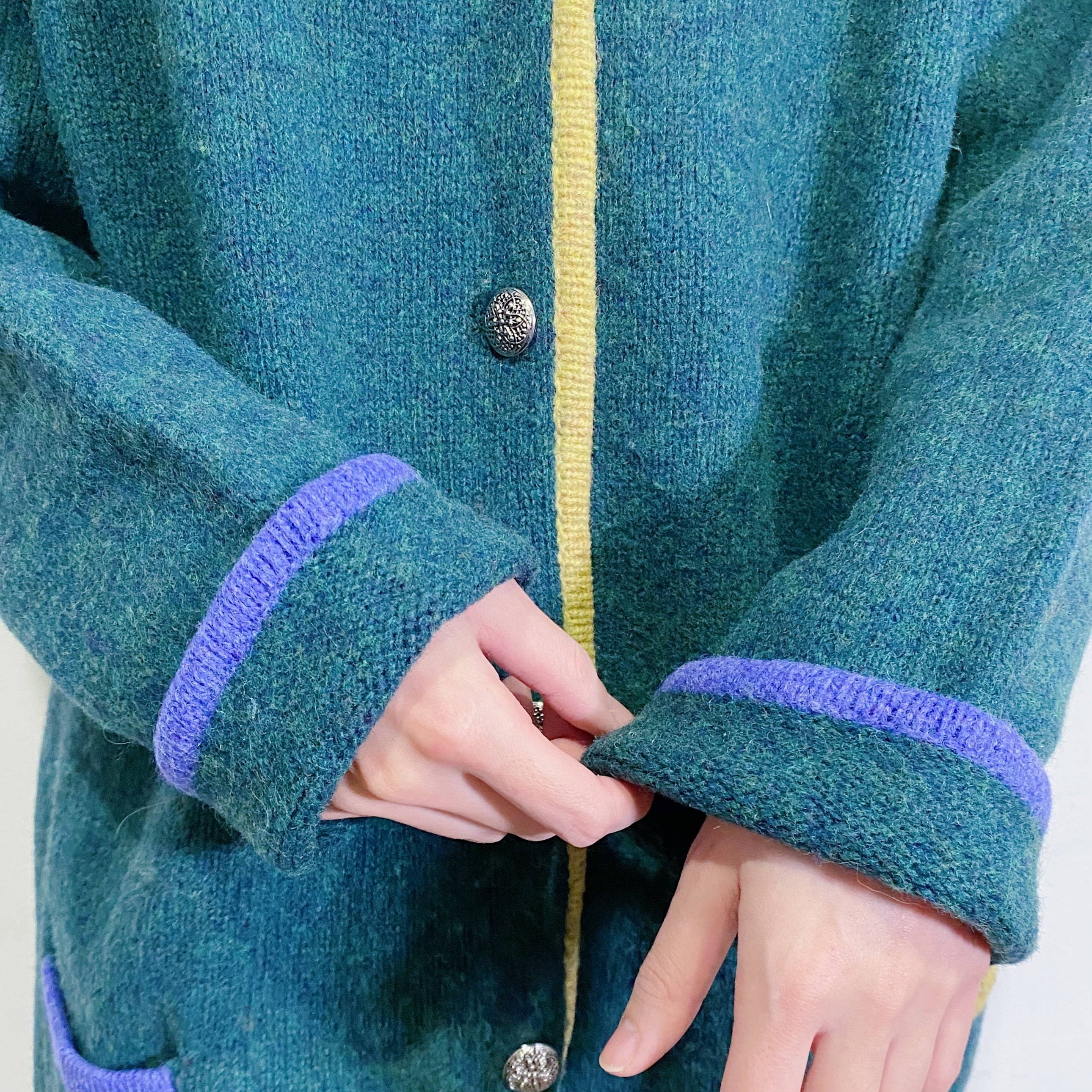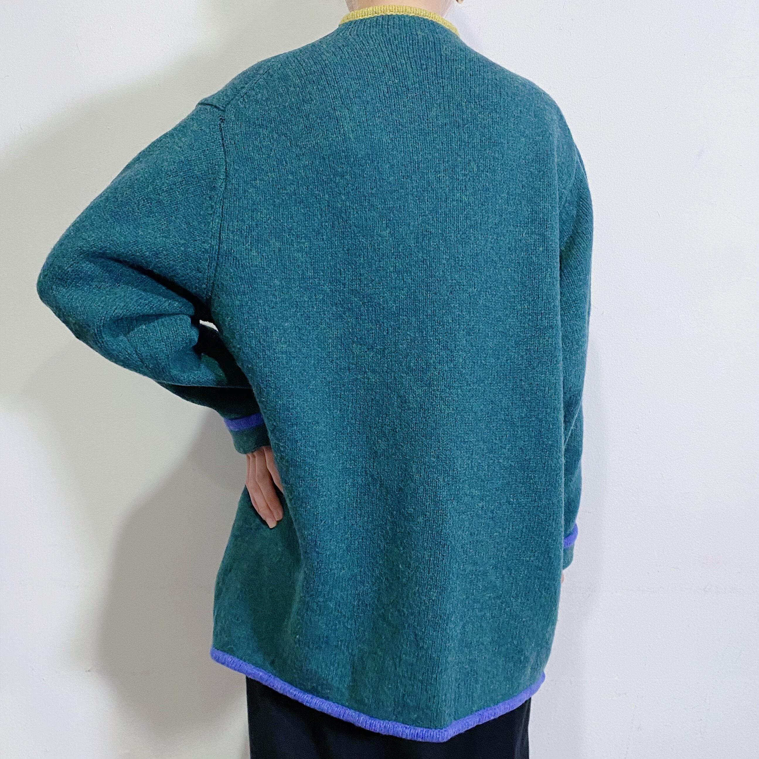 こっくりとした色合いのグリーンにイエロー、ピンク、ブルーのラインがポイントになった、ベネトンのニットカーディガンです。