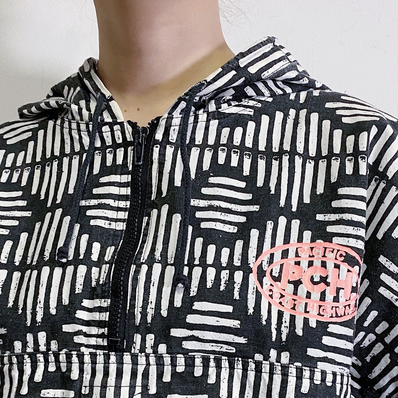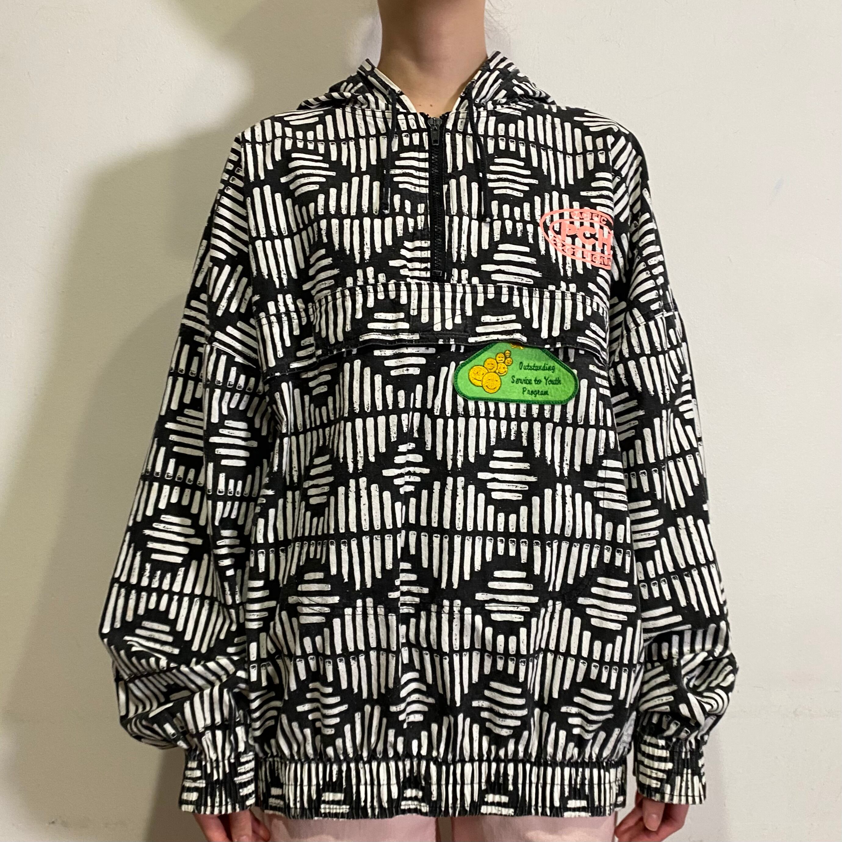 フロントのロゴやワッペンが可愛い、80年代のフード付きトップスです。