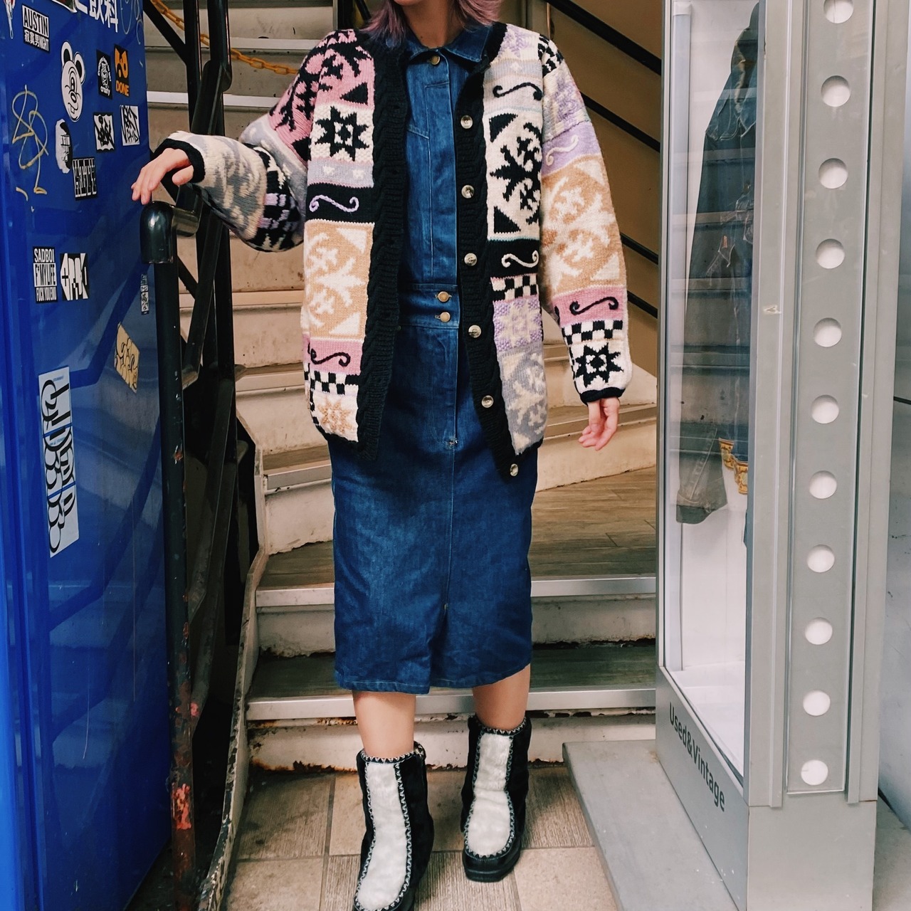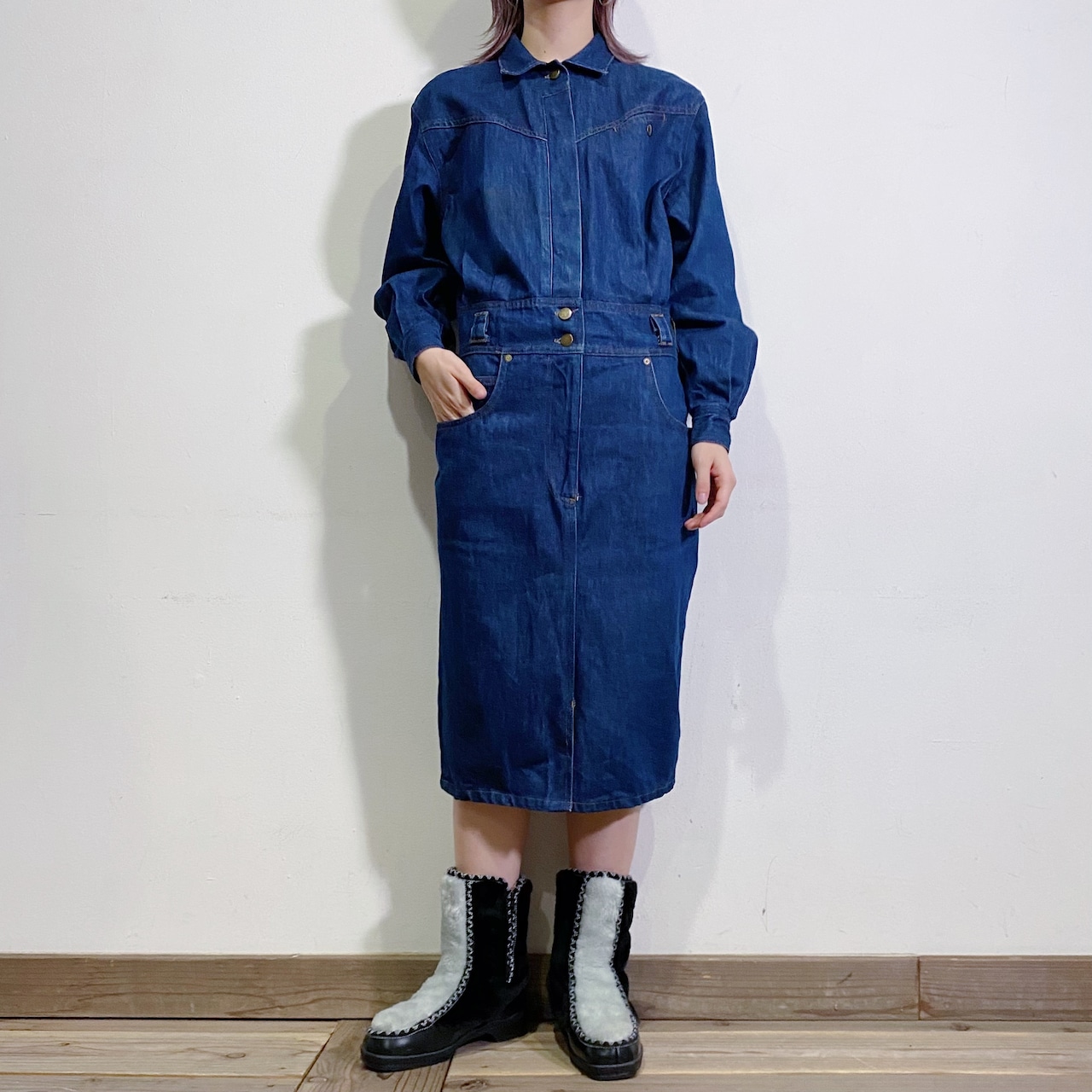 インディゴブルーカラーのデニム生地にIラインシルエットで大人可愛い、80年代のワンピースです。