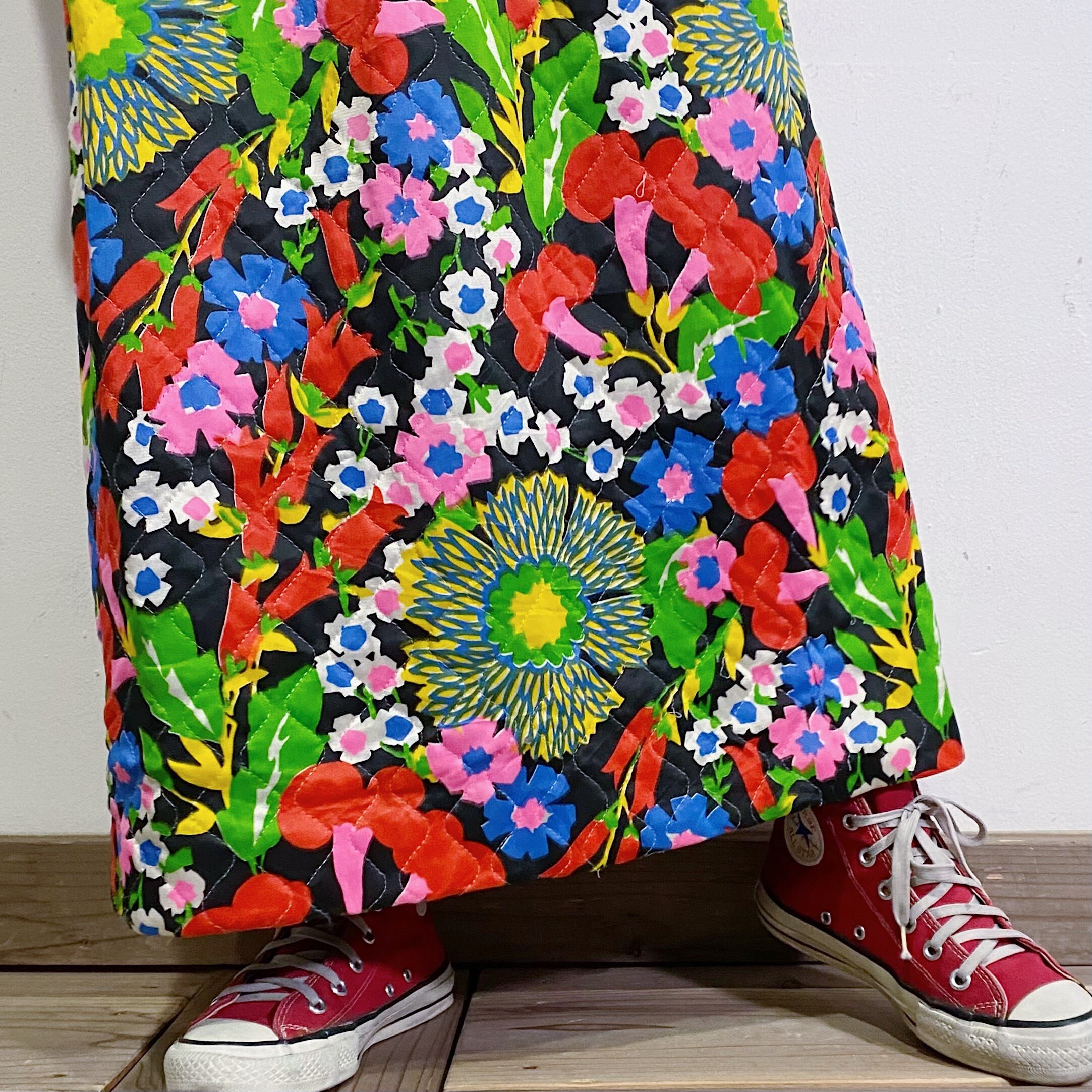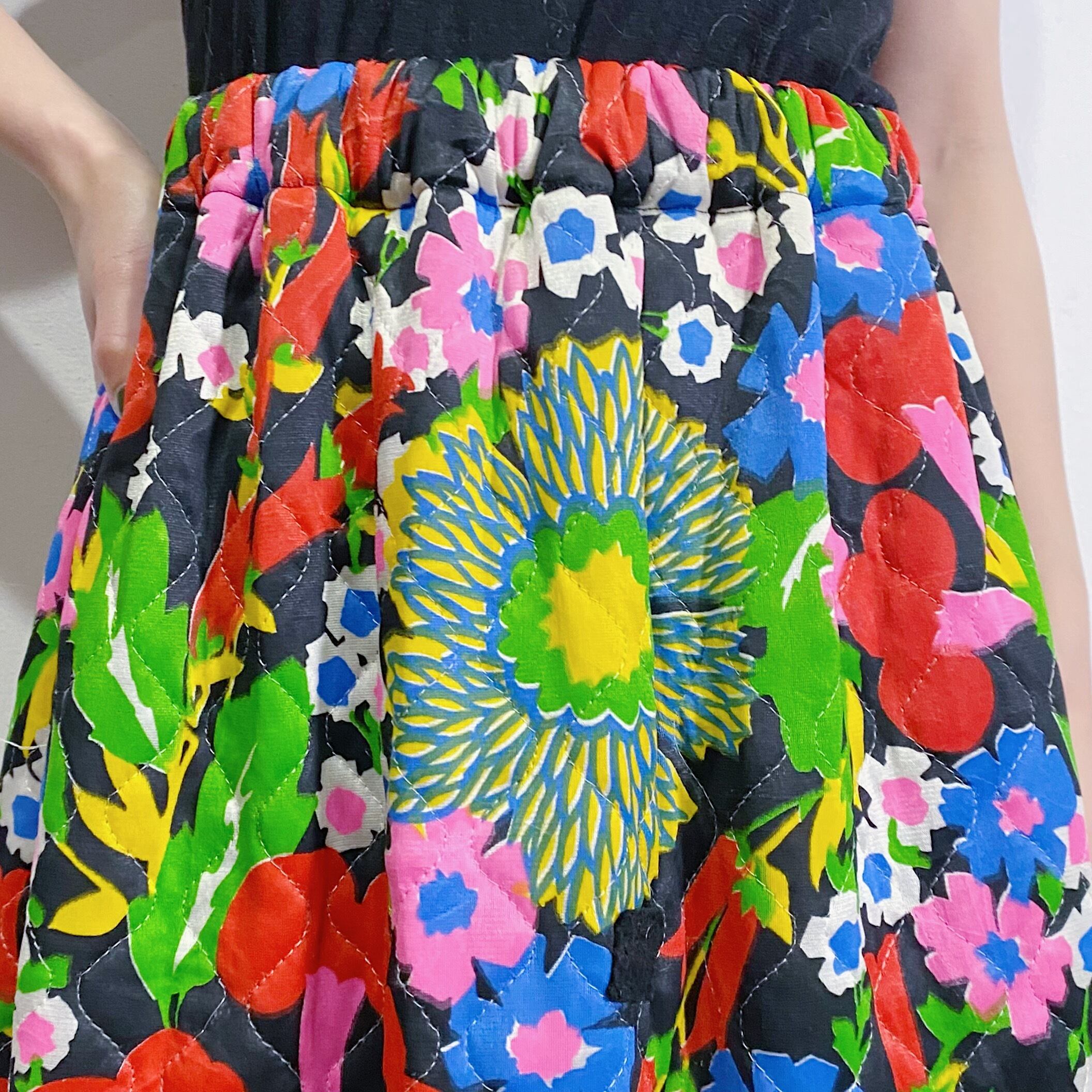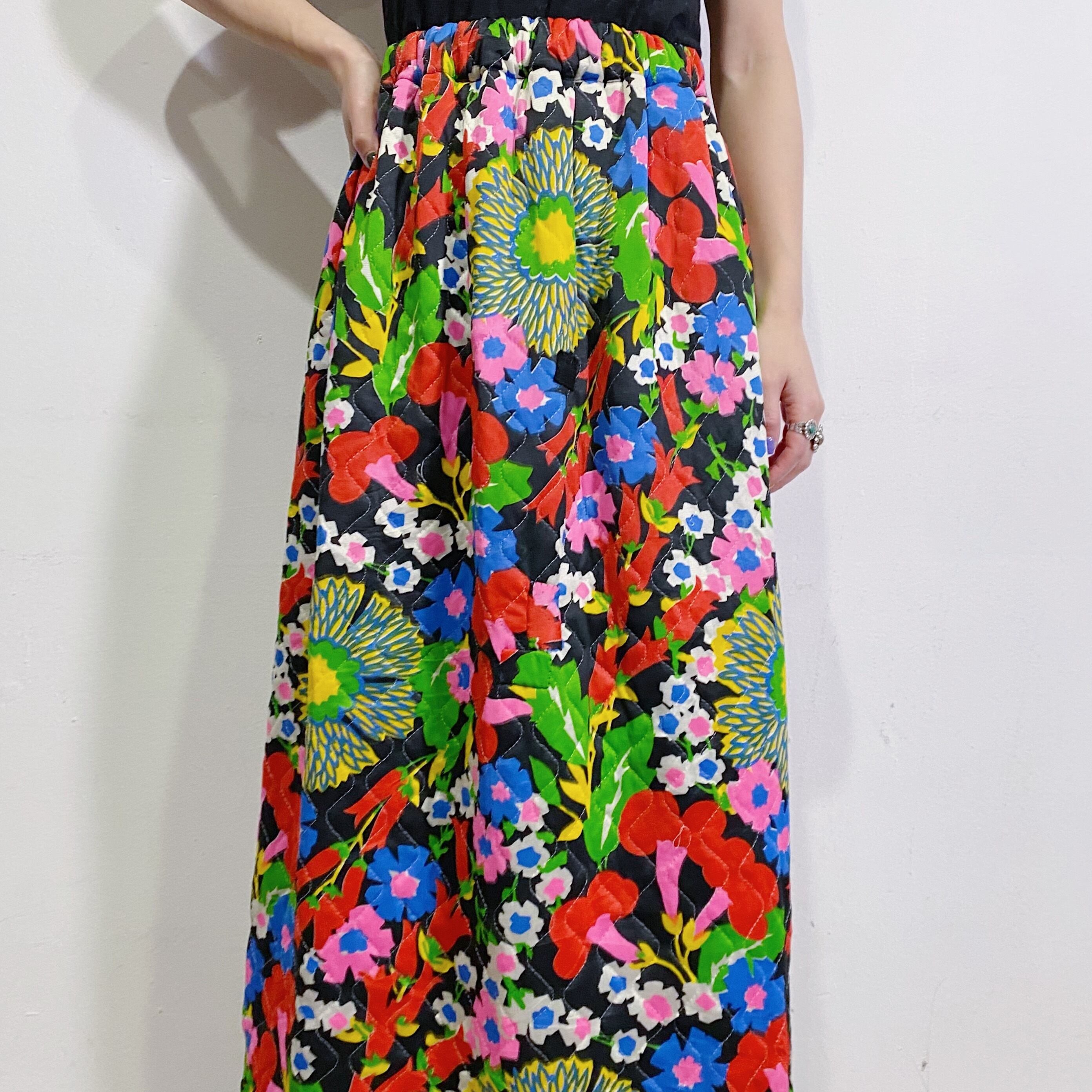 ブラックベースにカラフルな花柄が映える、70年代のスカートです。