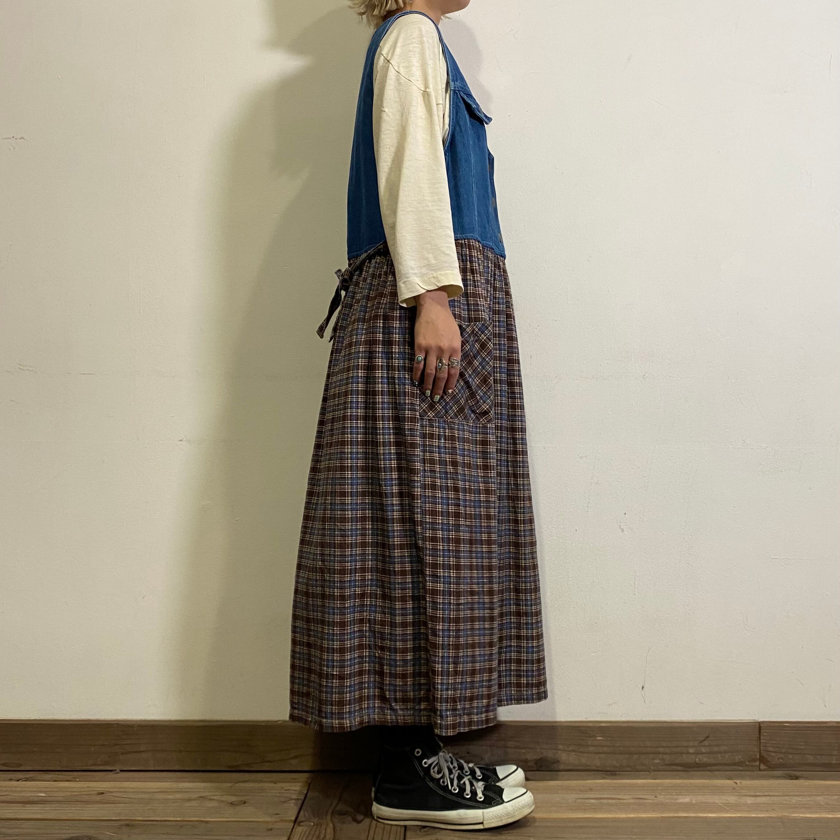 デニム生地とネルチェックの切り替えが可愛い、90年代のジャンパーワンピースです。