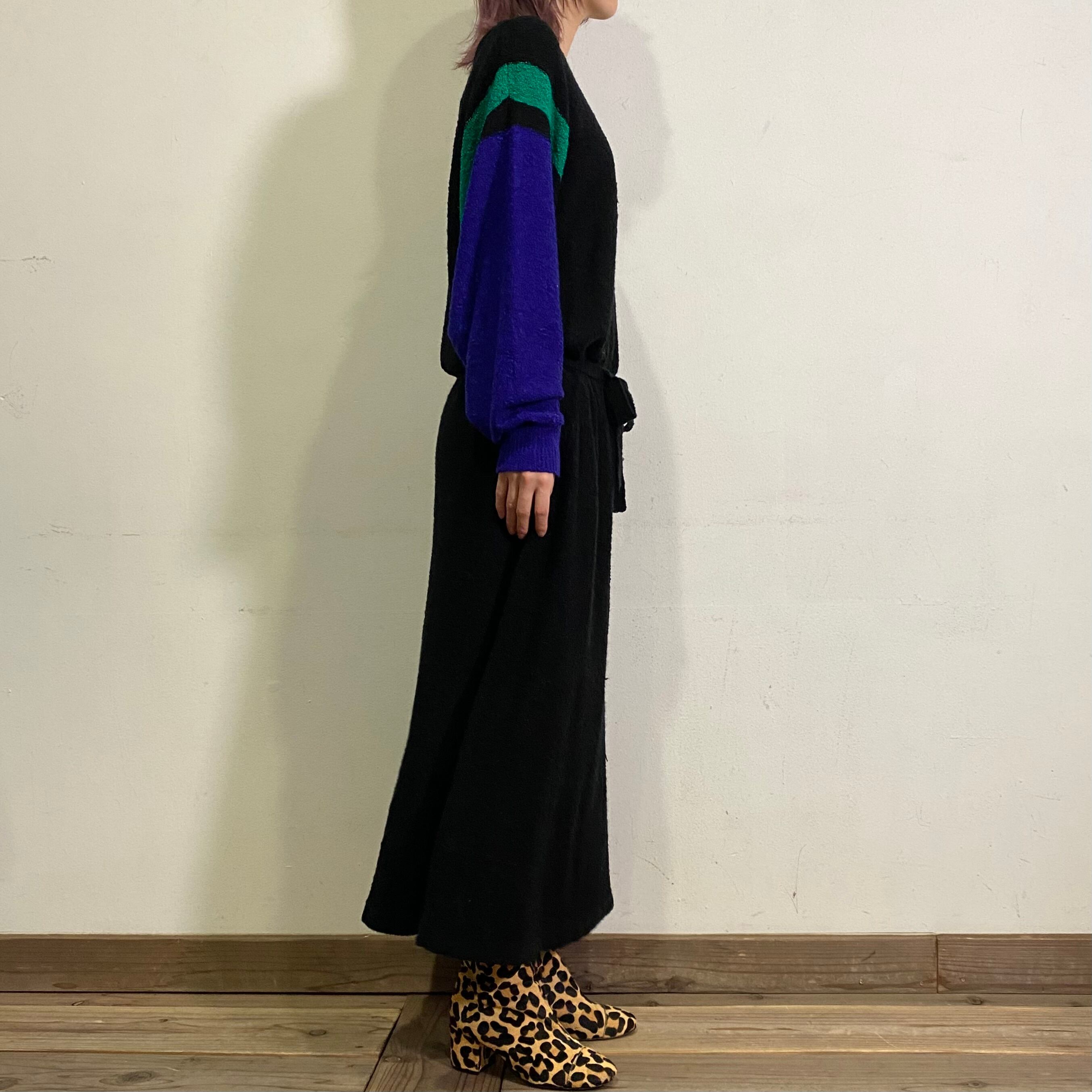 ブラックベースにグリーンとパープルの切り替えが映える、80年代のニットワンピースです。