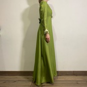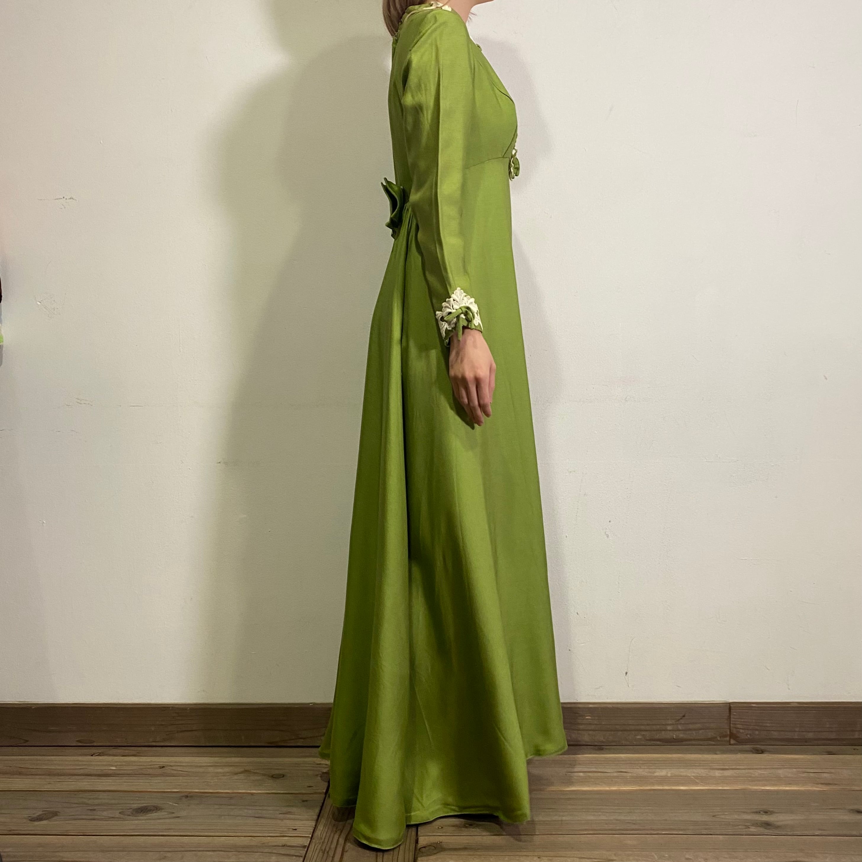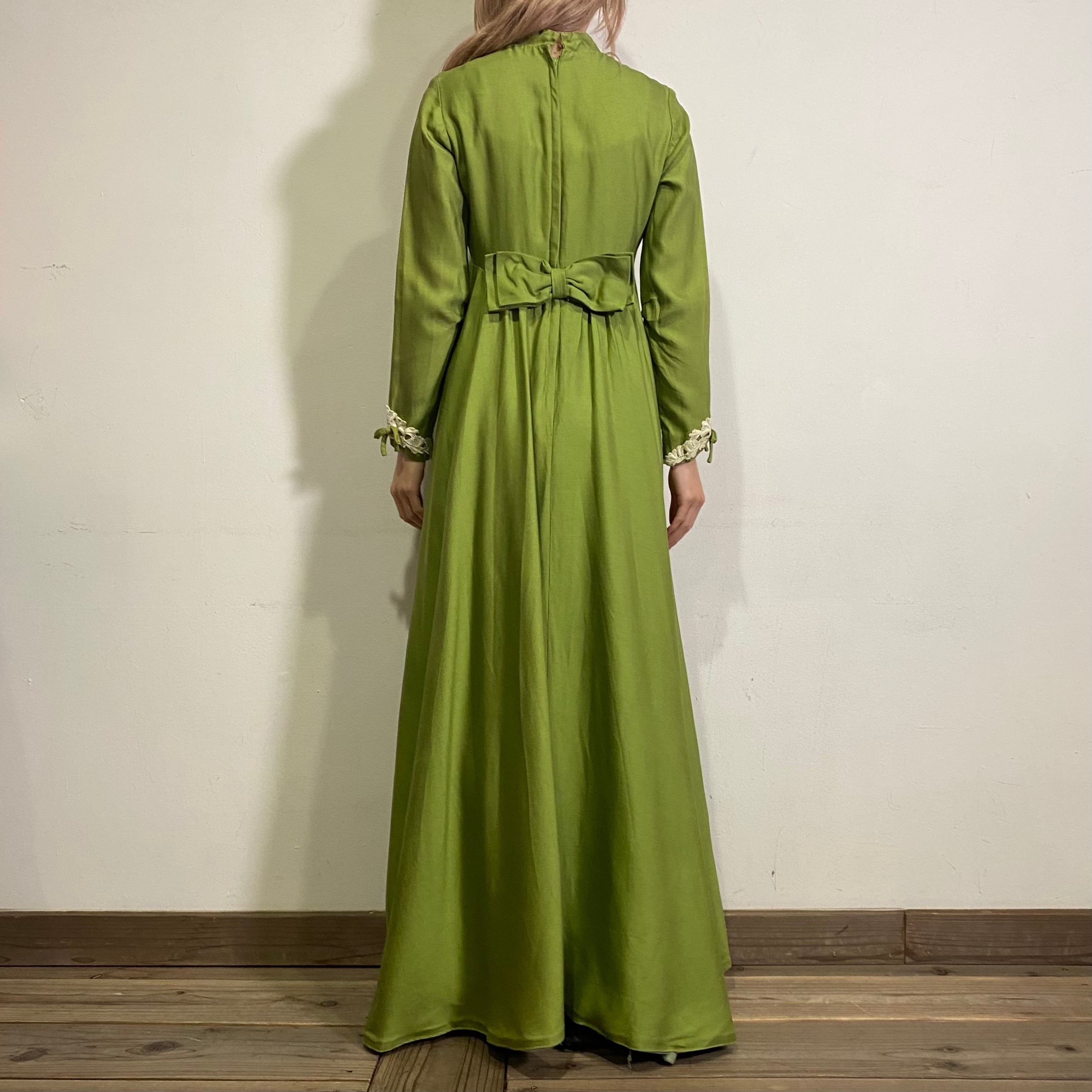 ピスタチオカラーとバテンレース使いが素敵な、70年代のロングワンピースです。