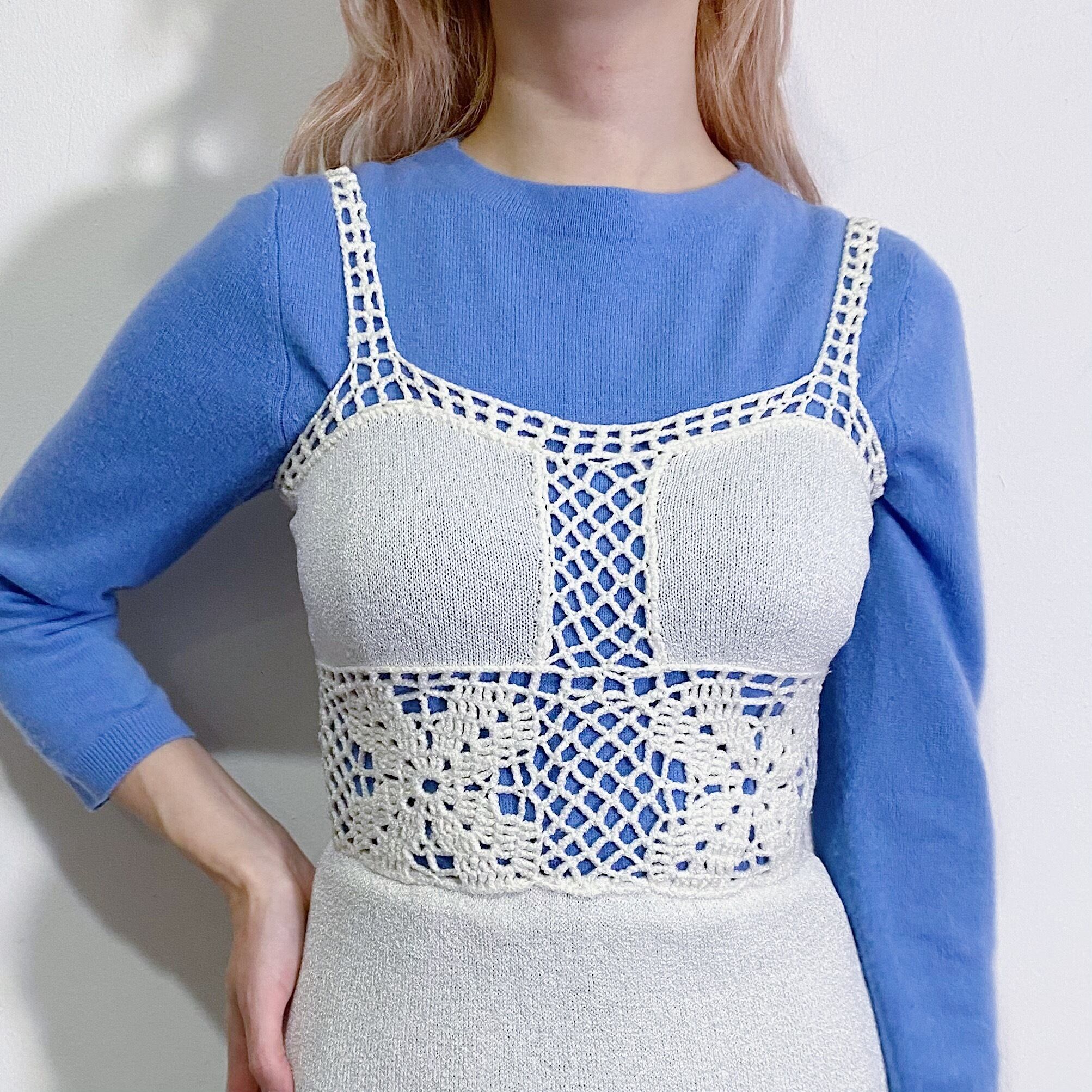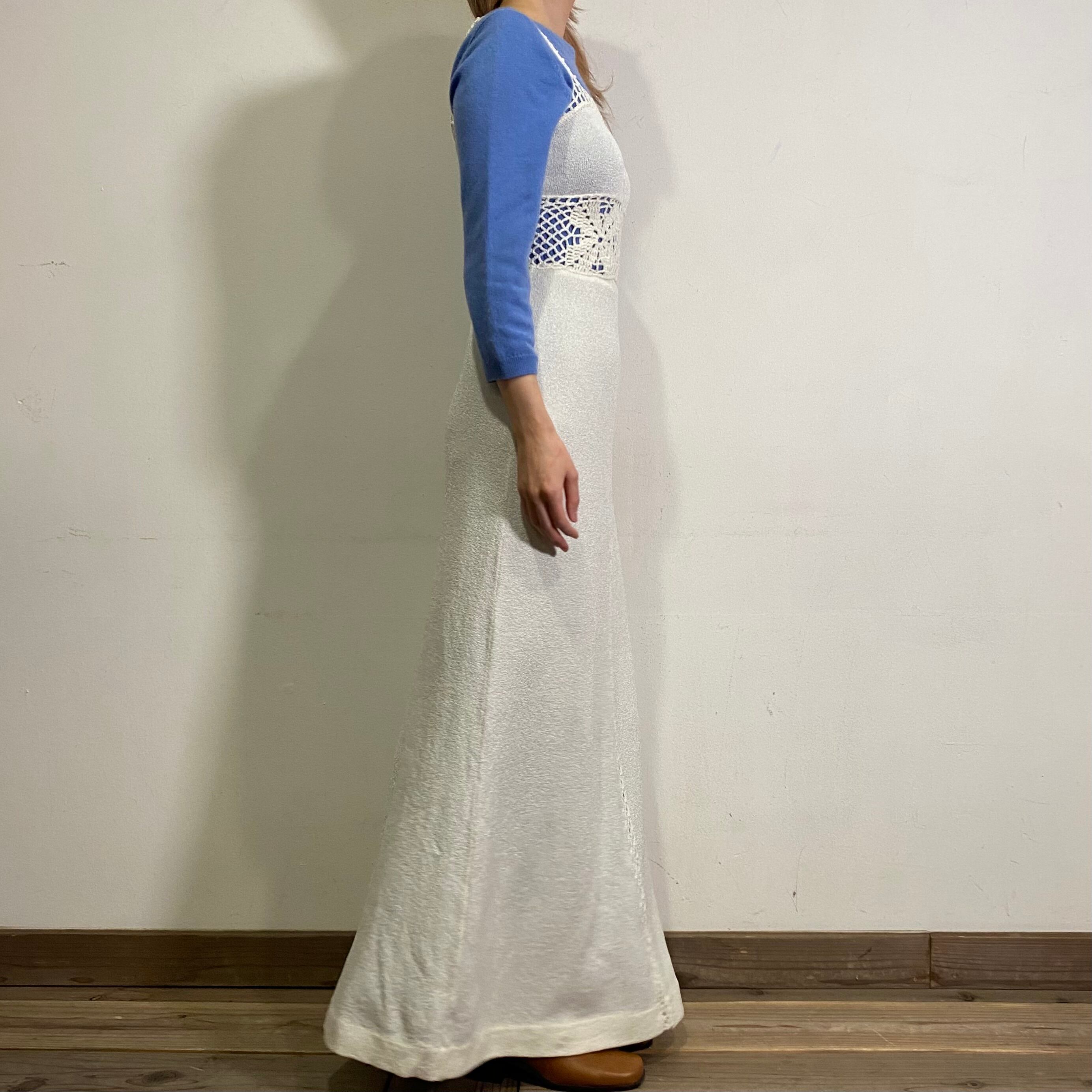 真っ白なクロシェ編みの切り替えデザインが可愛い、70年代のキャミワンピースです。