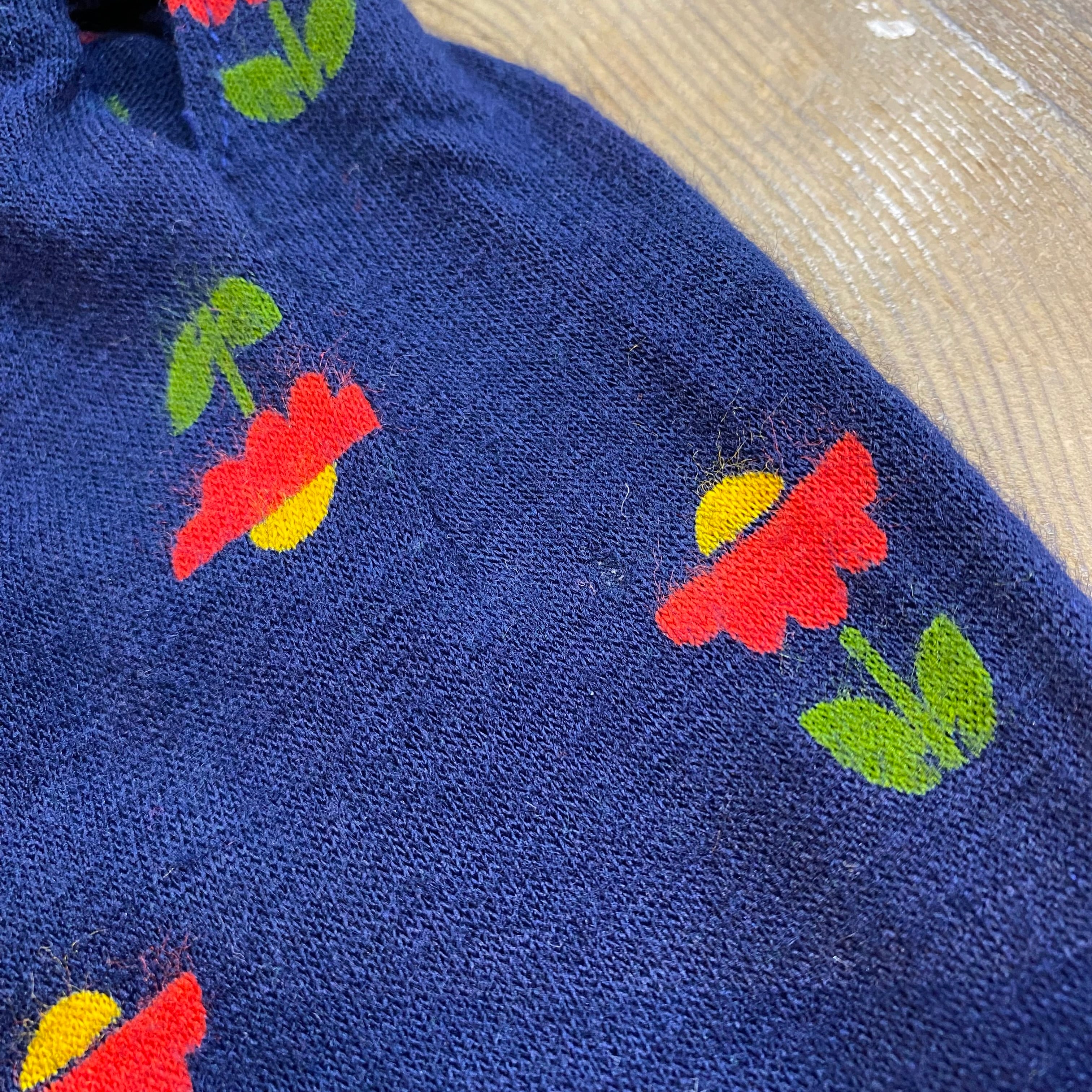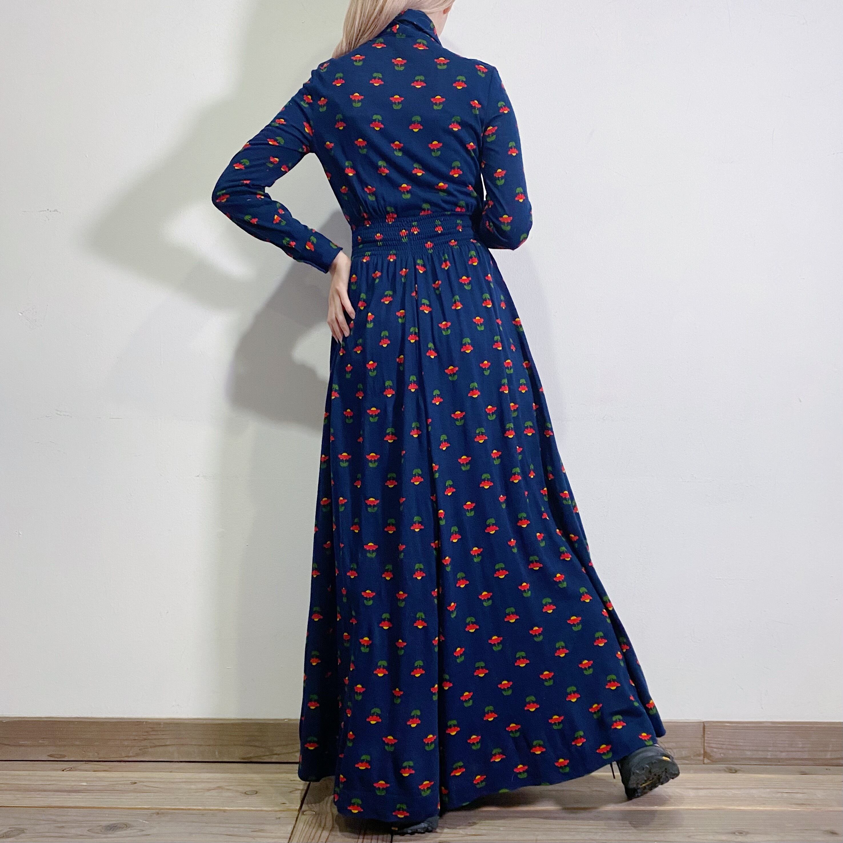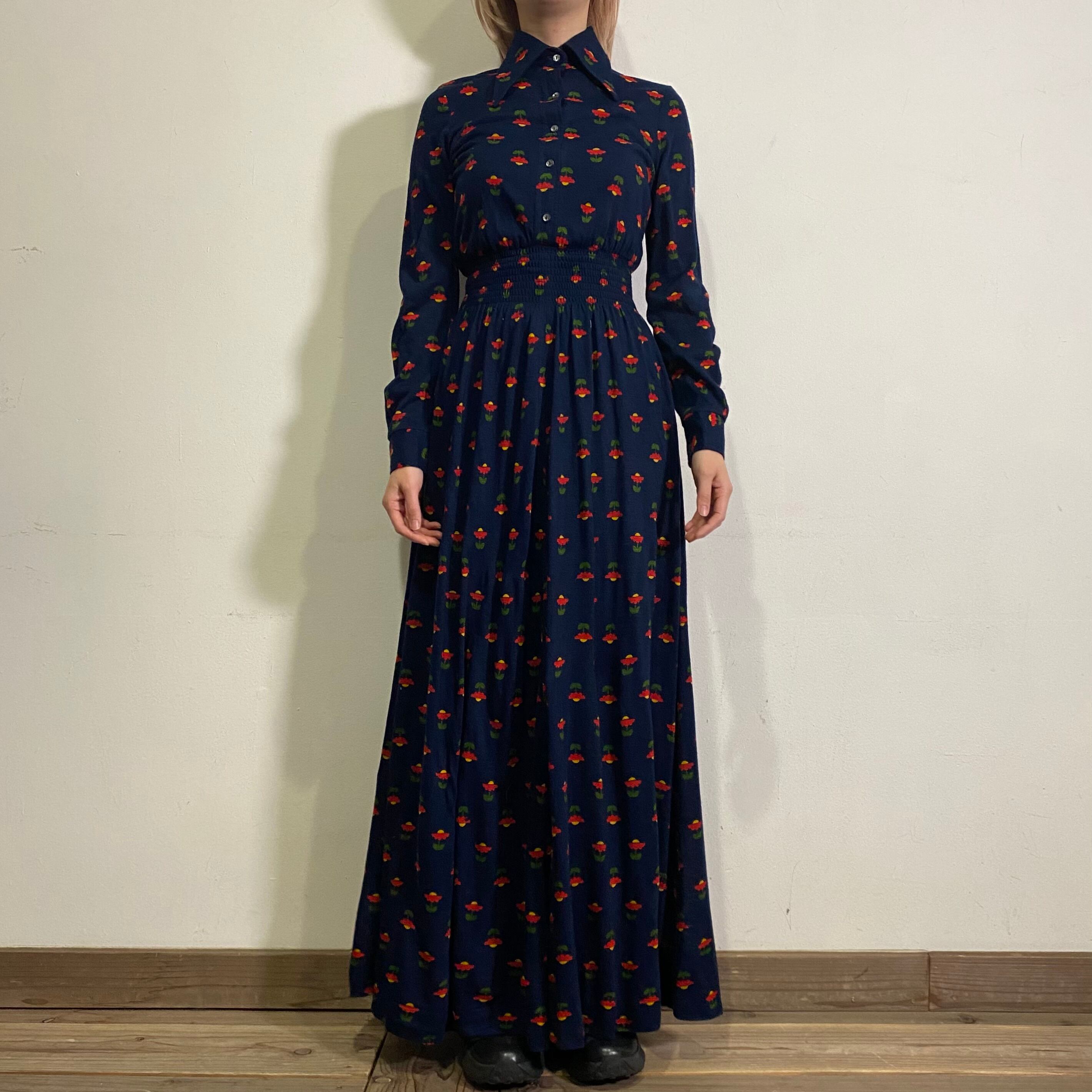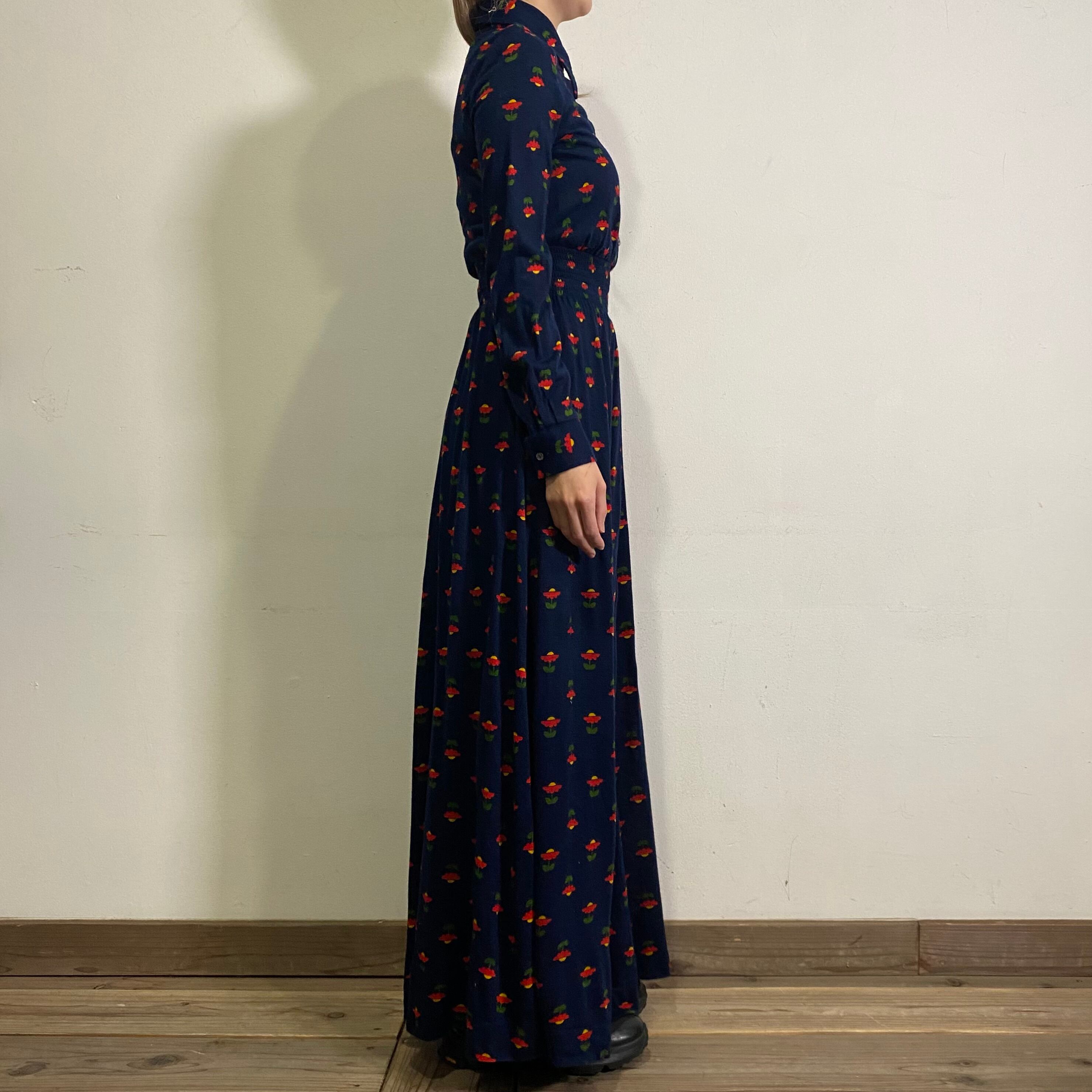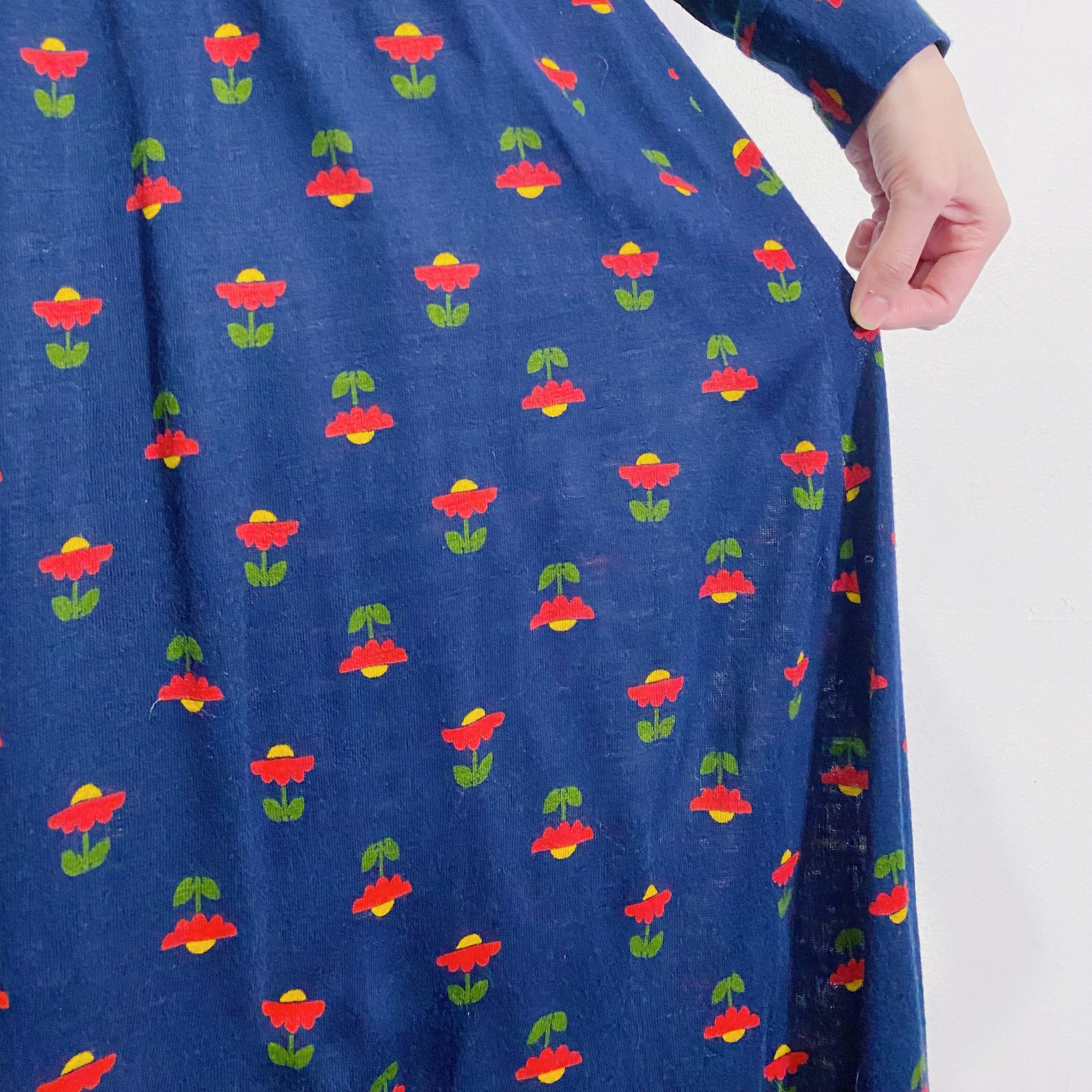 ネイビーベースの花柄が可愛い、70年代のシャツワンピースです。