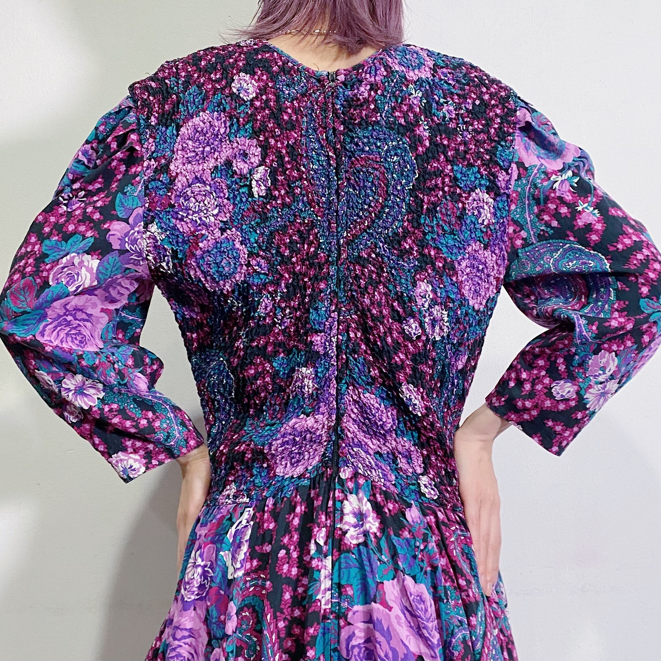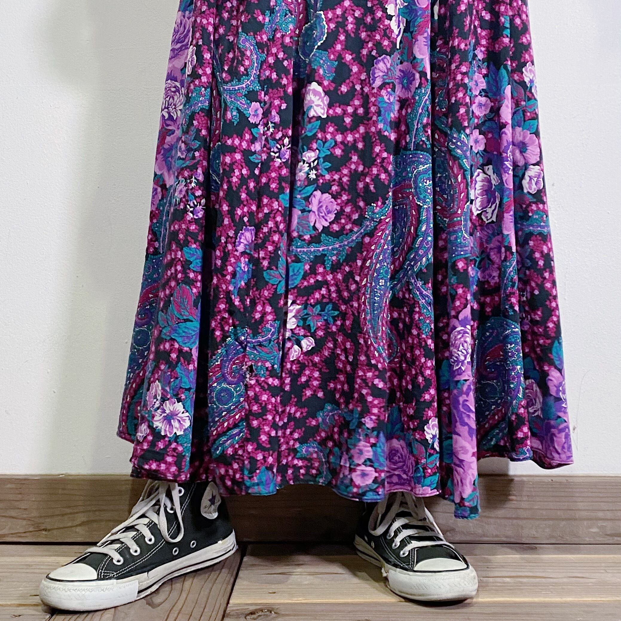 花柄とペイズリー柄のプリントが可愛い、80年代のロングワンピースです。