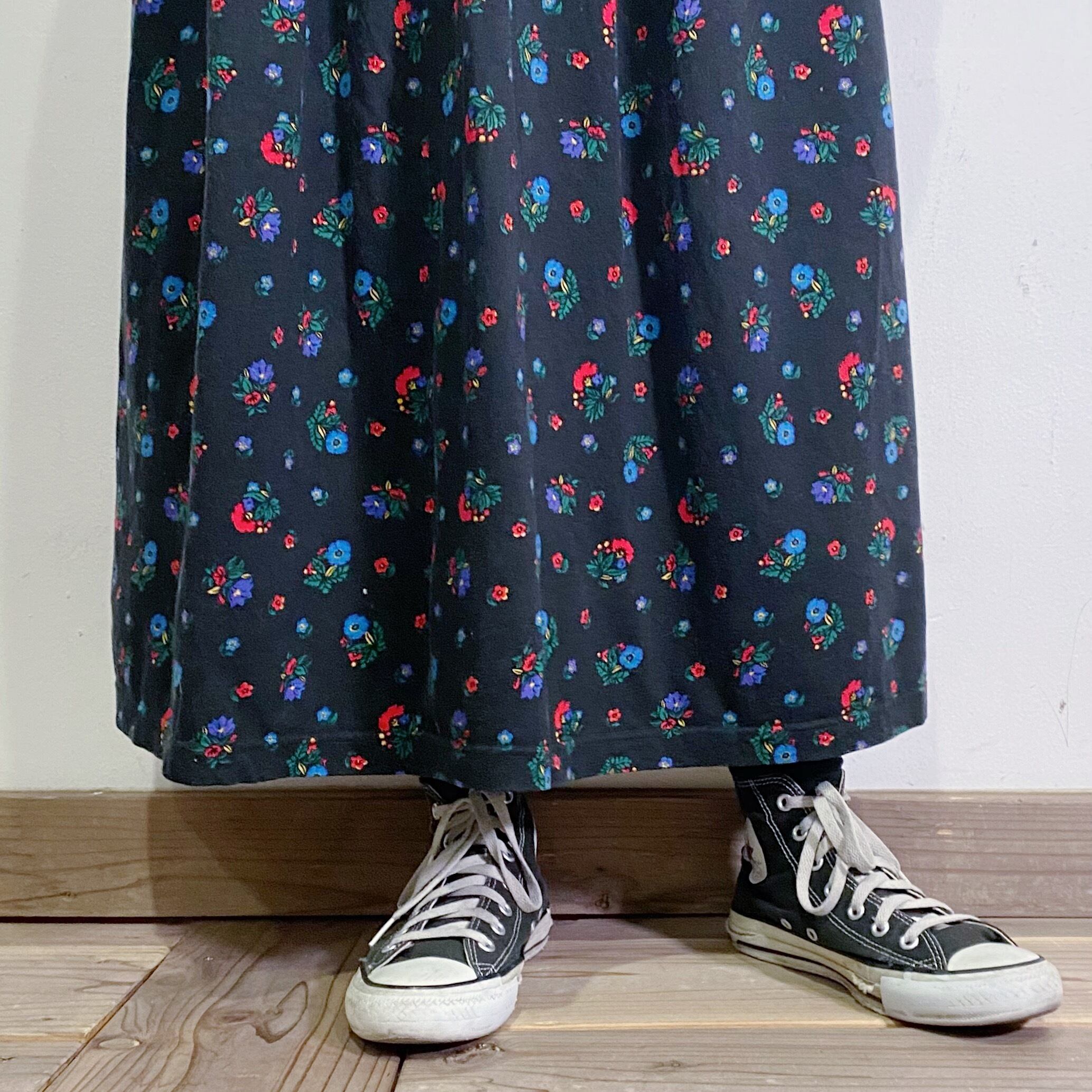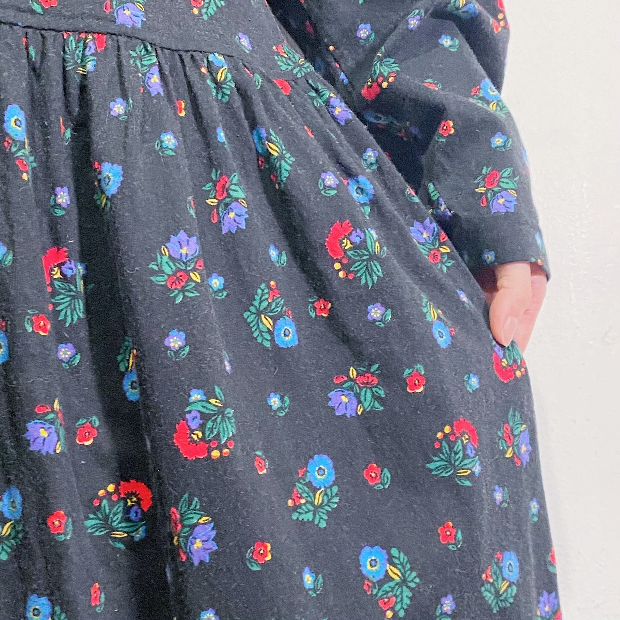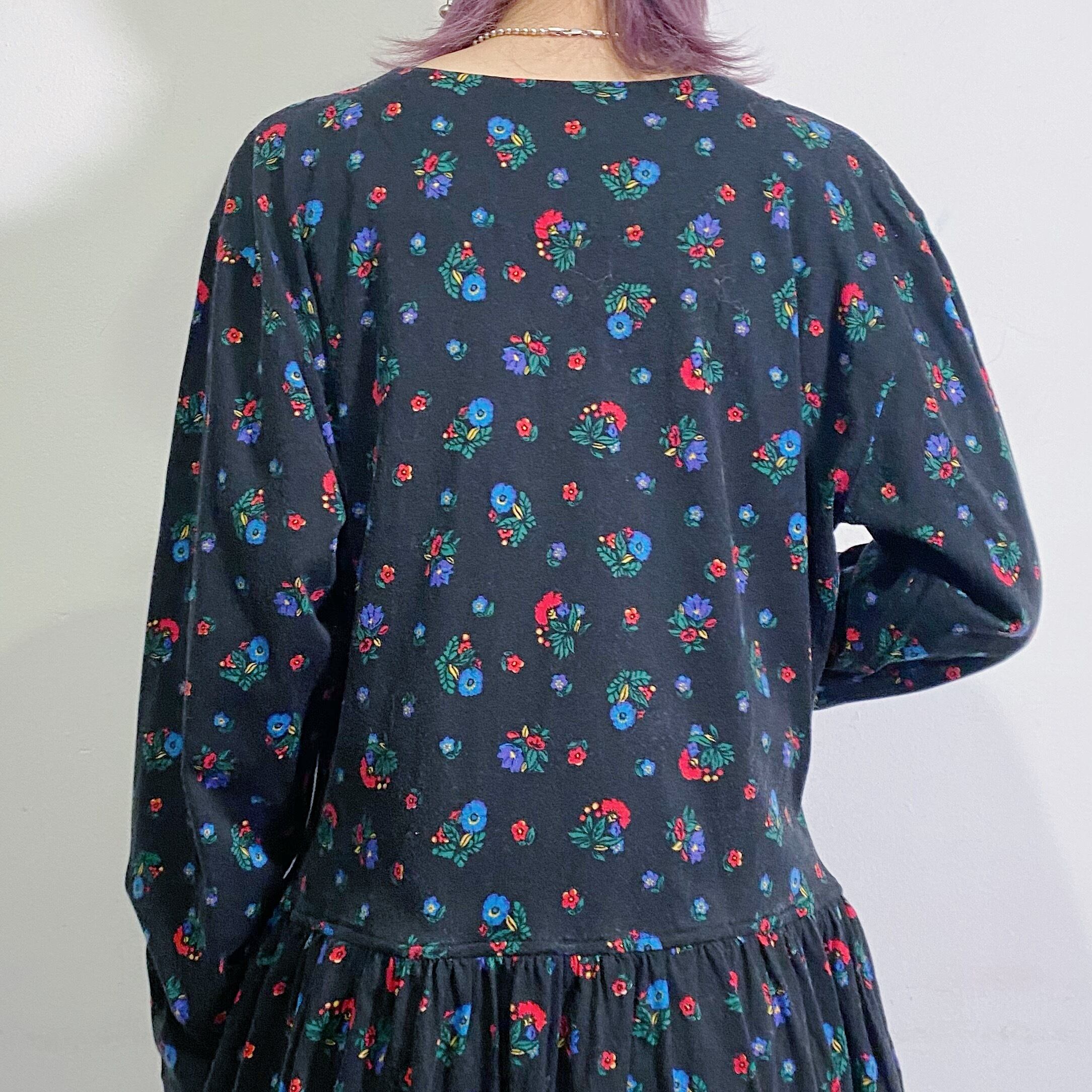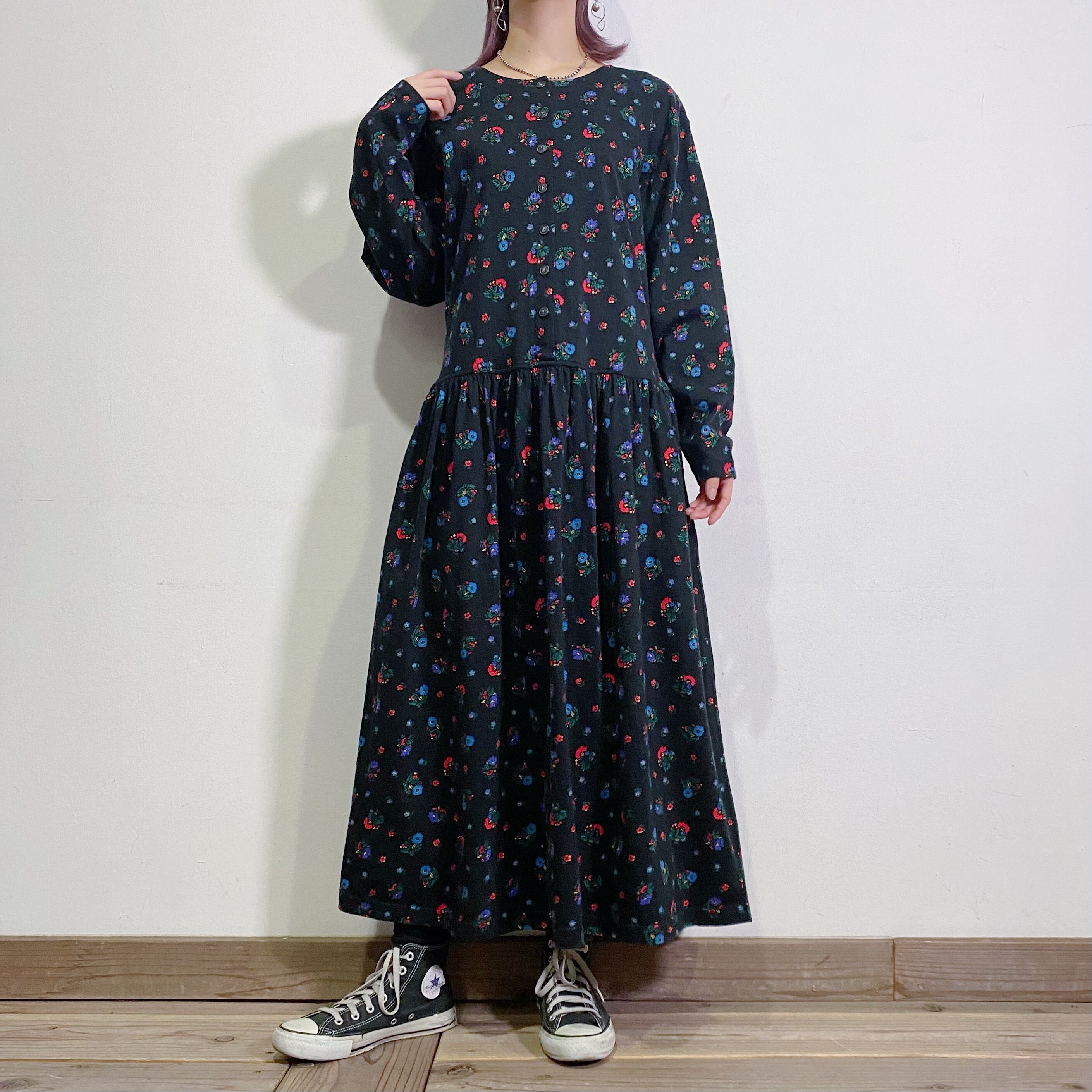 ブラックベースの花柄が可愛い、コットン地のワンピースです。