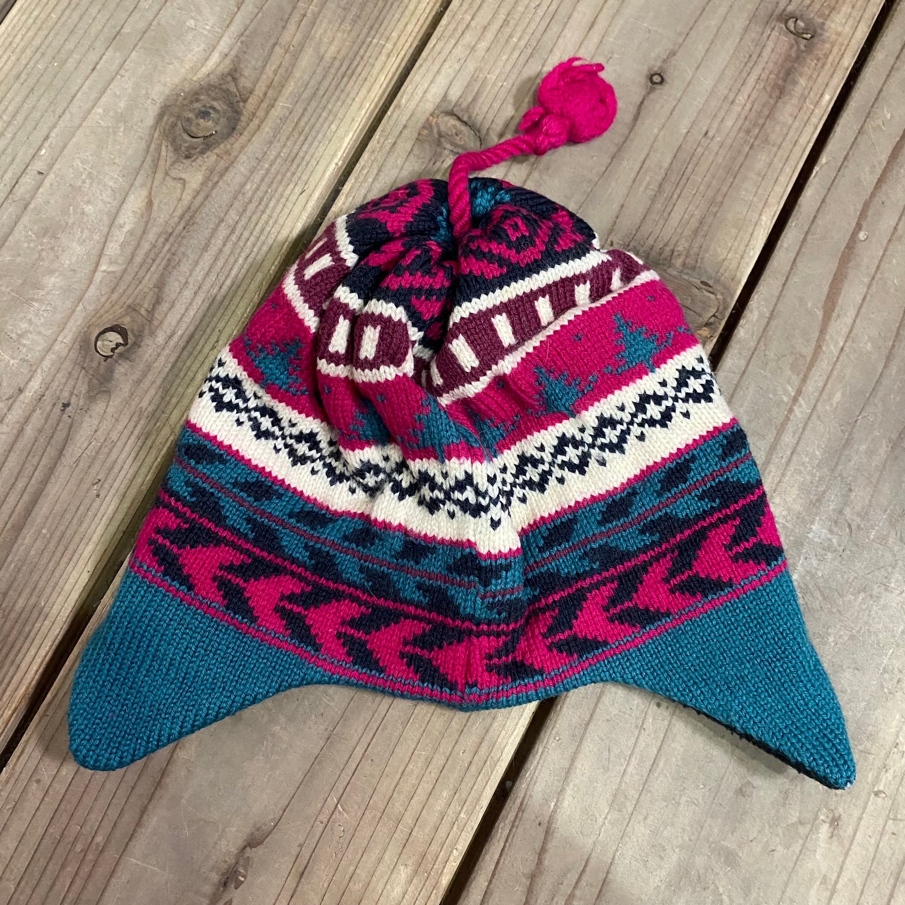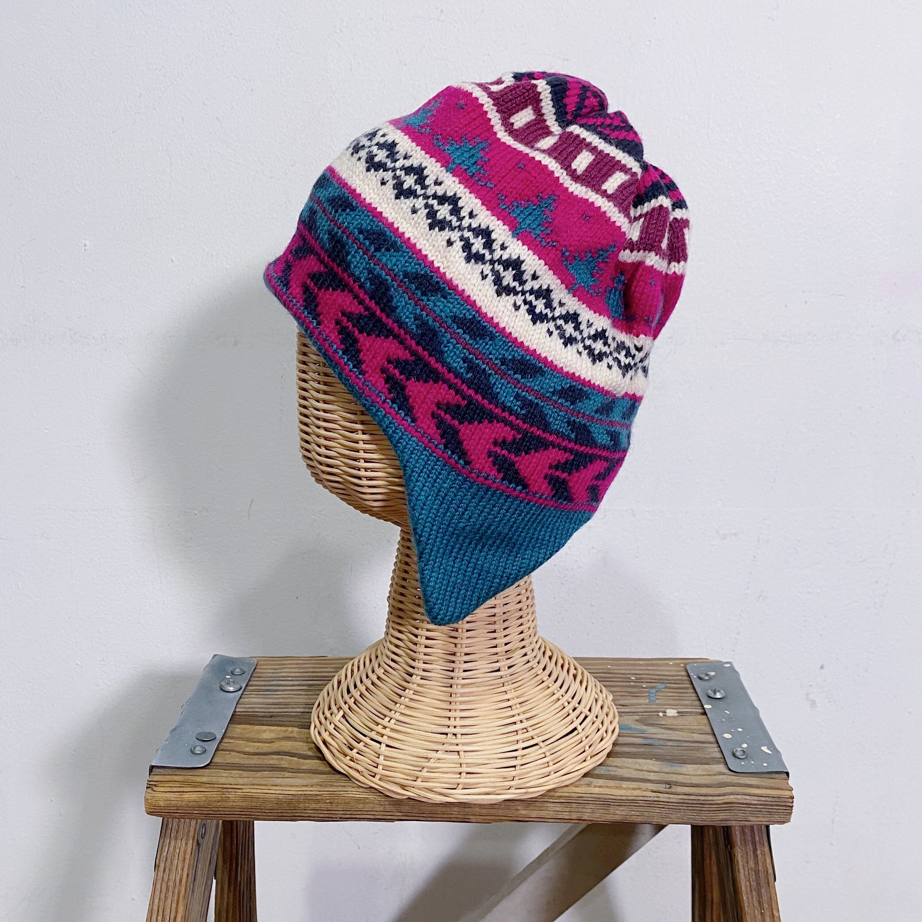 ピンクやブルーグリーンなどの色合わせが可愛い、80年代のニット帽です。