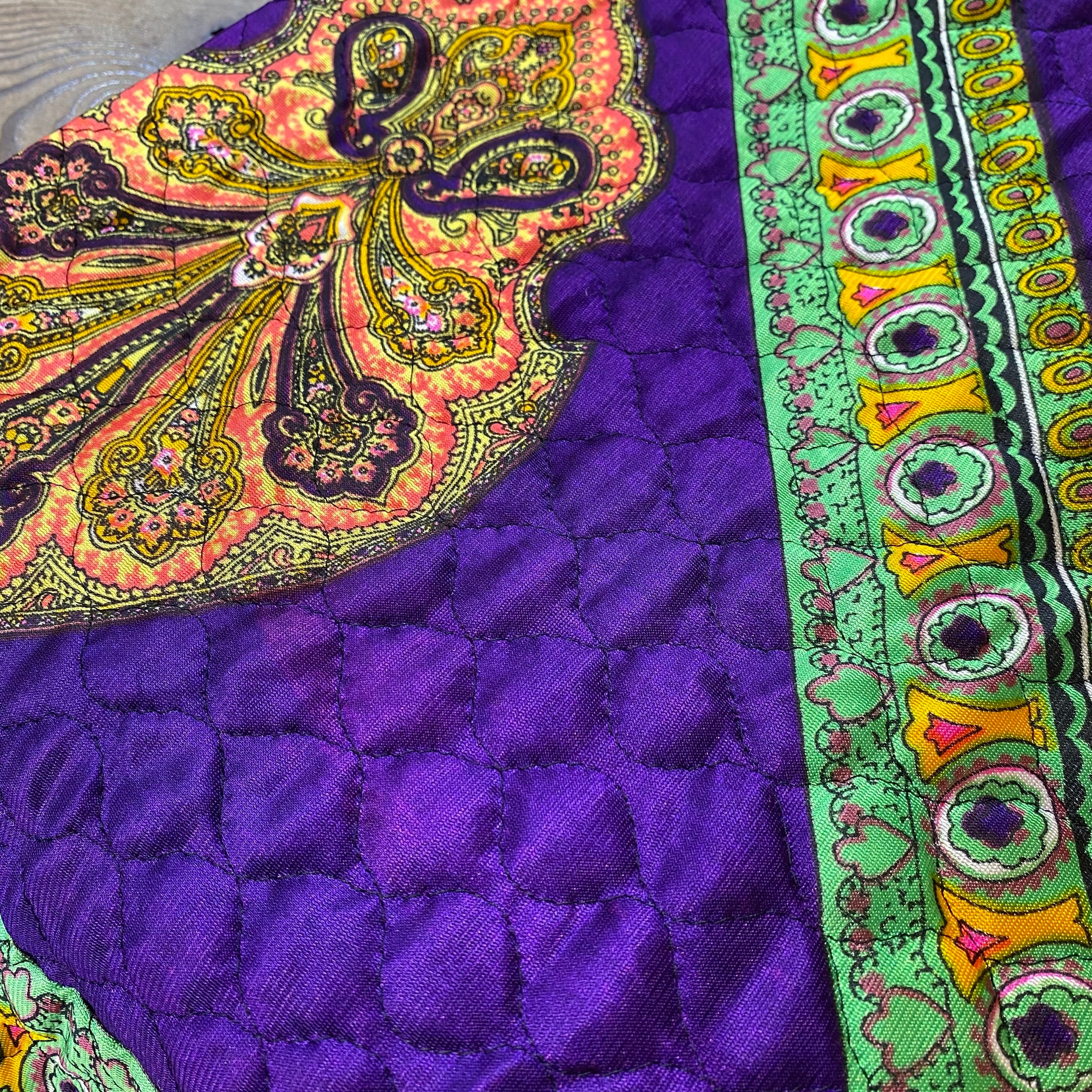 パープルベースにイエローやグリーンの色合わせが可愛い、70代のキルティングスカートです。