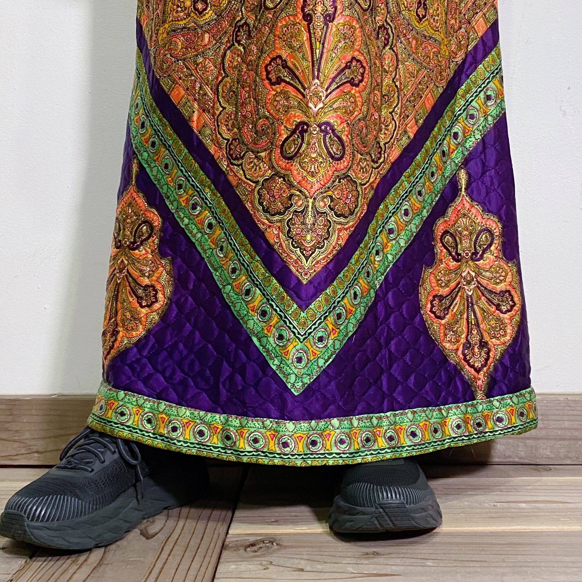 70s purple and yellow quilting satin long skirt
