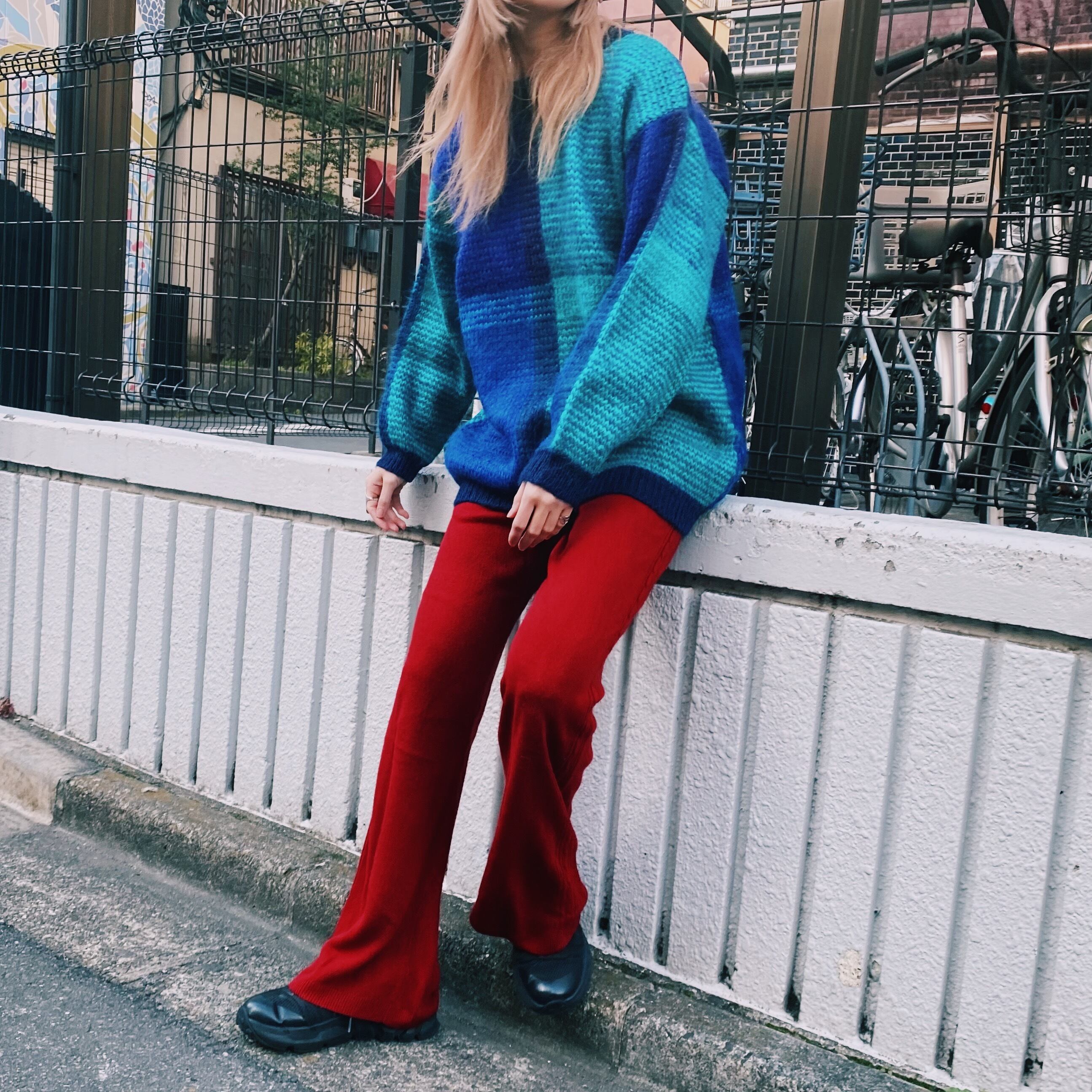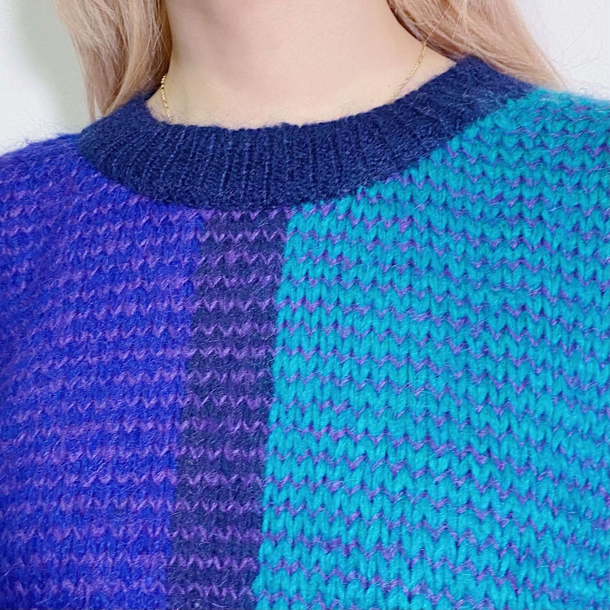 ブルー・パープル・グリーンの寒色系の色合いが素敵な80年代のニットセーターです。
