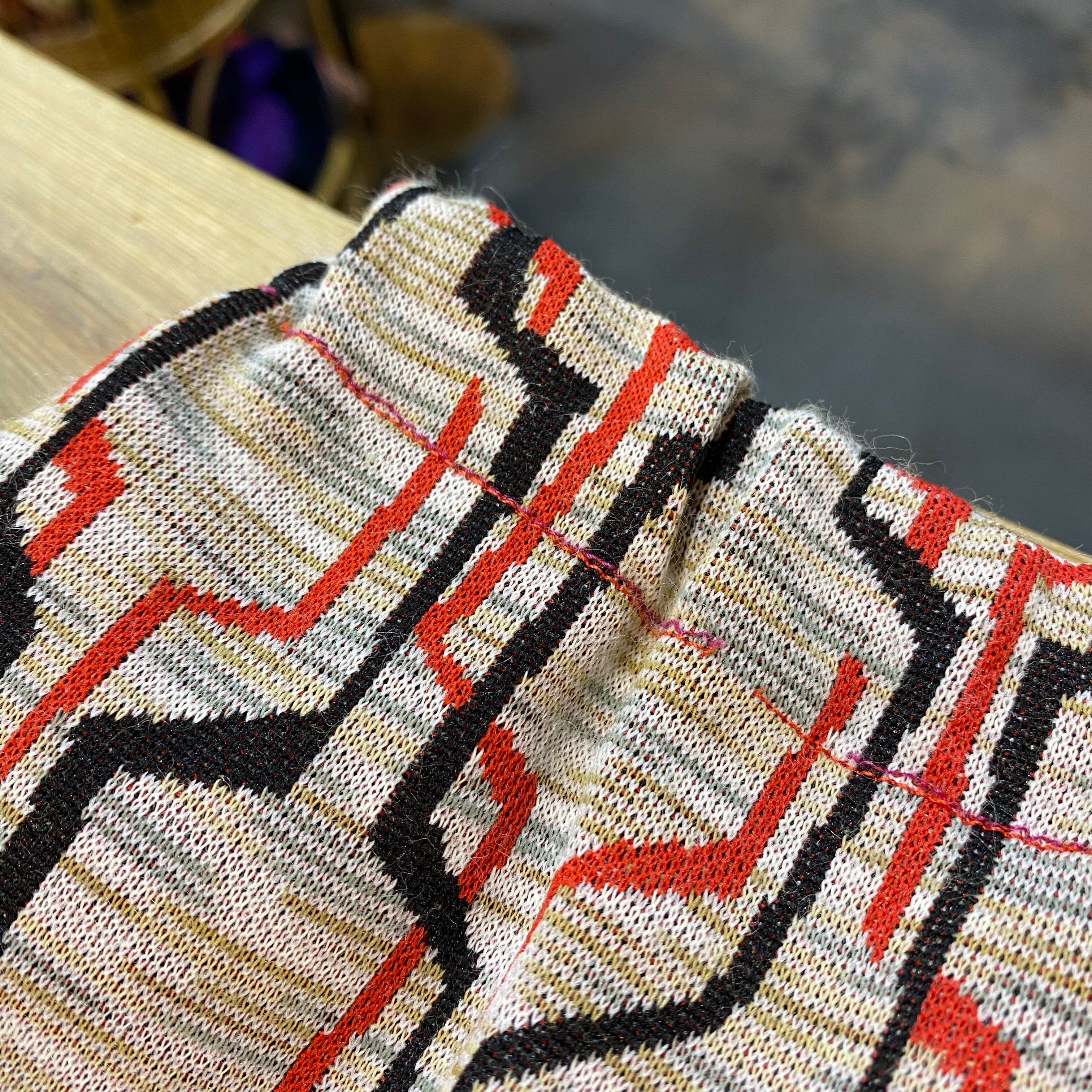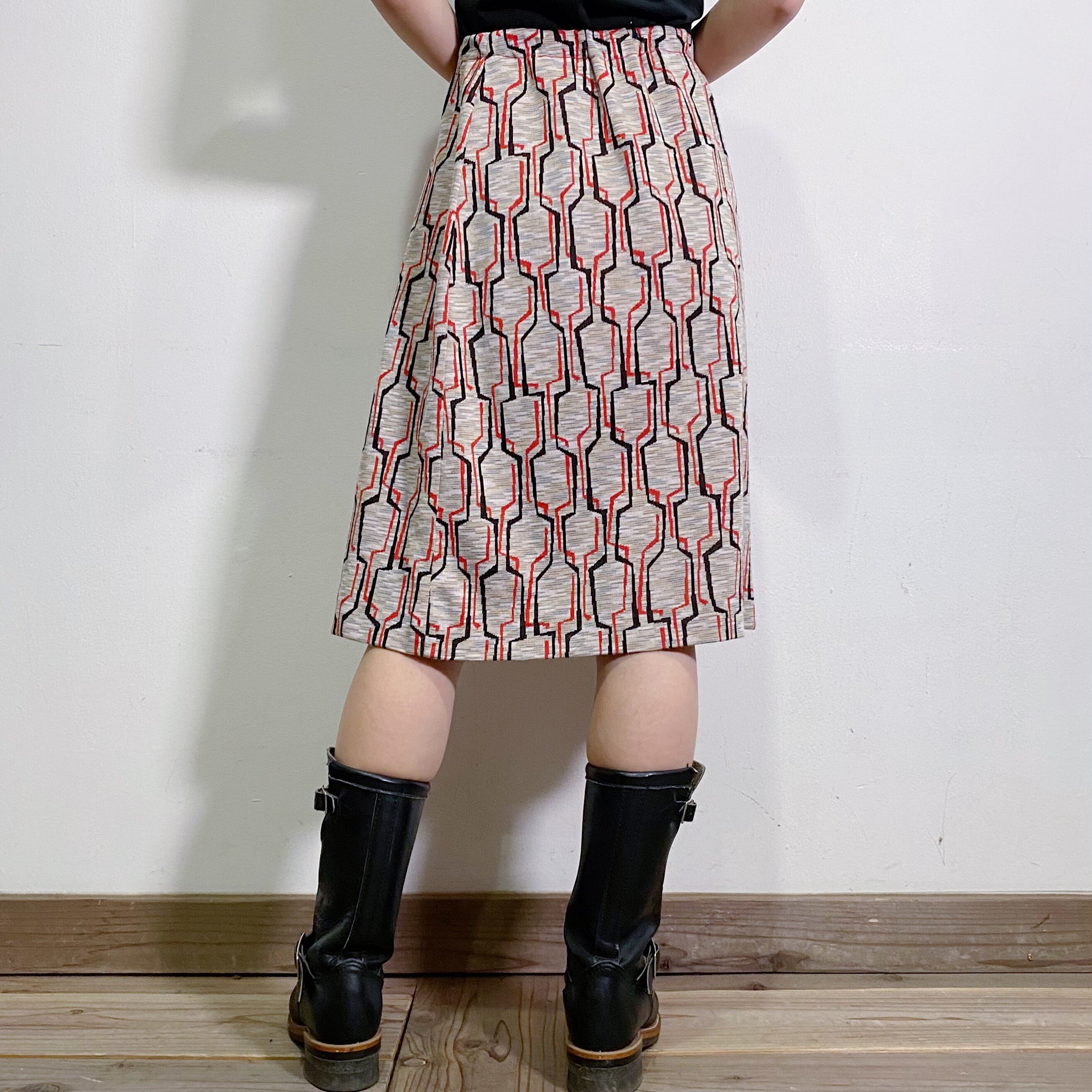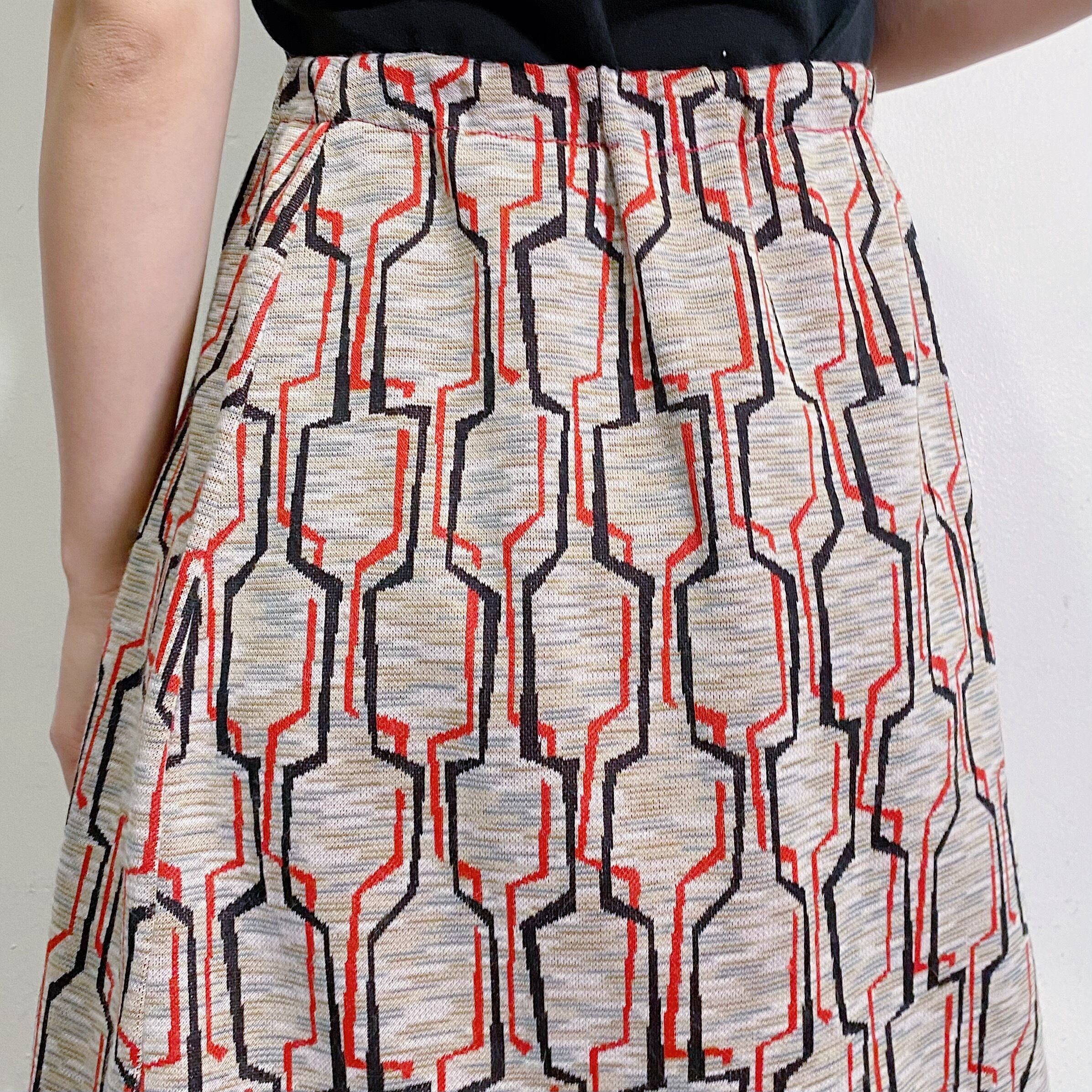 グレージュのようなベースに赤と黒の幾何学模様が可愛い、70年代のミニスカートです。