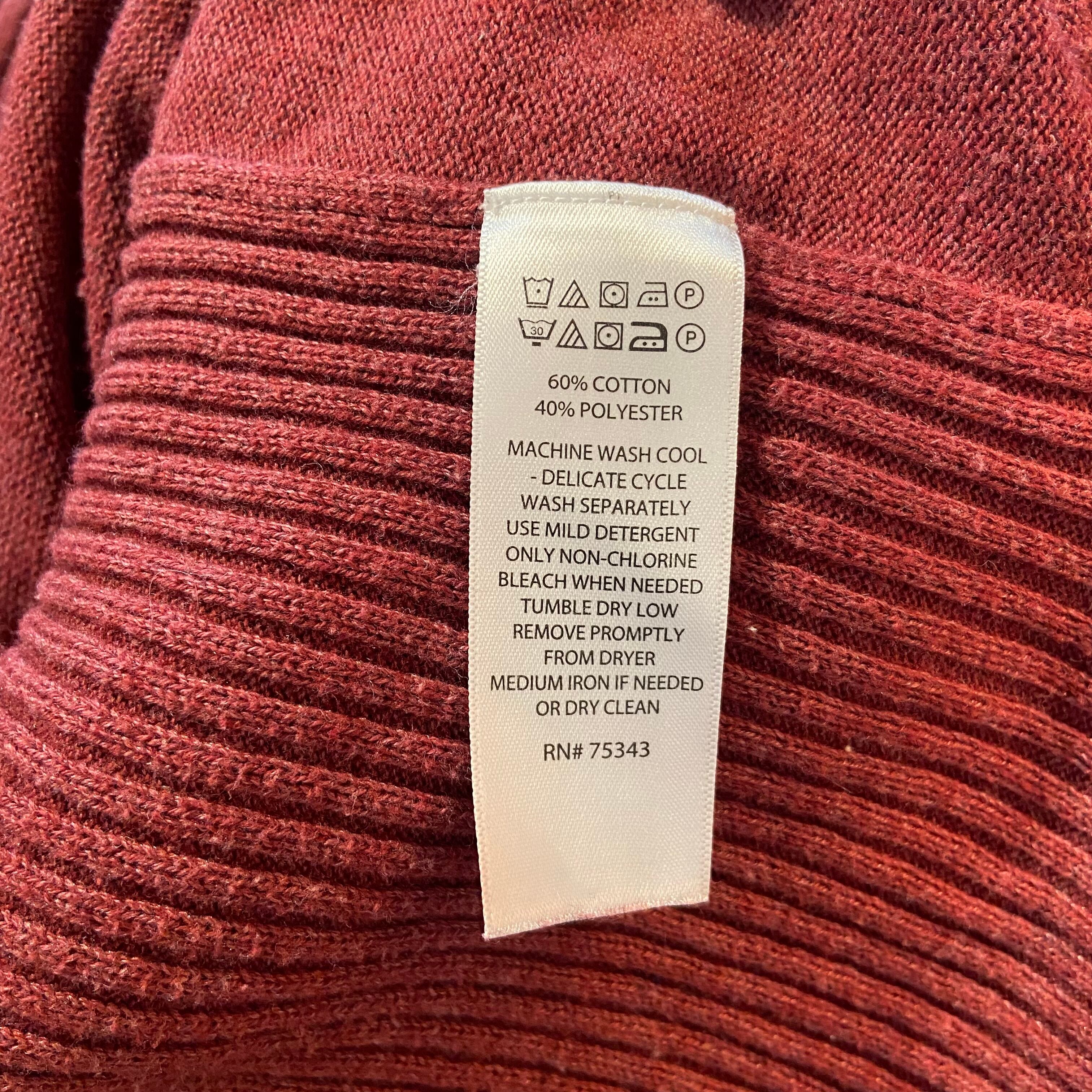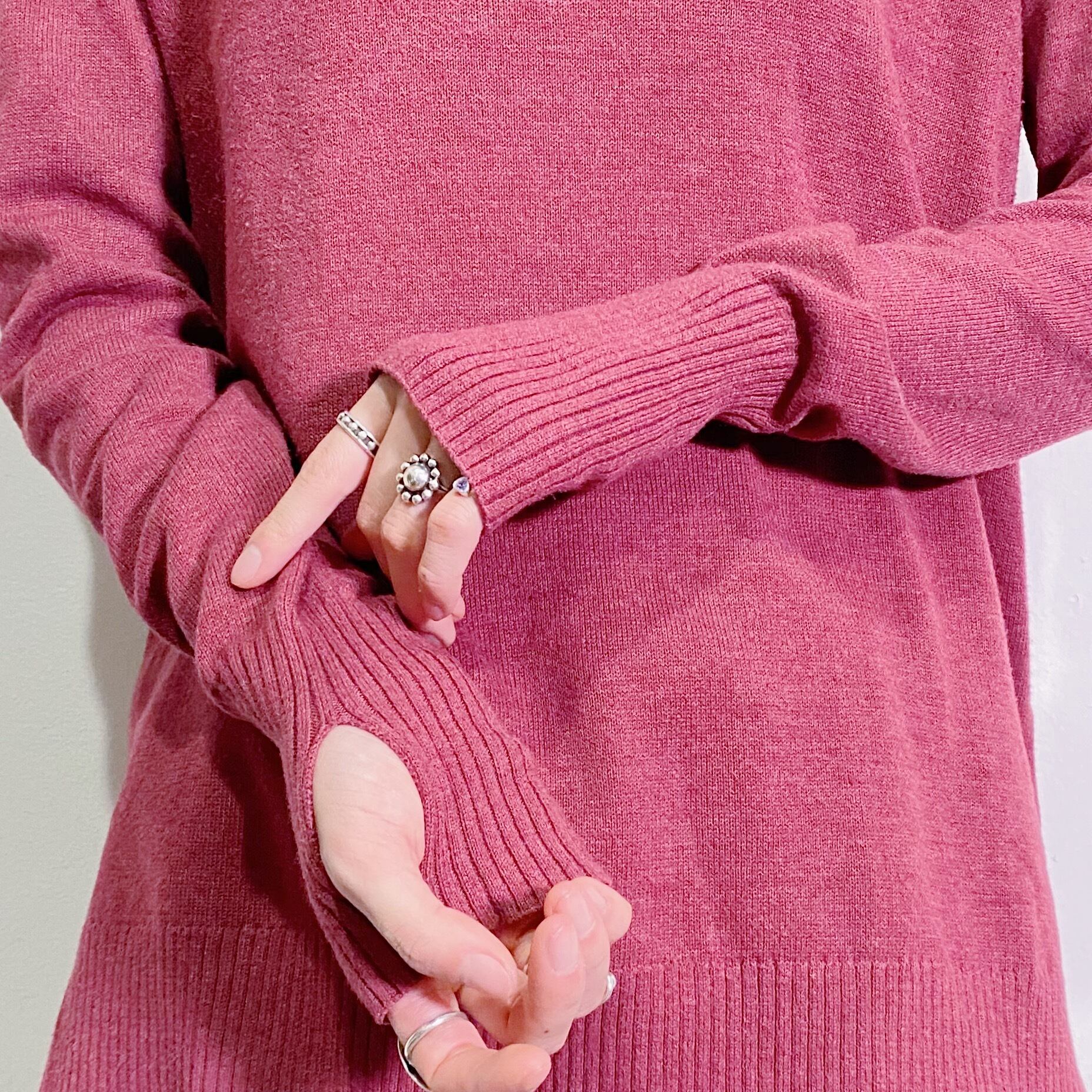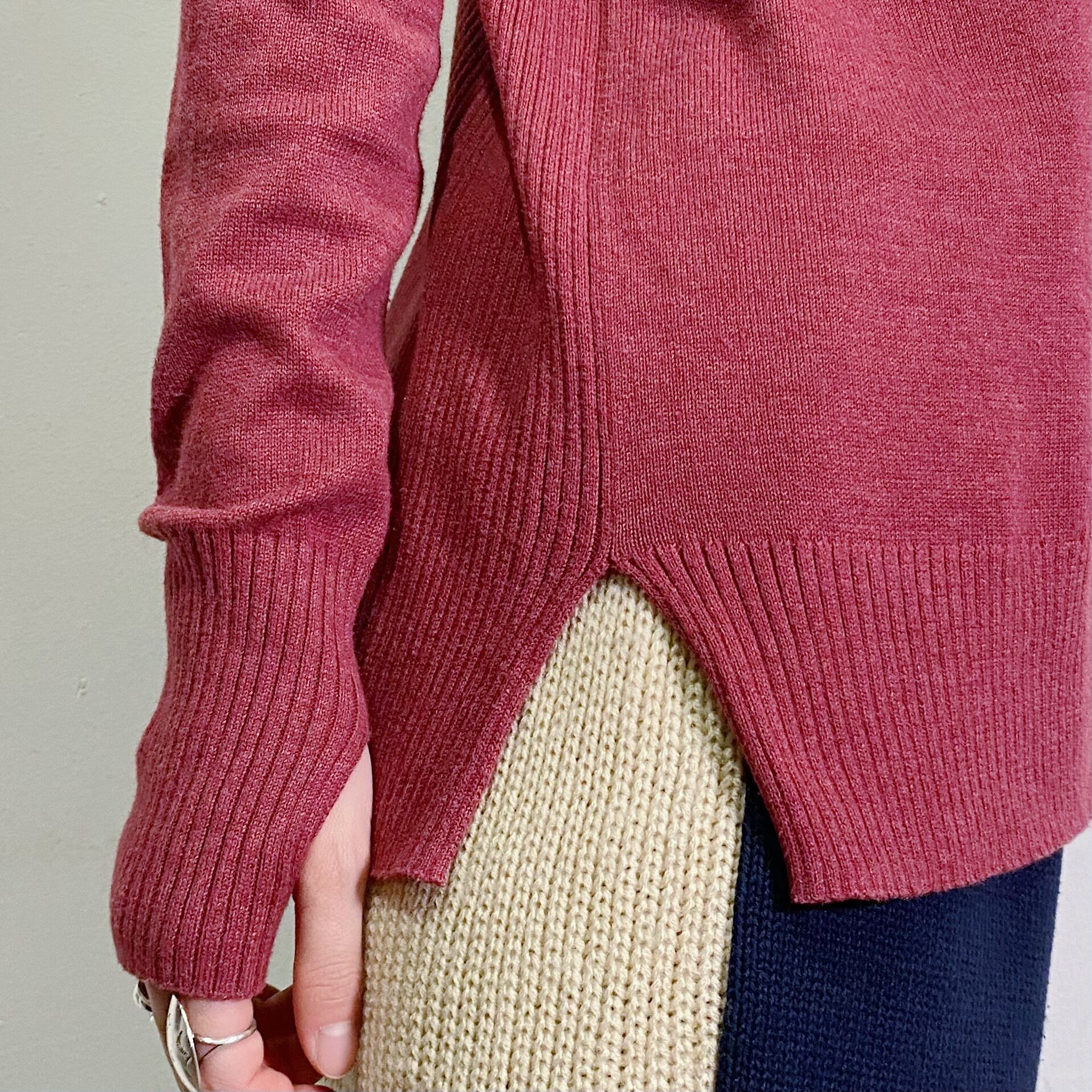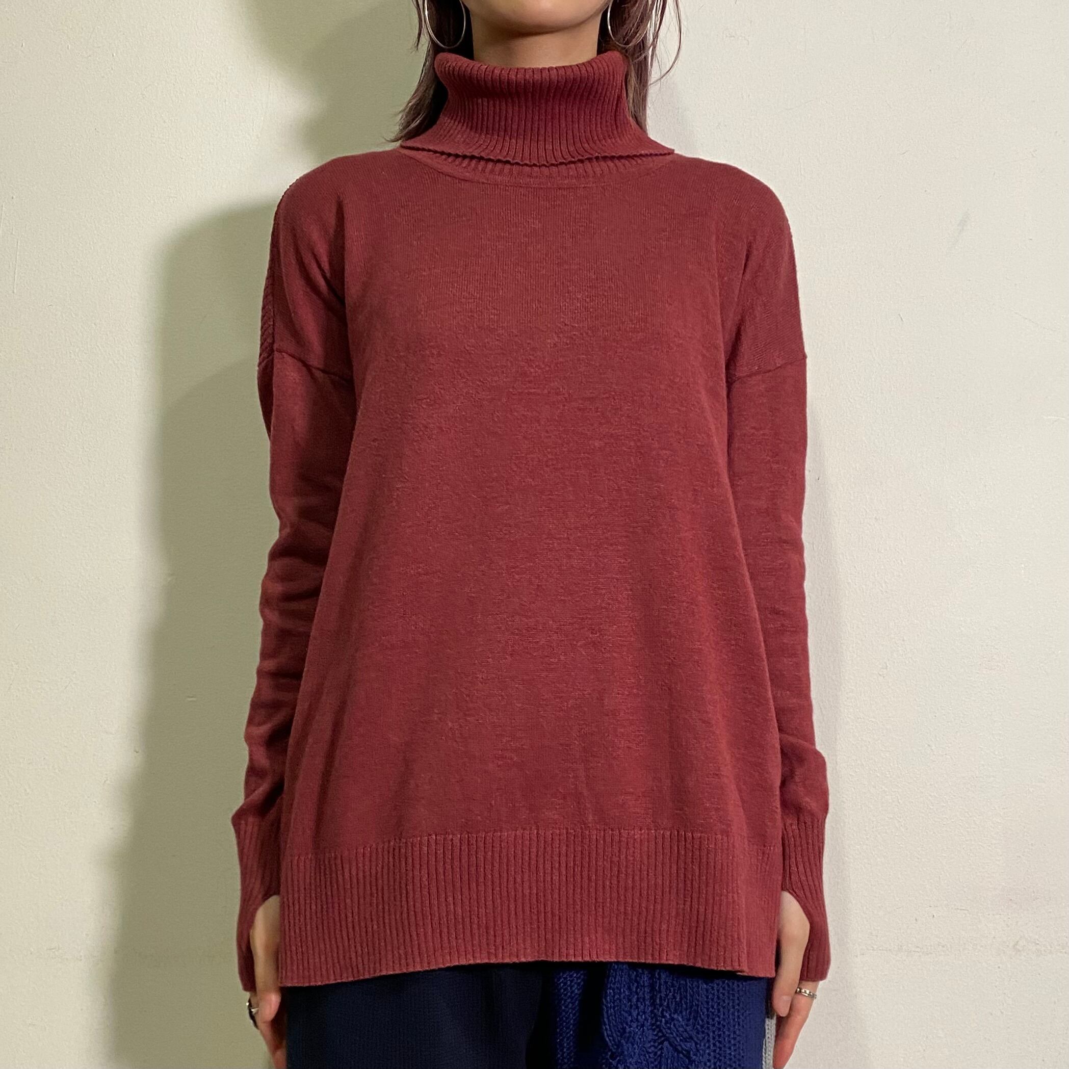 くすみカラーのワインレッドが可愛い。タートルネックニットです。