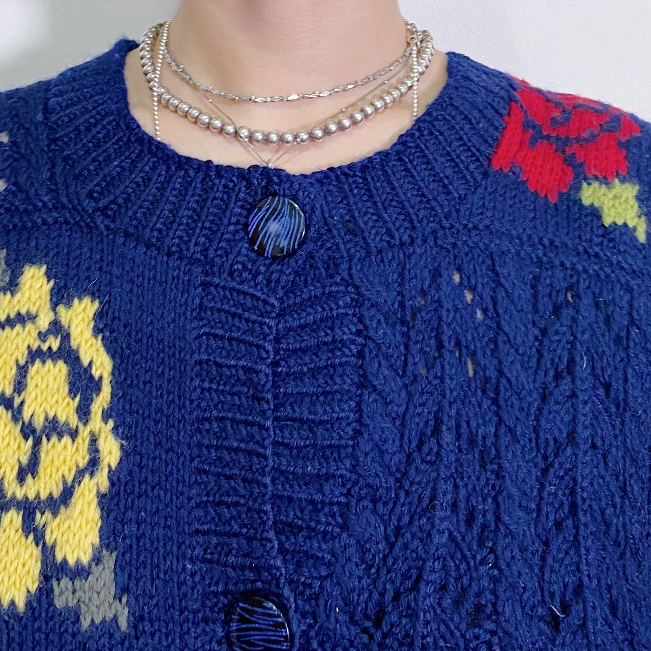 イエローとレッドのバラモチーフが可愛い、ニットカーディガンです。