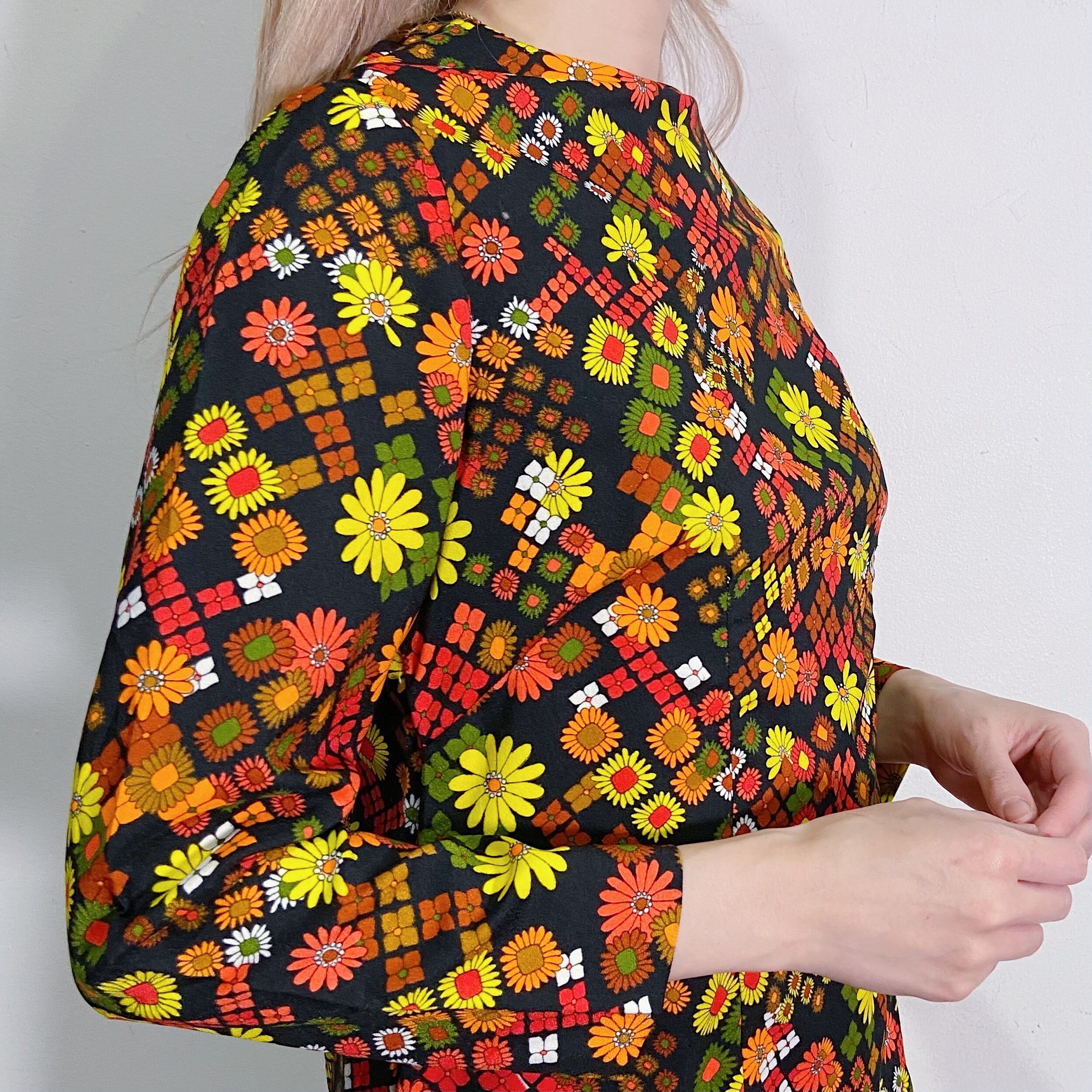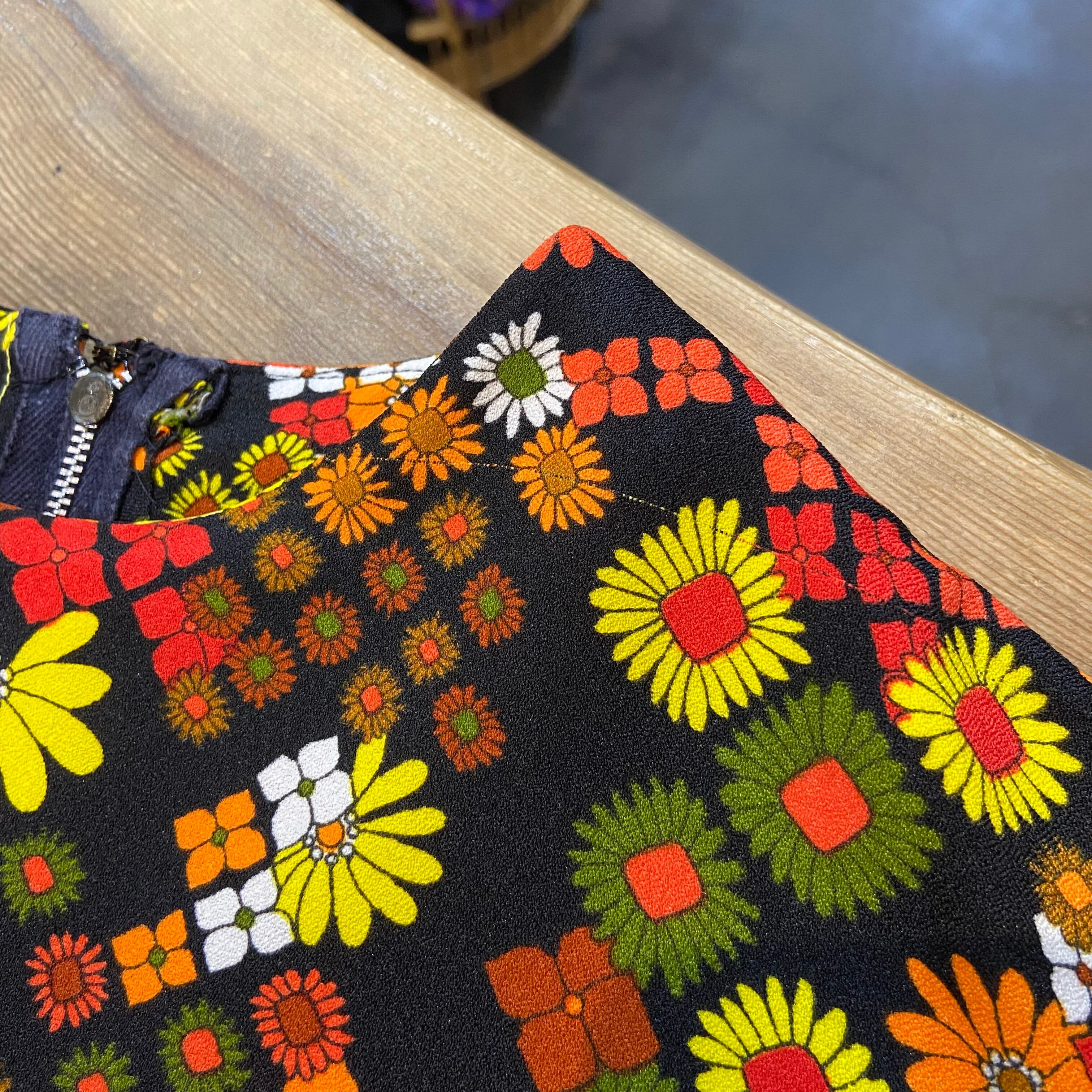 オレンジ・イエロー・グリーンの色合いが可愛い、60~70年代のワンピースです・。