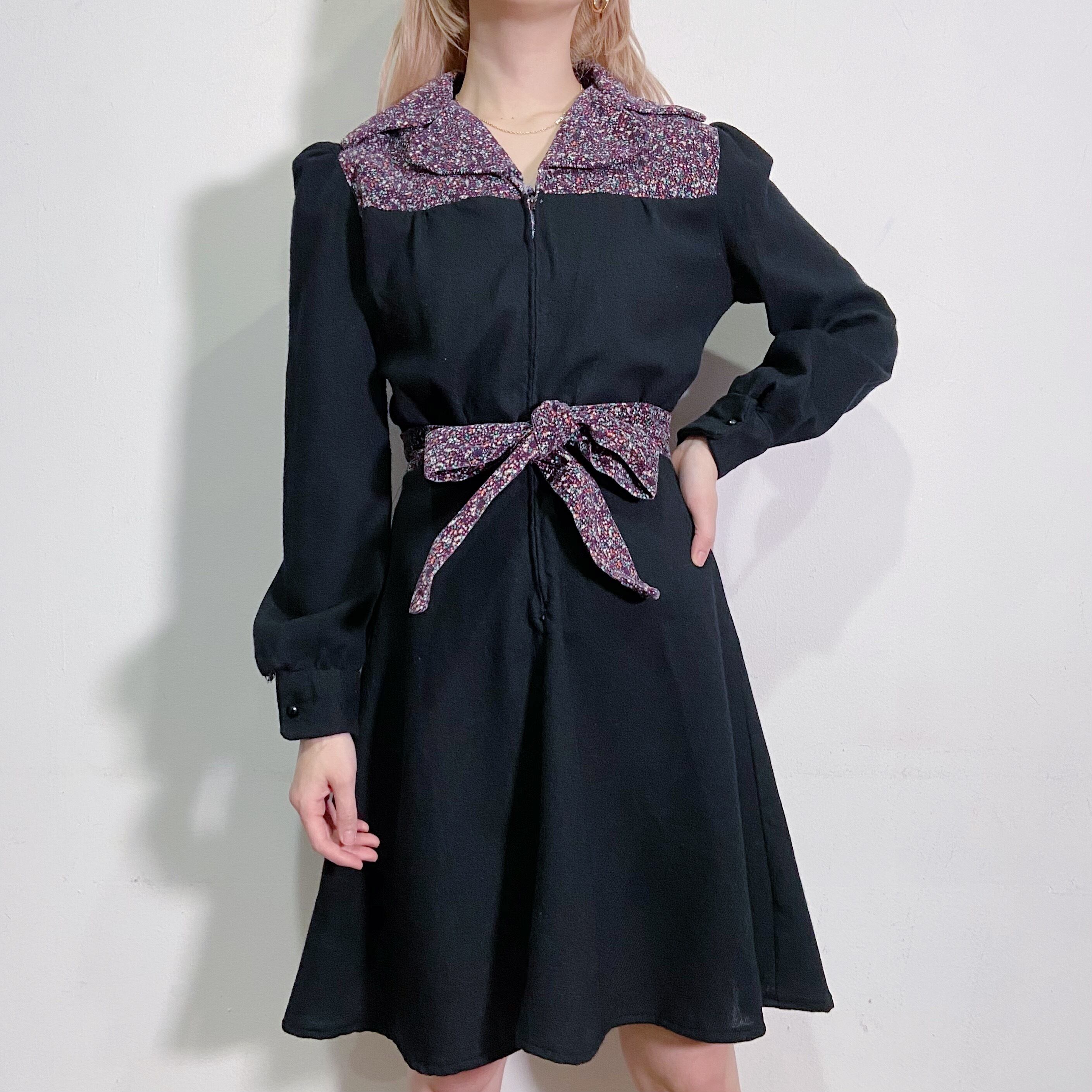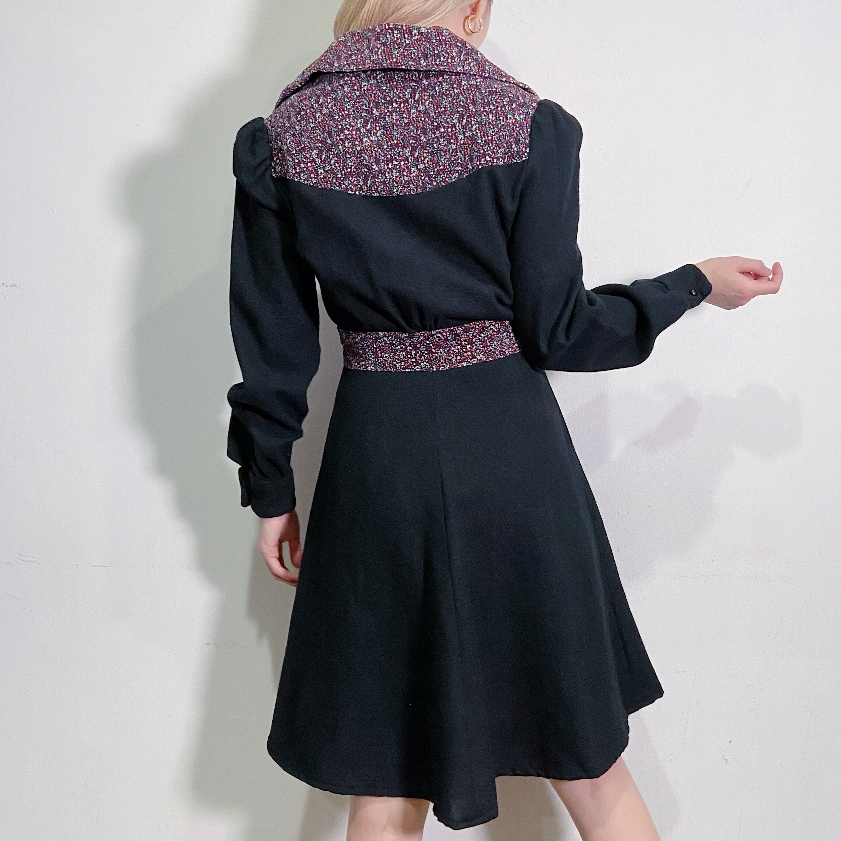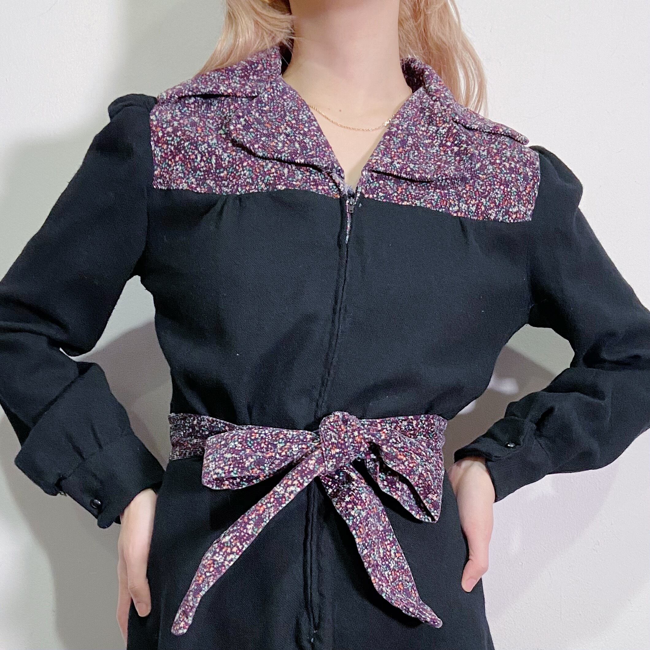 小花柄のコーデュロイ素材とブラックカラーの切り替えデザインが可愛い、70年代のワンピースです。