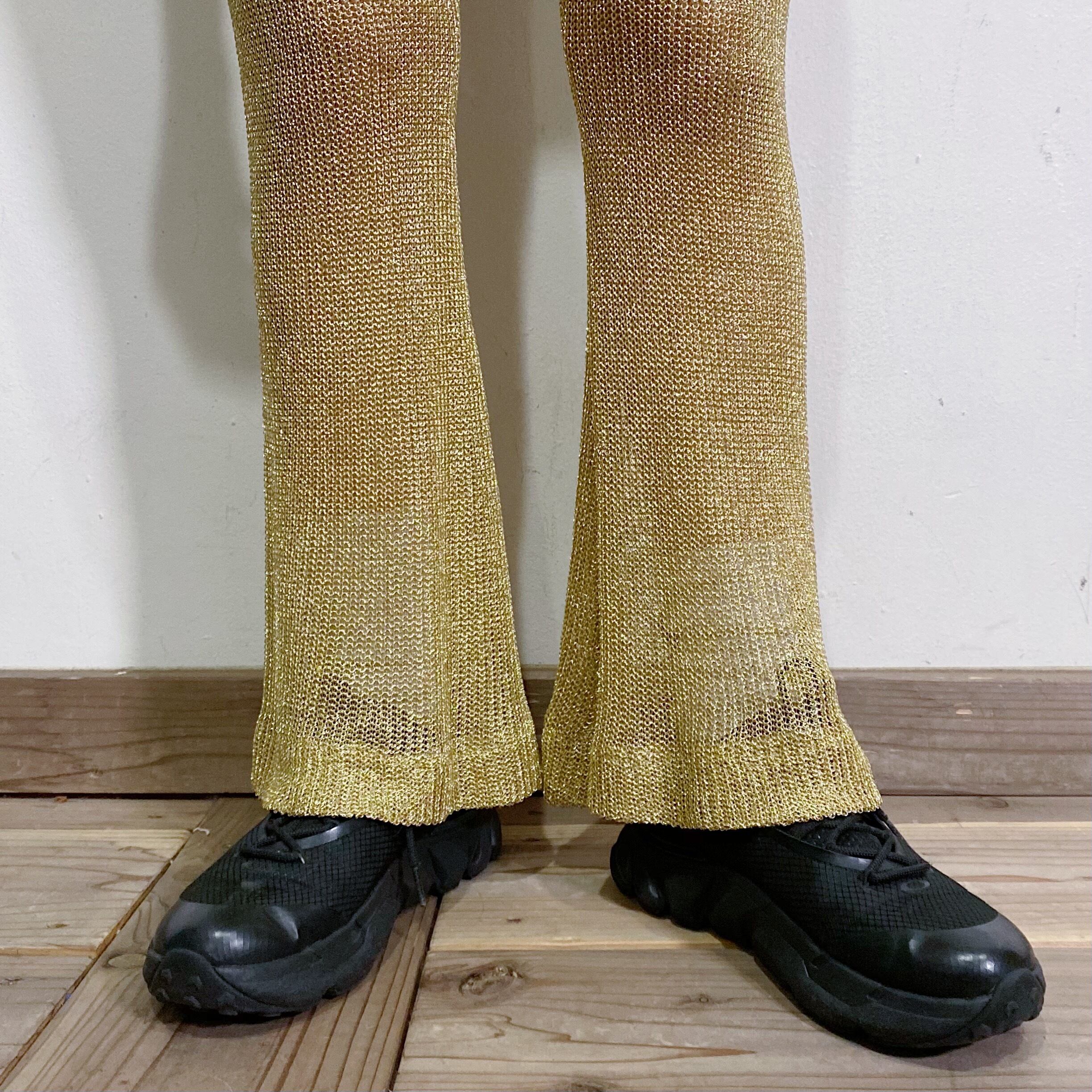 シャイニーなゴールドカラーがイケてる、ローゲージニットのフレアパンツです。