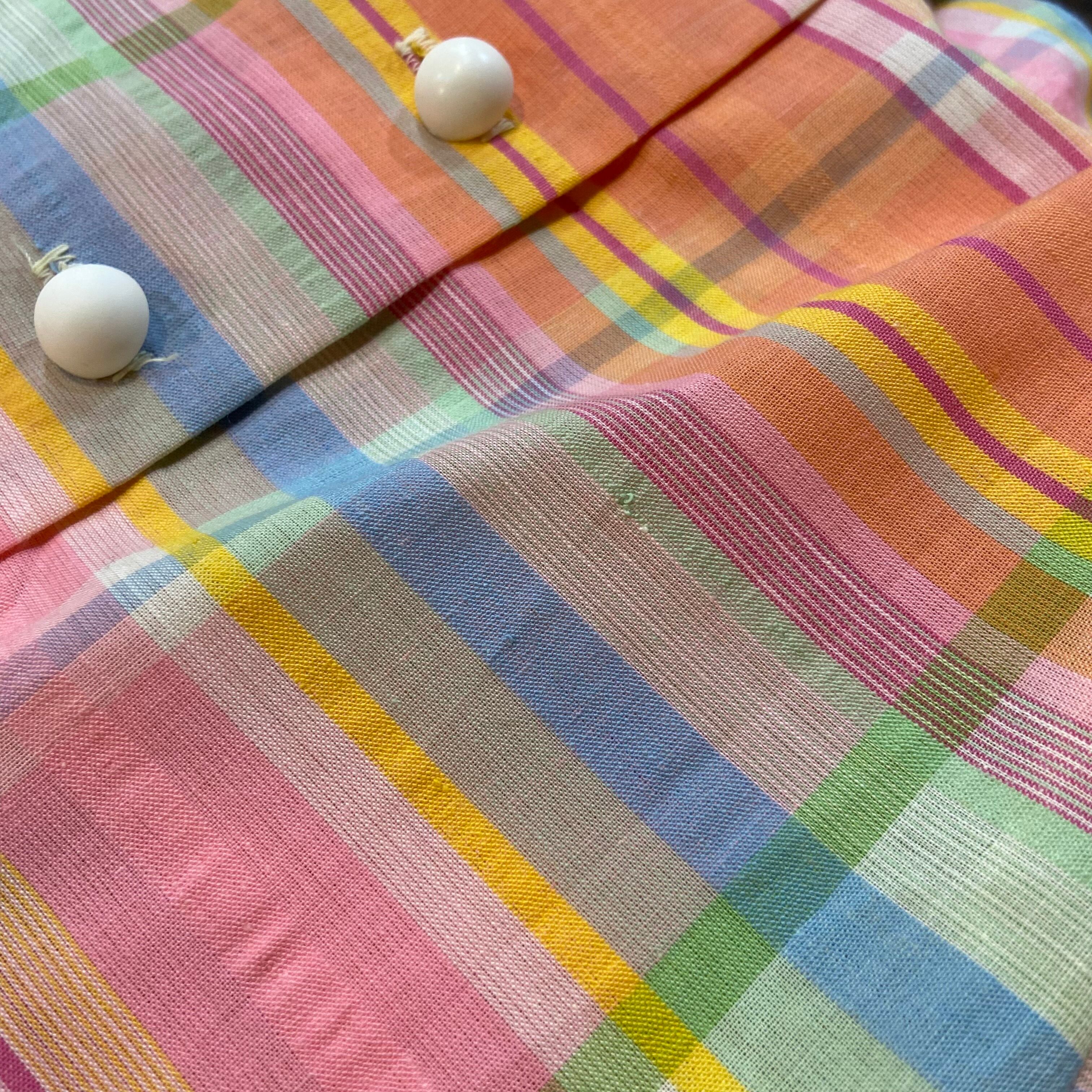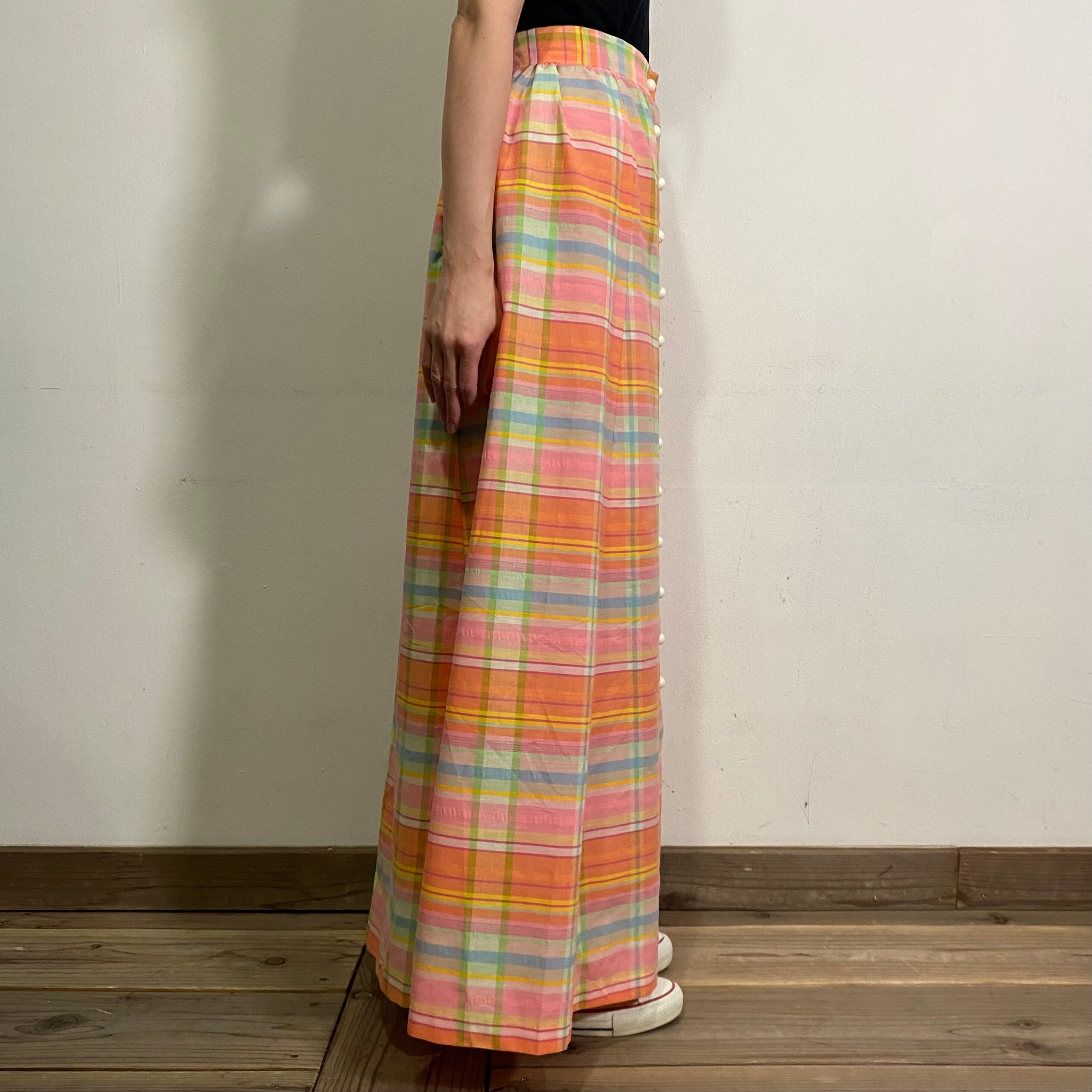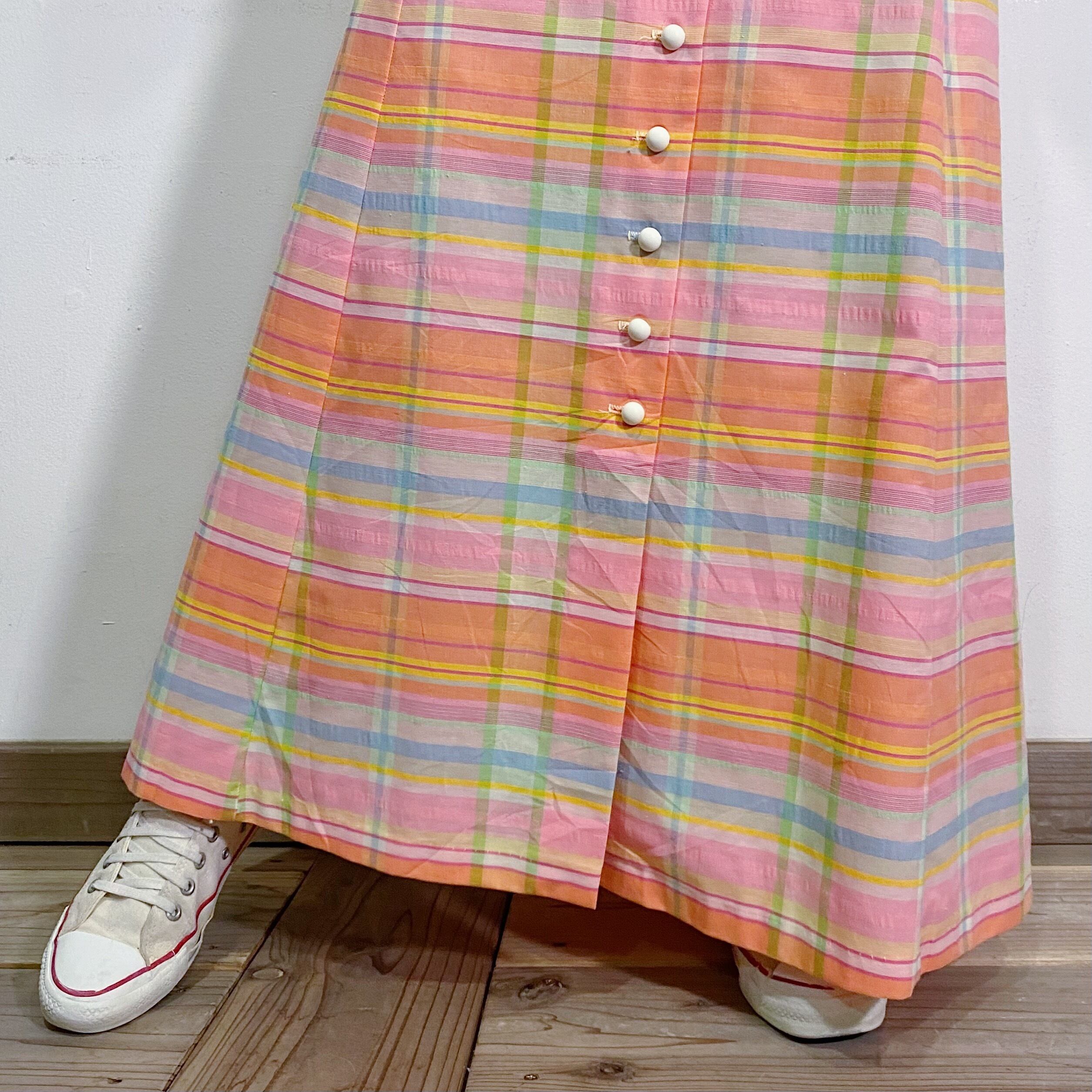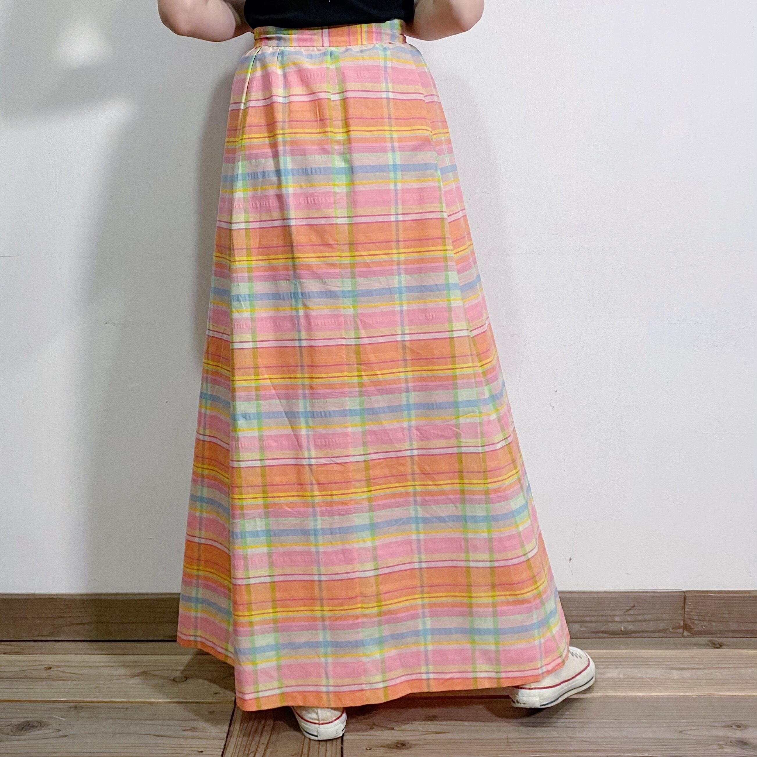 オレンジベースのカラフルなチェック柄がとっても可愛い、70年代のロングスカートです。